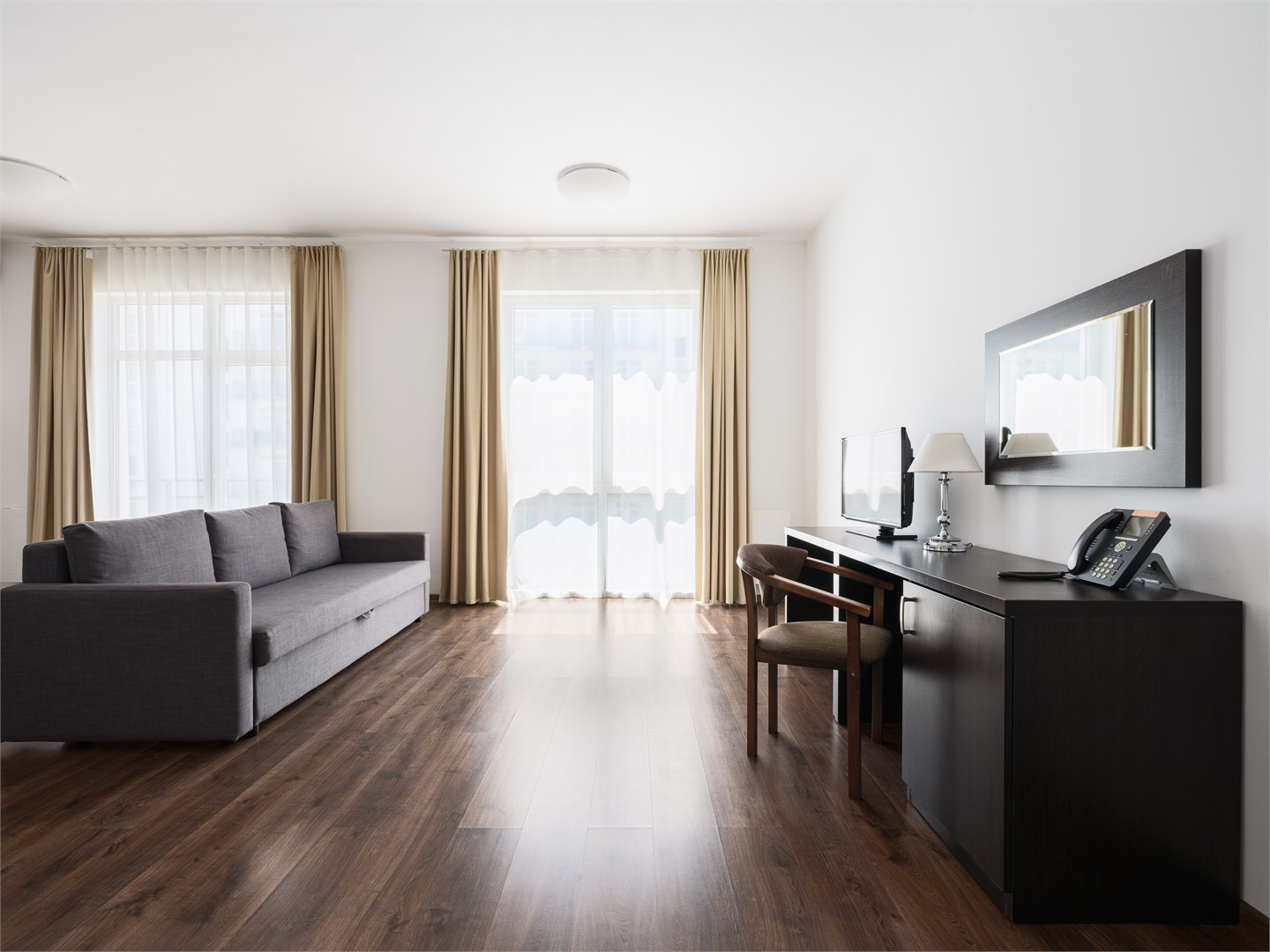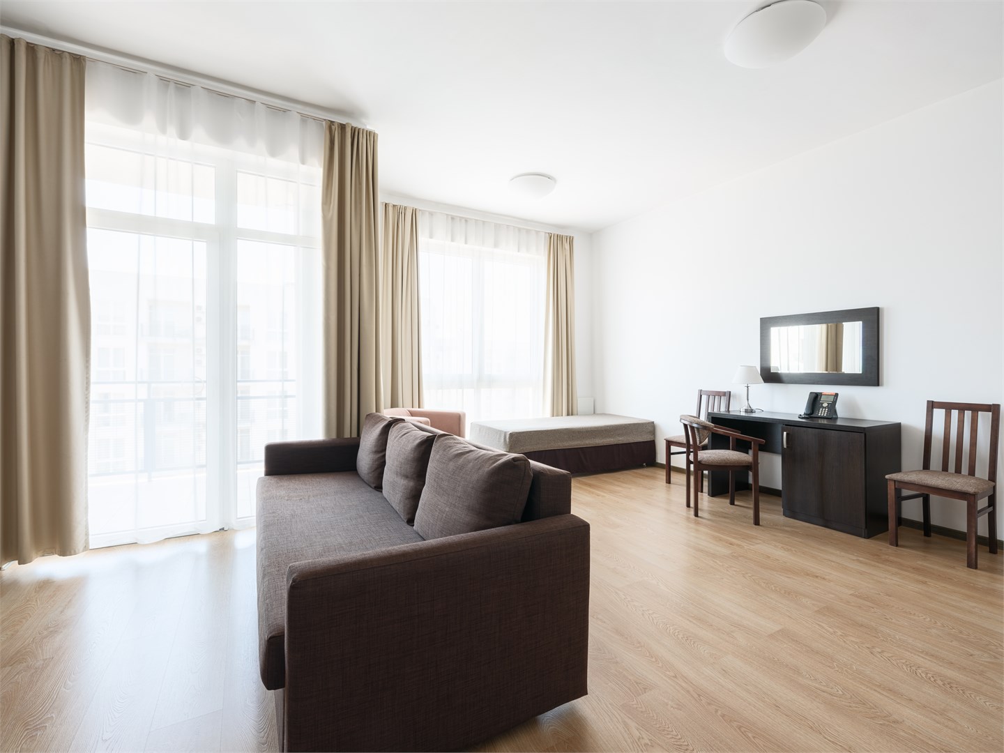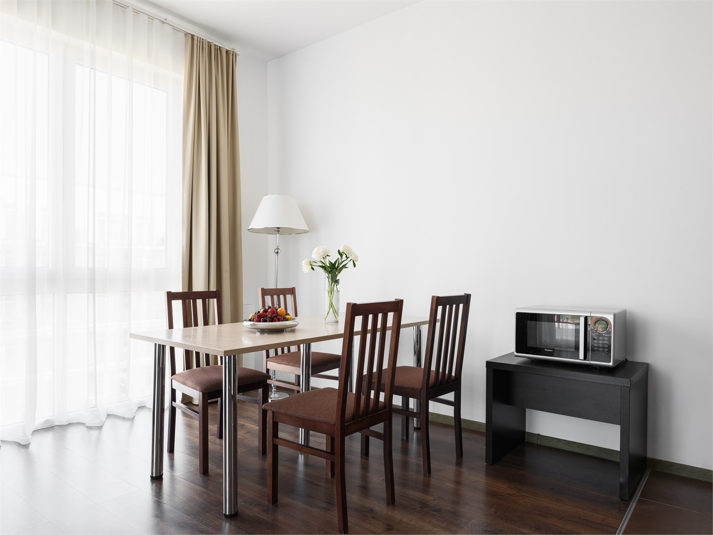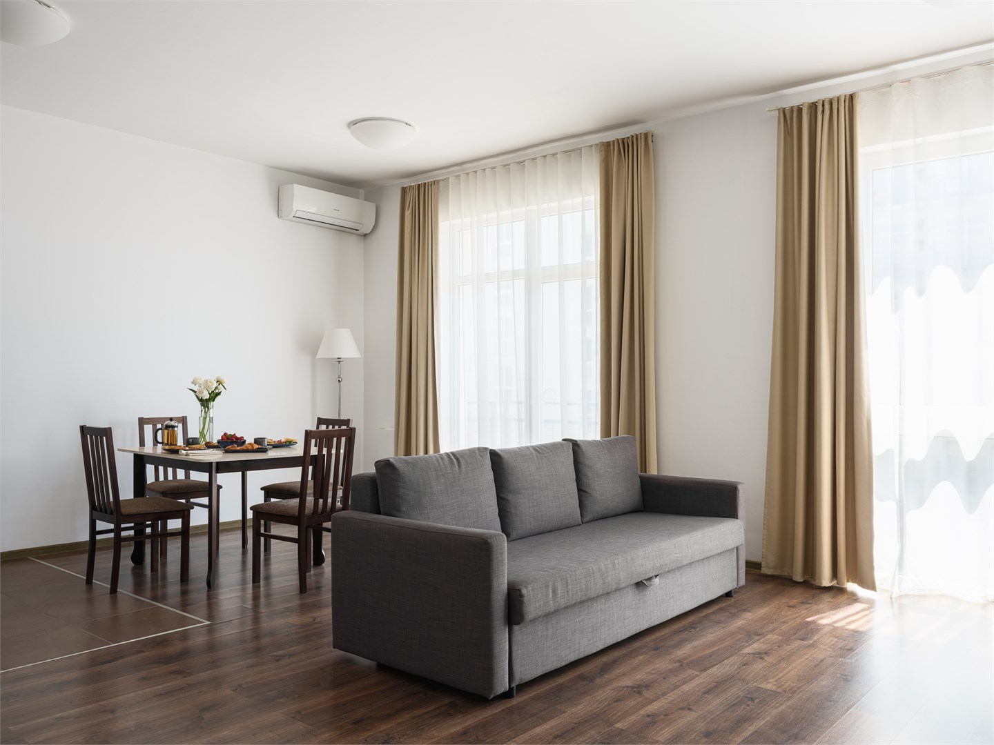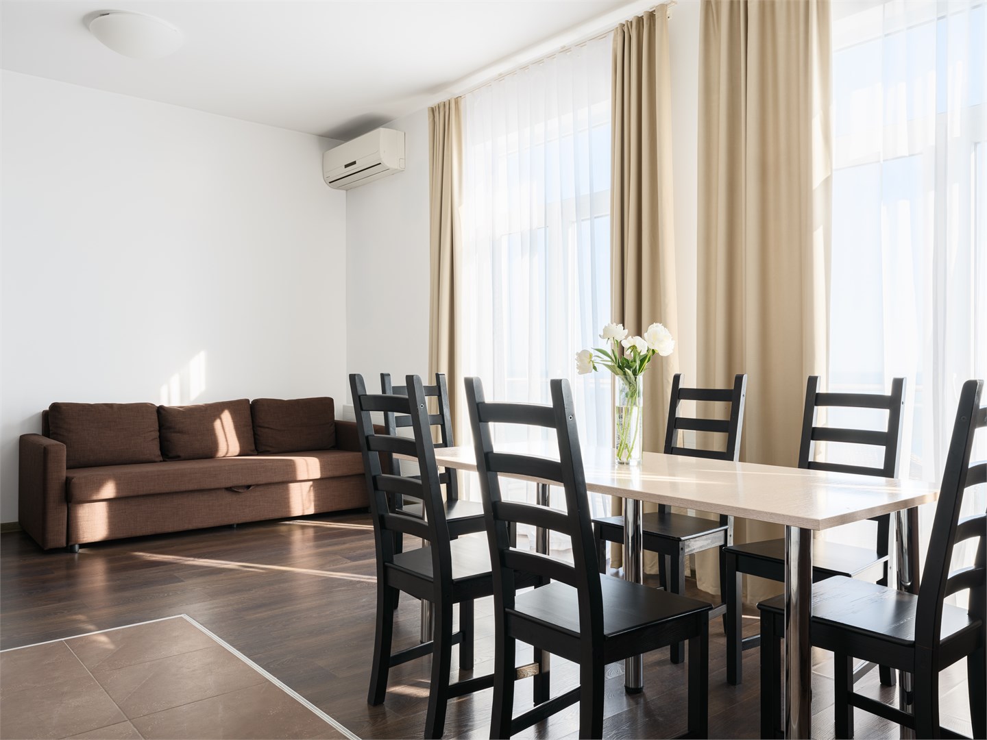 В номере: вешалка, диван раскладной, зеркало, кровать двуспальная, стол, стулья, шкаф, кондиционер, микроволновая печь, мини-холодильник, телевизор, телефон