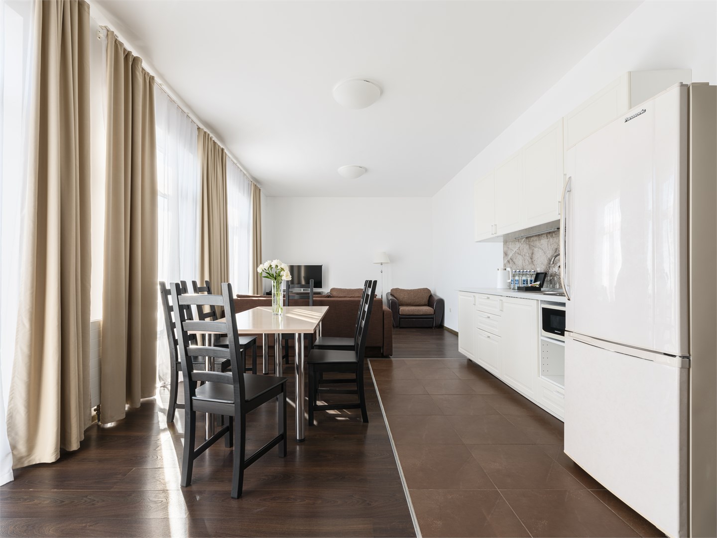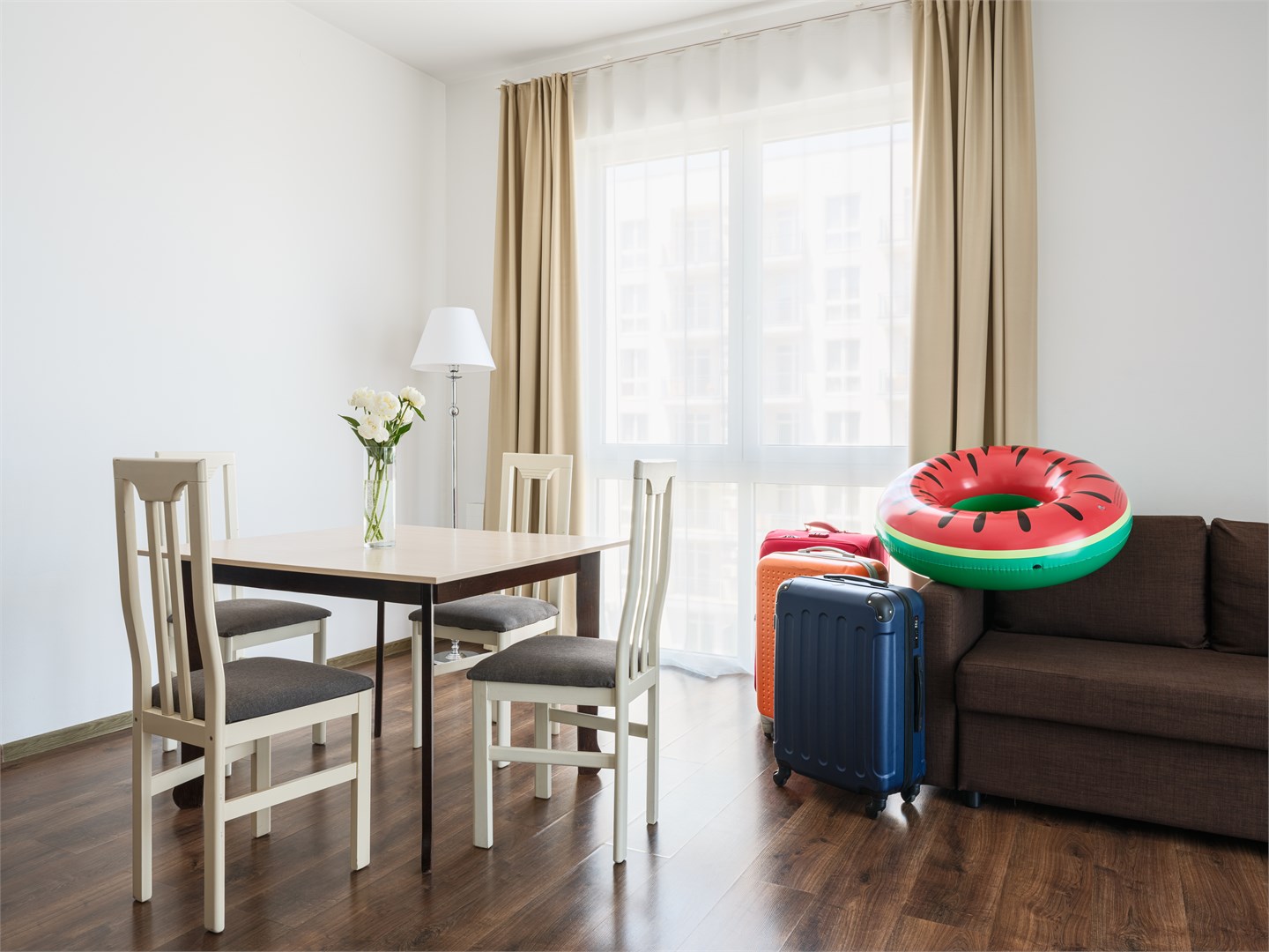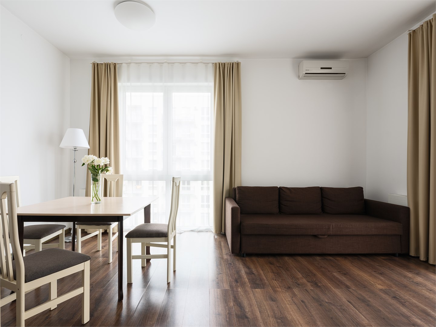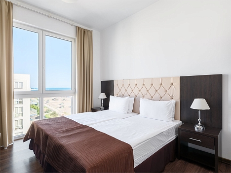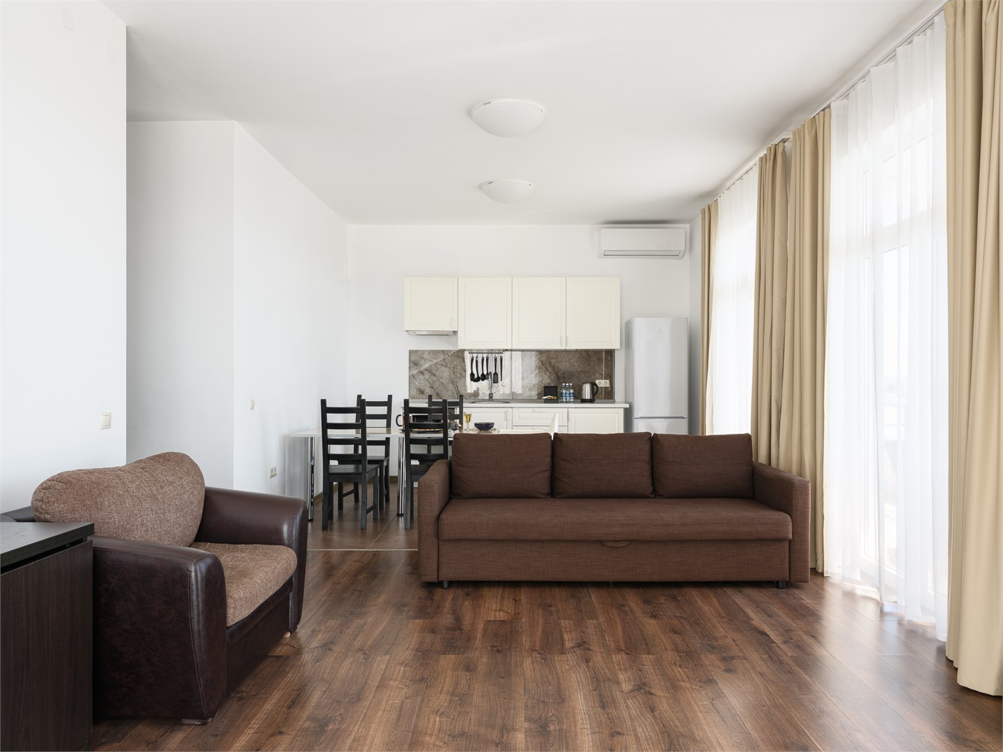 В номере: вешалка, диван раскладной, зеркало, кровать двуспальная, стол, стулья, шкаф, кондиционер, микроволновая печь, мини-холодильник, телевизор, телефон