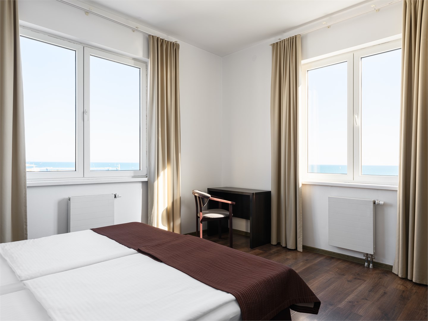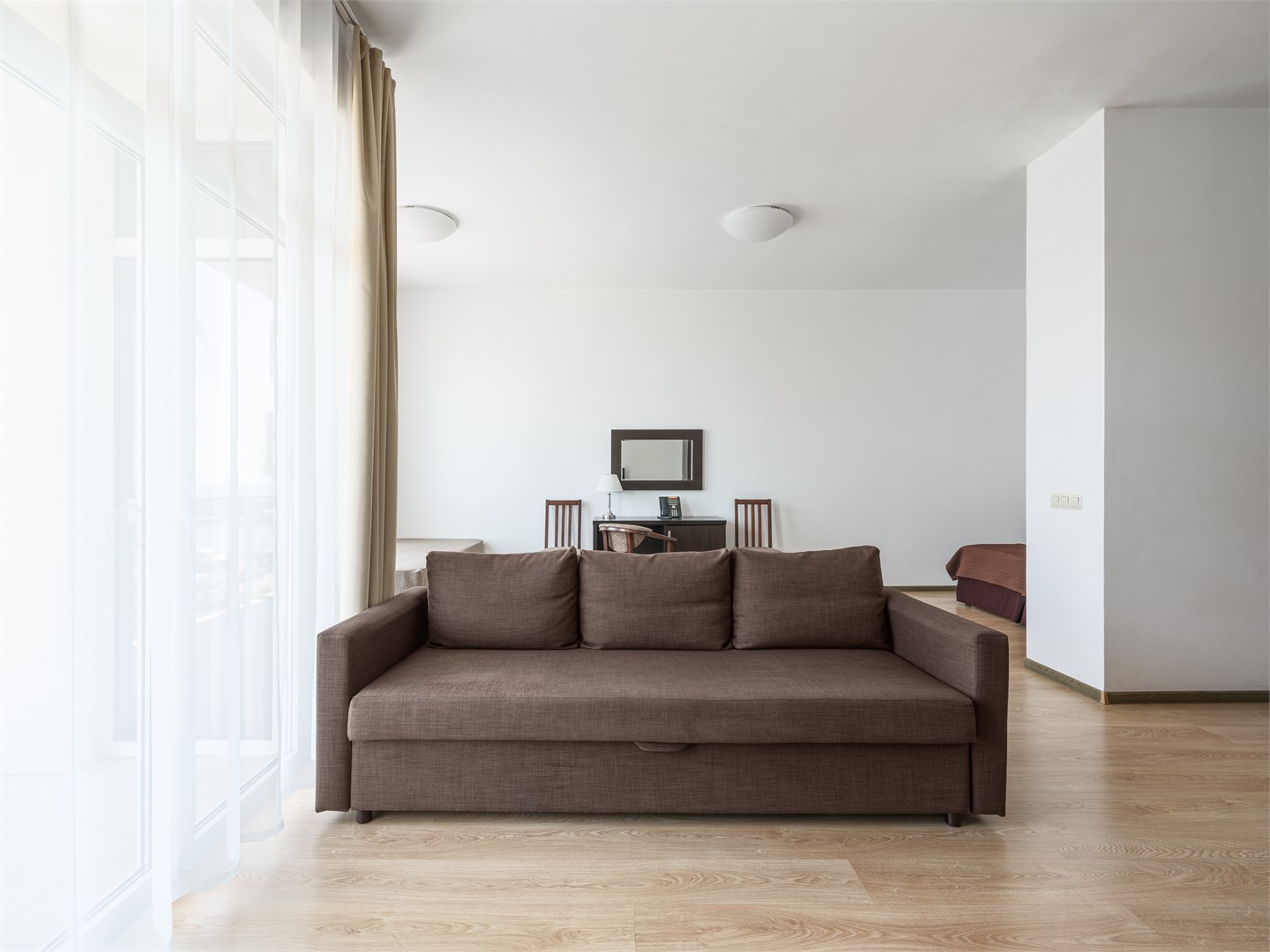 В номере: вешалка, диван раскладной, зеркало, кровать двуспальная, стол, стулья, шкаф, кондиционер, мини-холодильник, телевизор, телефон