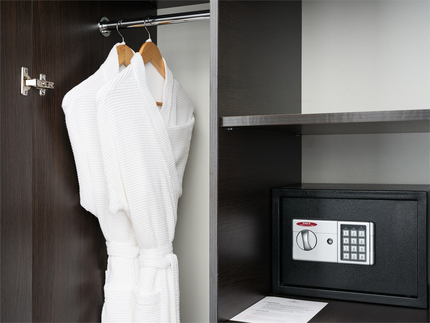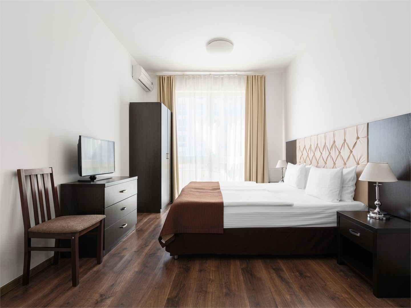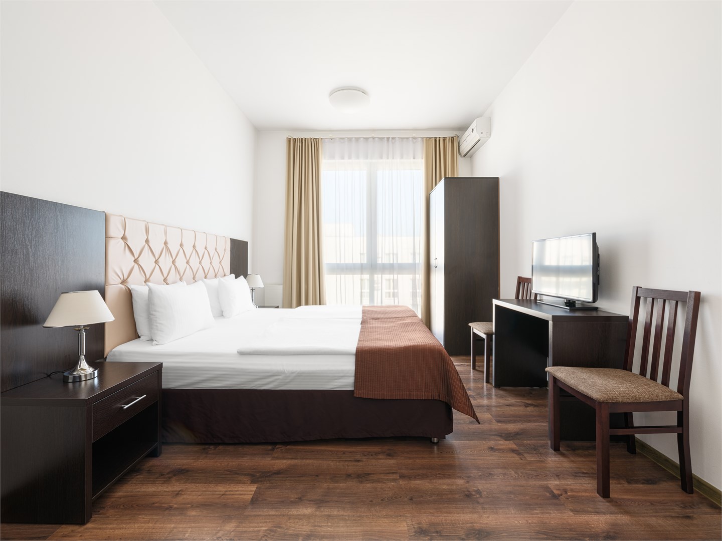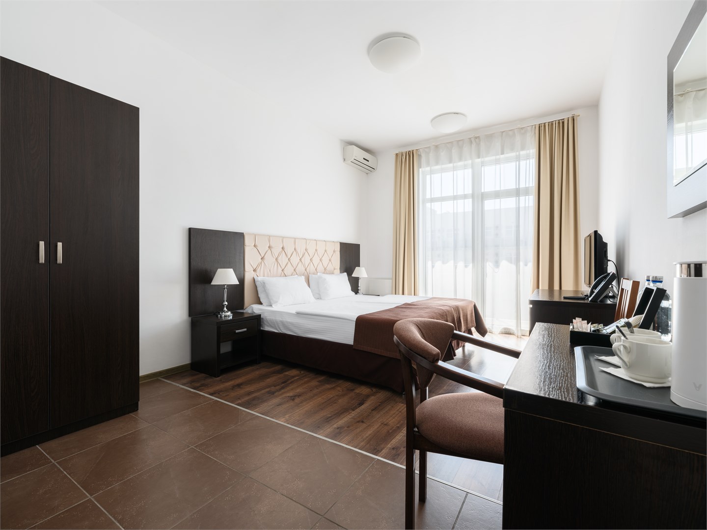 В номере: вешалка, зеркало, кровать двуспальная, столик туалетный, стул, шкаф, кондиционер, микроволновая печь, мини-холодильник, телевизор, телефон