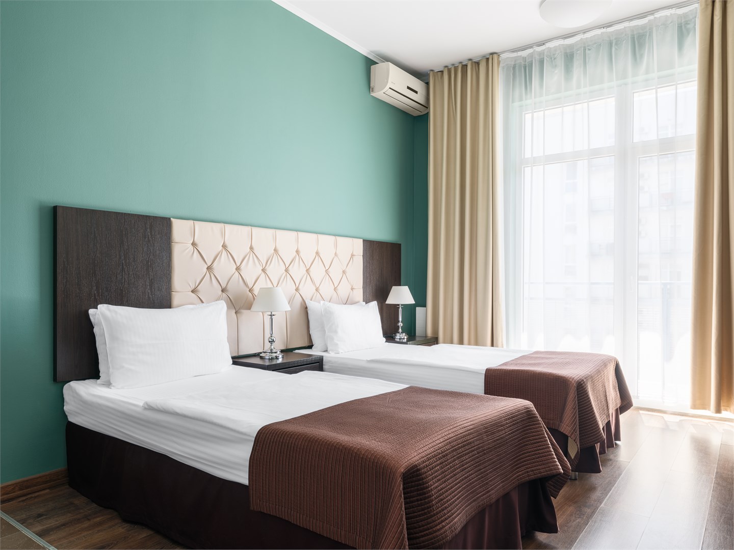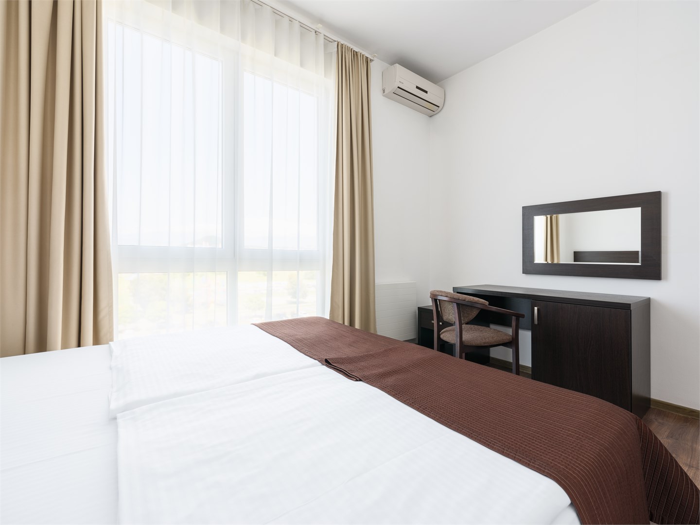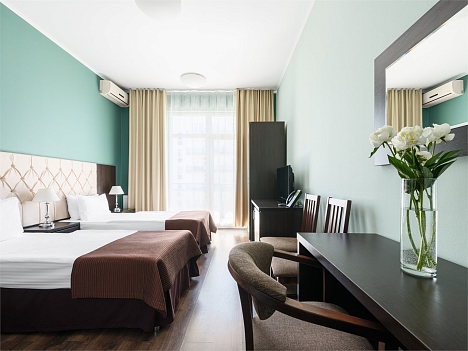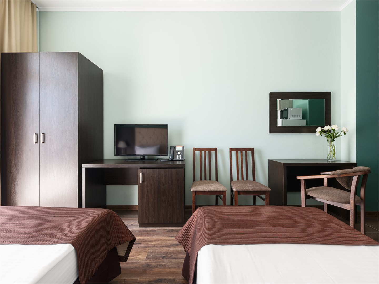В номере: вешалка, зеркало, кровати односпальные, стол, столик туалетный, шкаф, кондиционер, мини-холодильник, телевизор, телефон, утюг