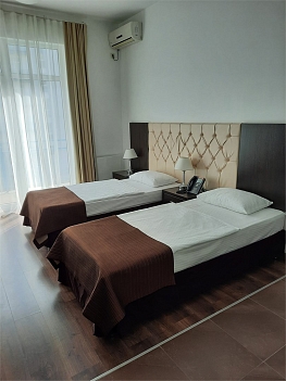 В номере: вешалка, зеркало, кресло, кровати односпальные, кровать двуспальная, стол, столик журнальный, стулья, шкаф, кондиционер, микроволновая печь, мини-холодильник, телевизор, телефон, утюг