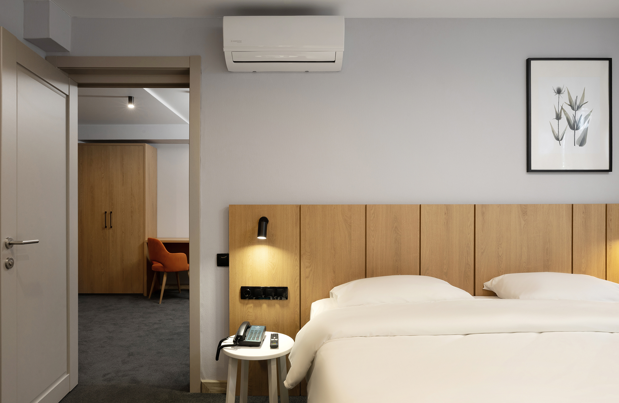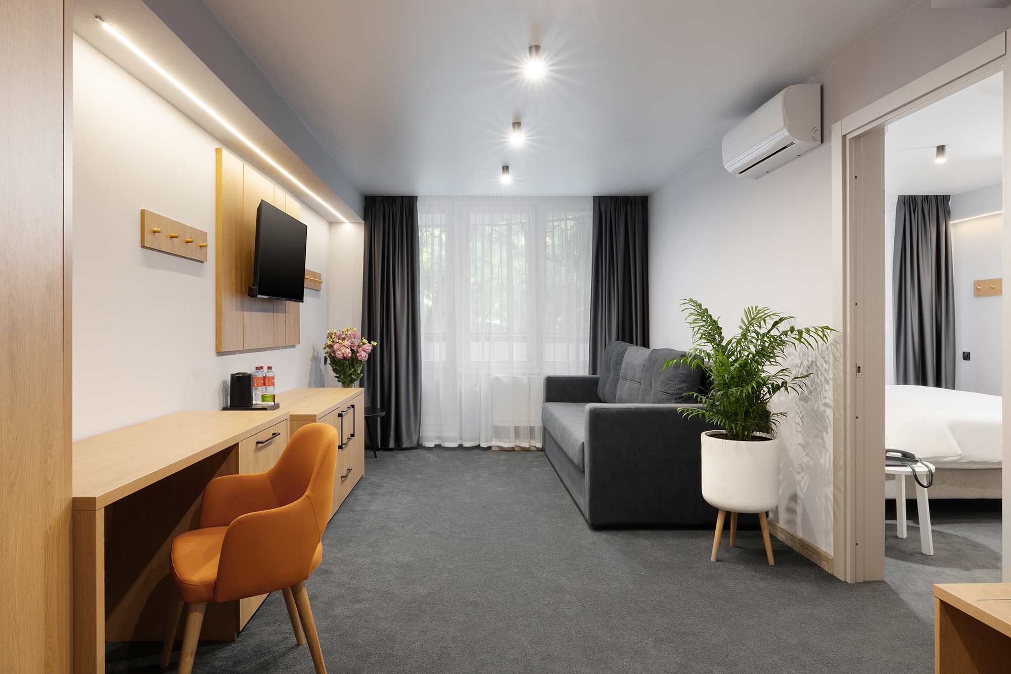 В номере: вешалка, диван раскладной, кровати односпальные /одна двуспальная кровать, прикроватные столики, стол, стулья, шкаф, кондиционер, сейф, телевизор ЖК, телефон, холодильник, чайная станция