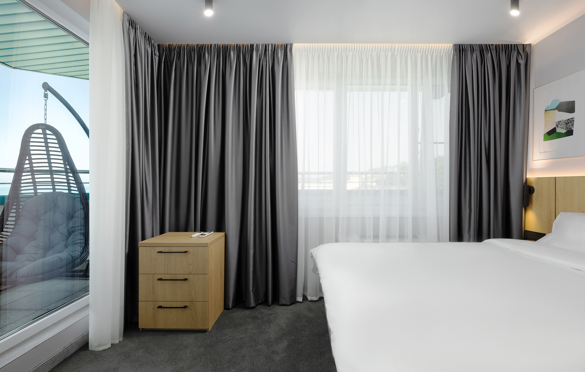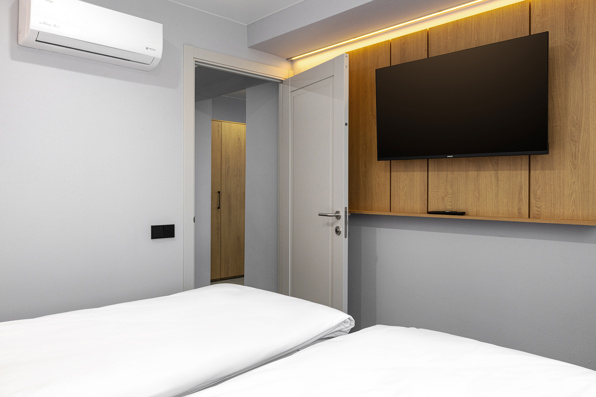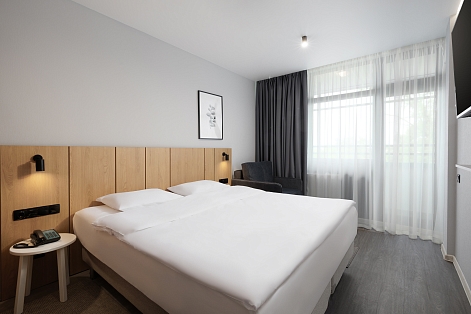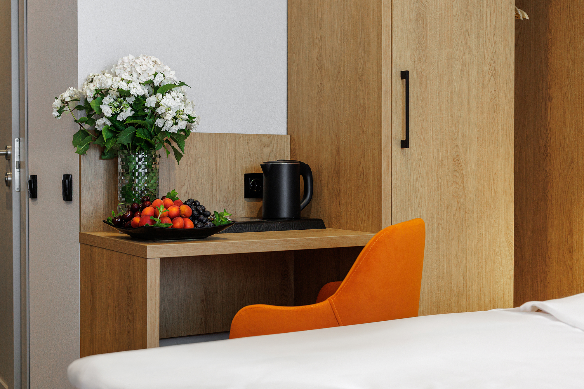 В номере: кресло-кровать, кровати односпальные /одна двуспальная кровать, прикроватные тумбочки, стол, стул, шкаф, сейф, телевизор, телефон, холодильник, центральная система охлаждения