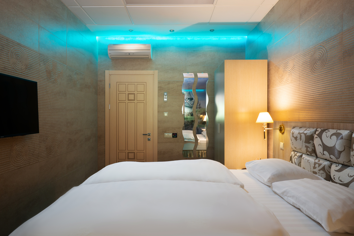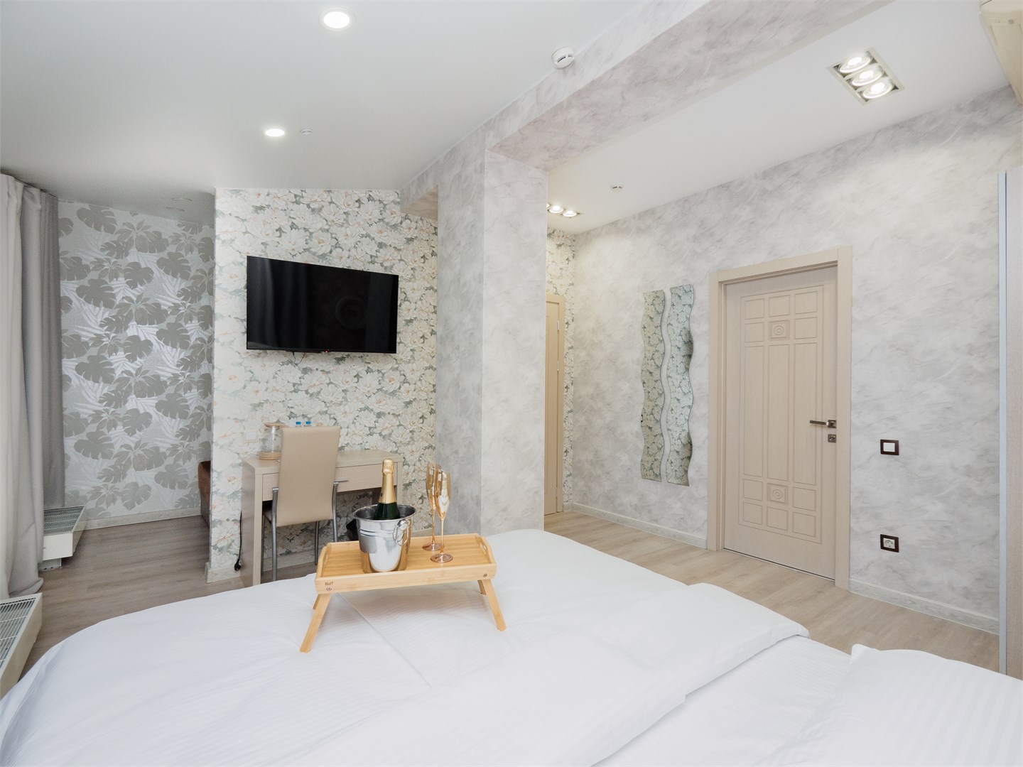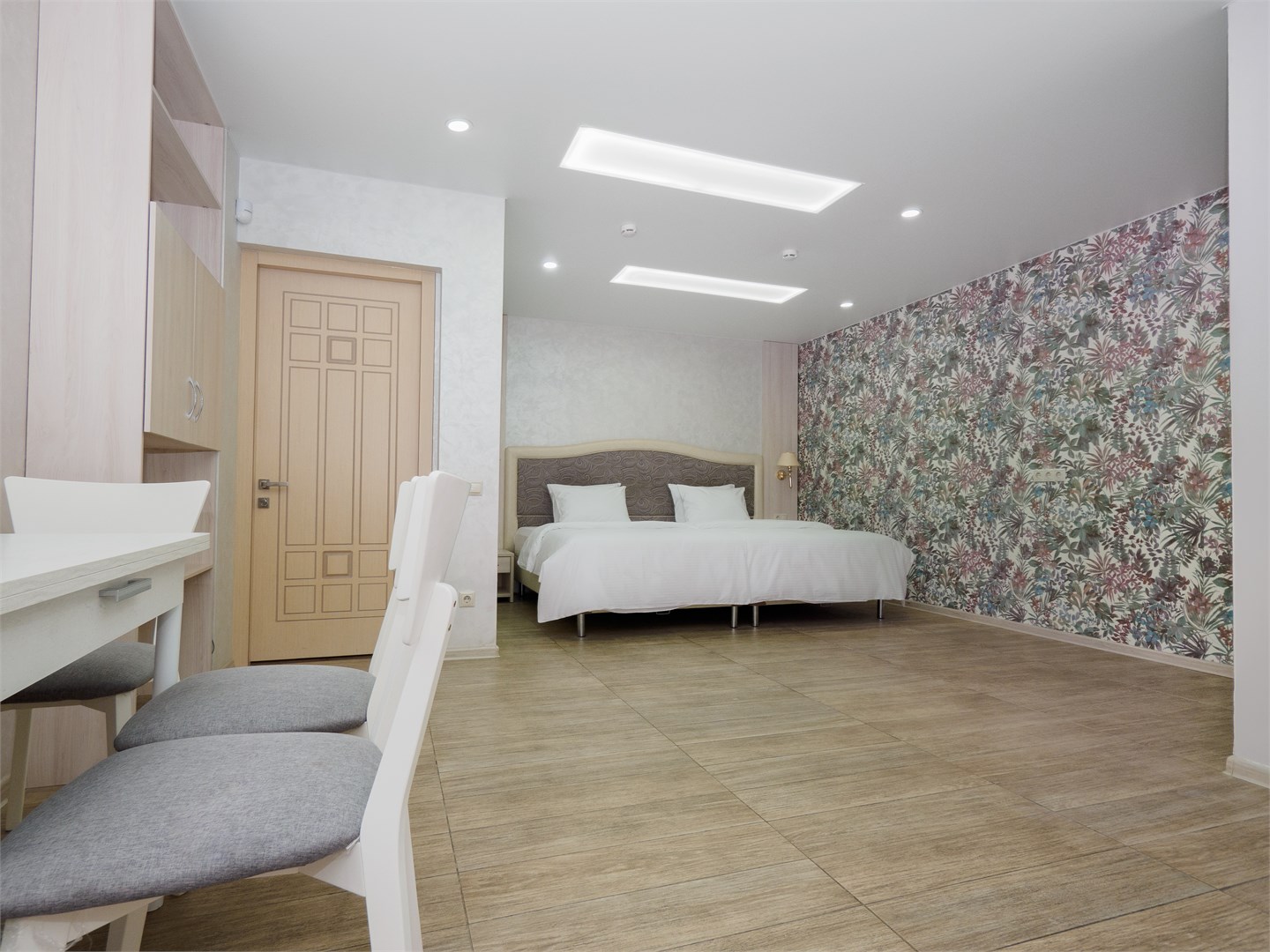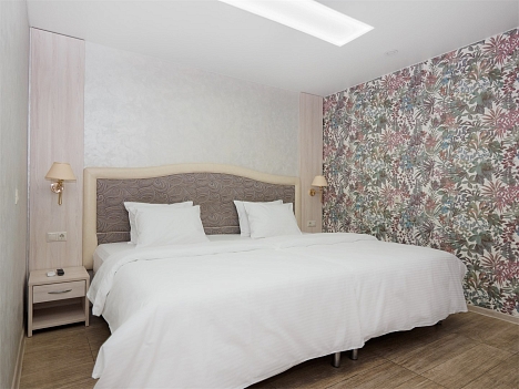 В номере: вешалка, зеркало, кровать двуспальная, стол, стулья, шкаф, мини-холодильник, сплит-система, телевизор, электрочайник