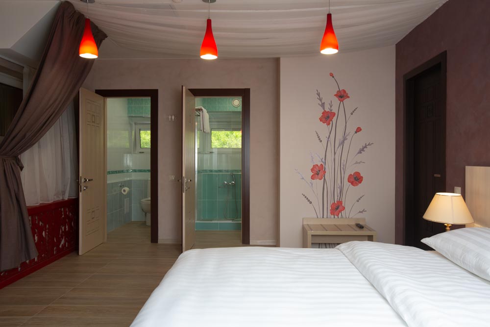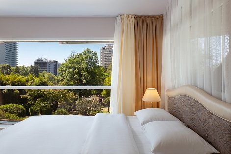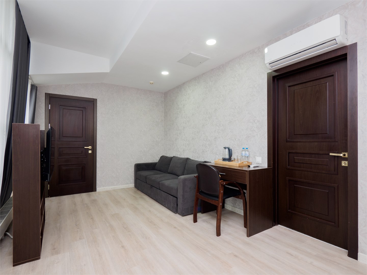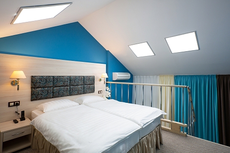 В номере: вешалка, диван раскладной, зеркало, кровать двуспальная, стол, стулья, шкаф, мини-холодильник, сплит-система, телевизор, чайный набор посуды, электрочайник
