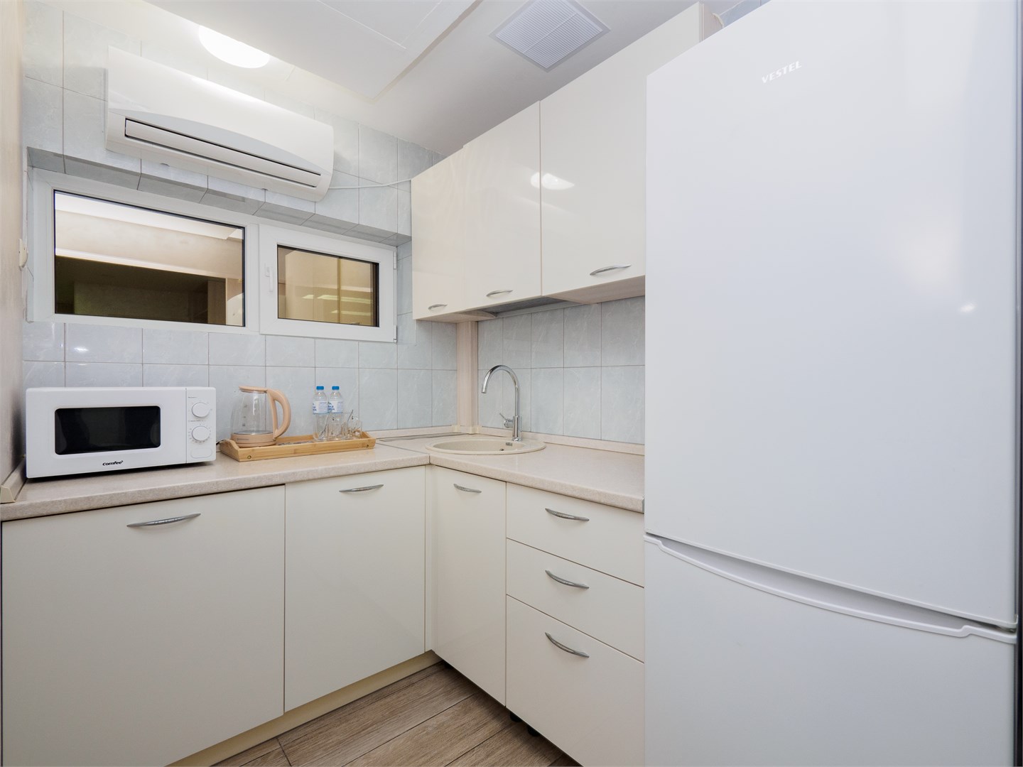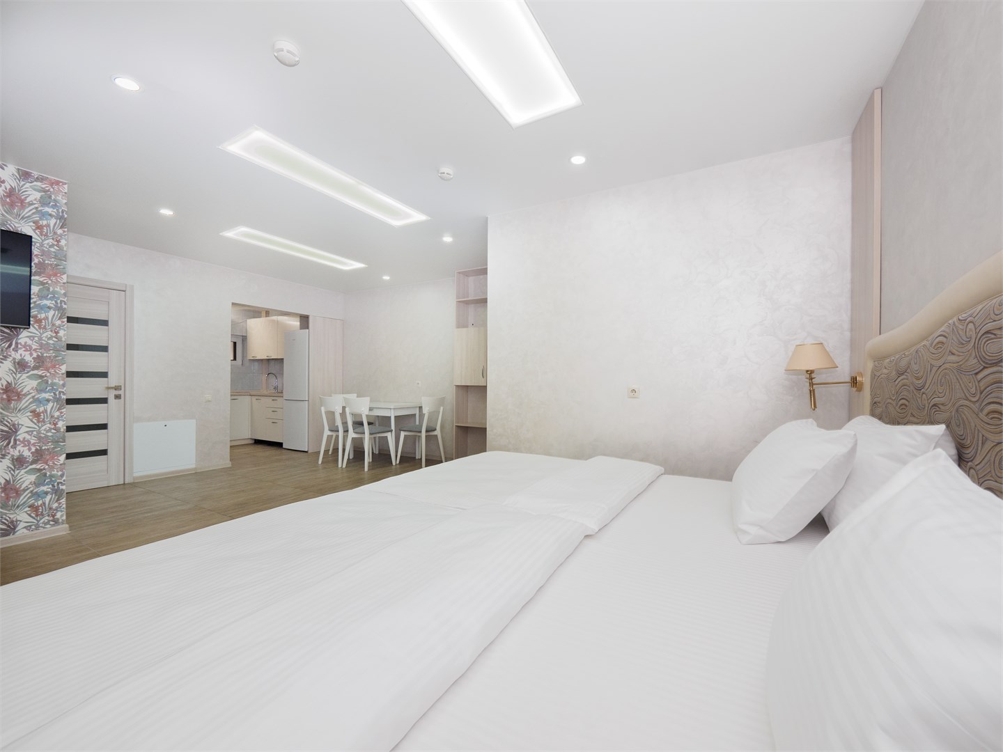 В номере: вешалка, диван раскладной, зеркало, кровать двуспальная, стол, стулья, шкаф, набор посуды, сплит-система, телевизор, холодильник, чайный набор посуды, электрочайник