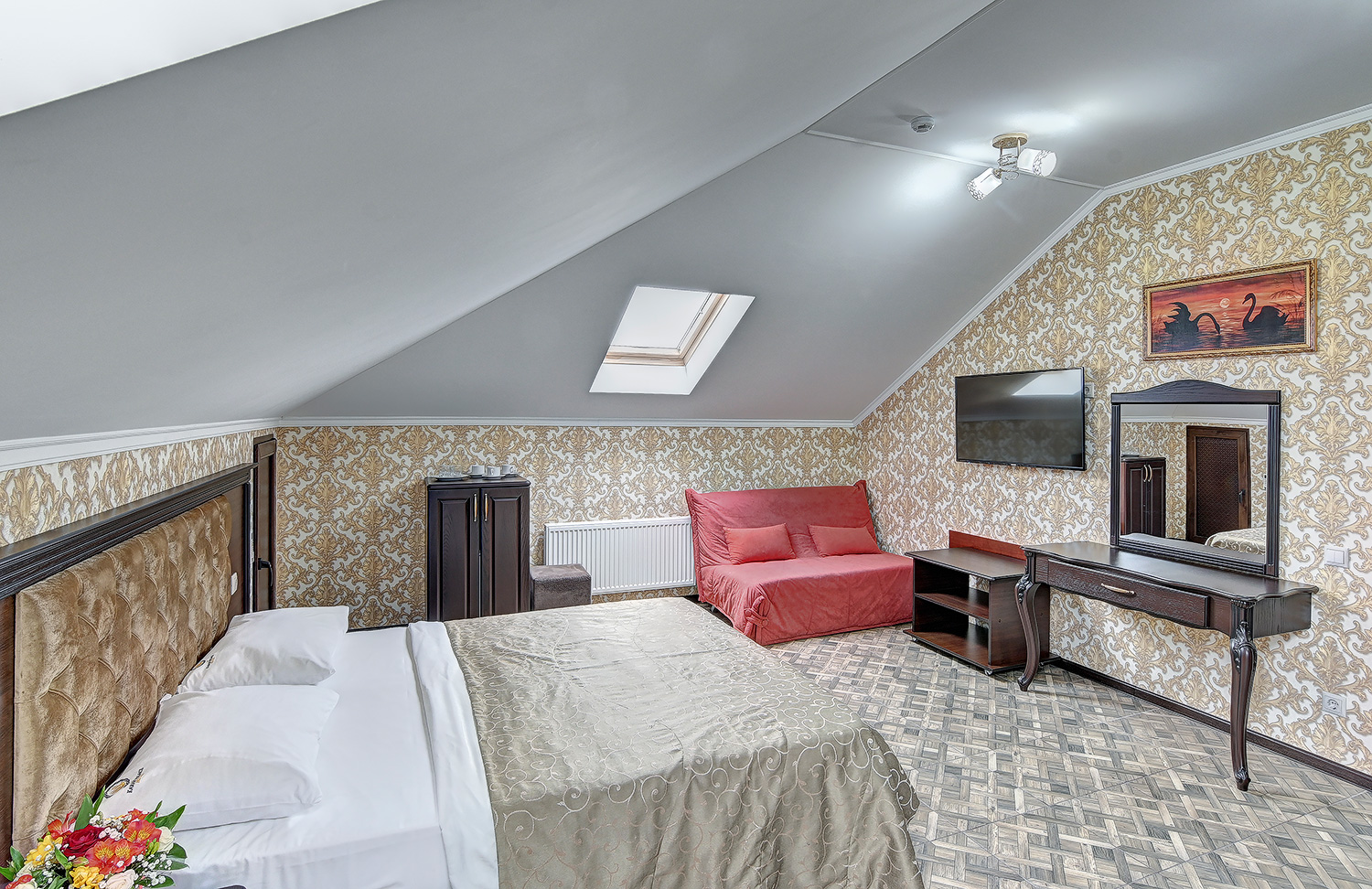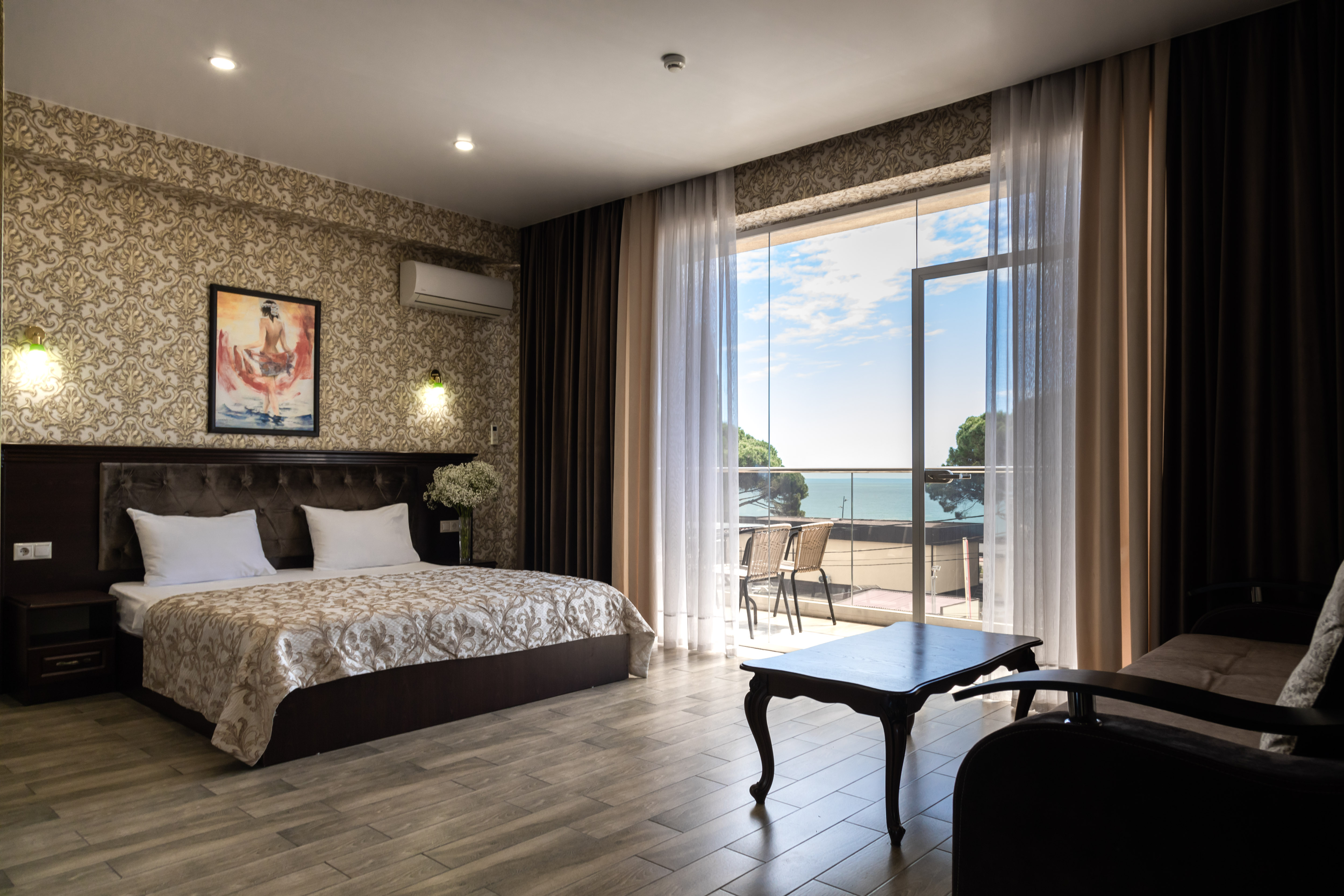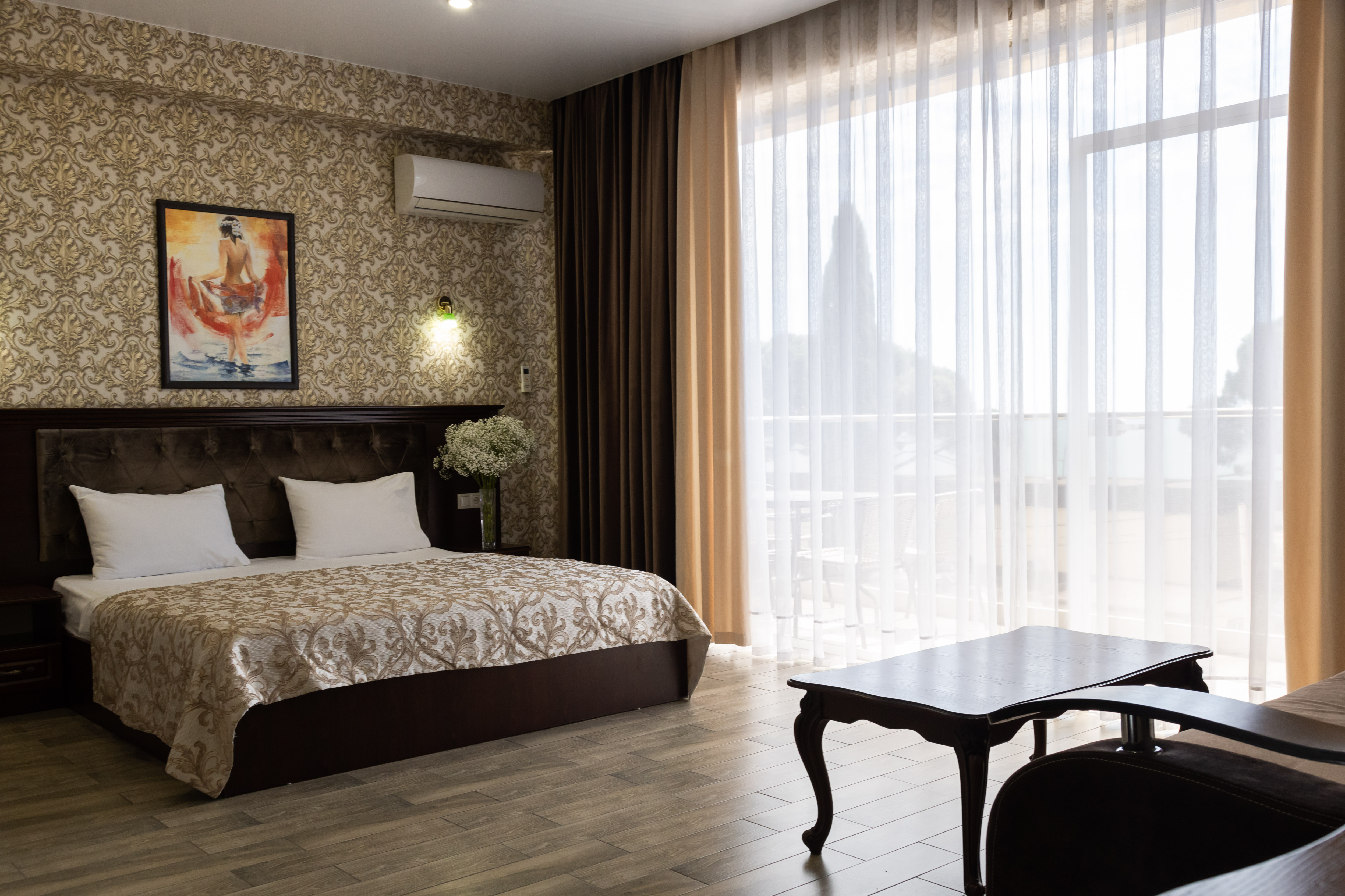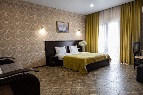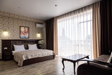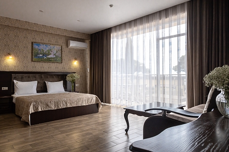 В номере: вешалка, диван раскладной, зеркало, кровать двуспальная, обувная полка, прикроватные тумбочки, стол, столик туалетный, стул, шкаф, кондиционер, мини-холодильник, набор посуды, телевизор ЖК
