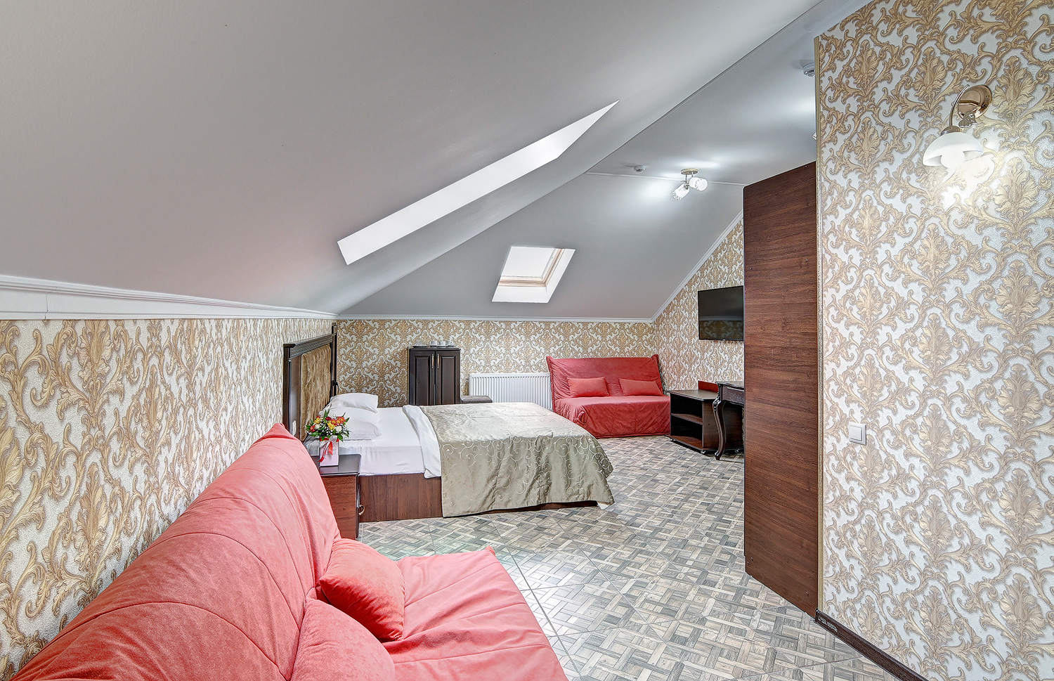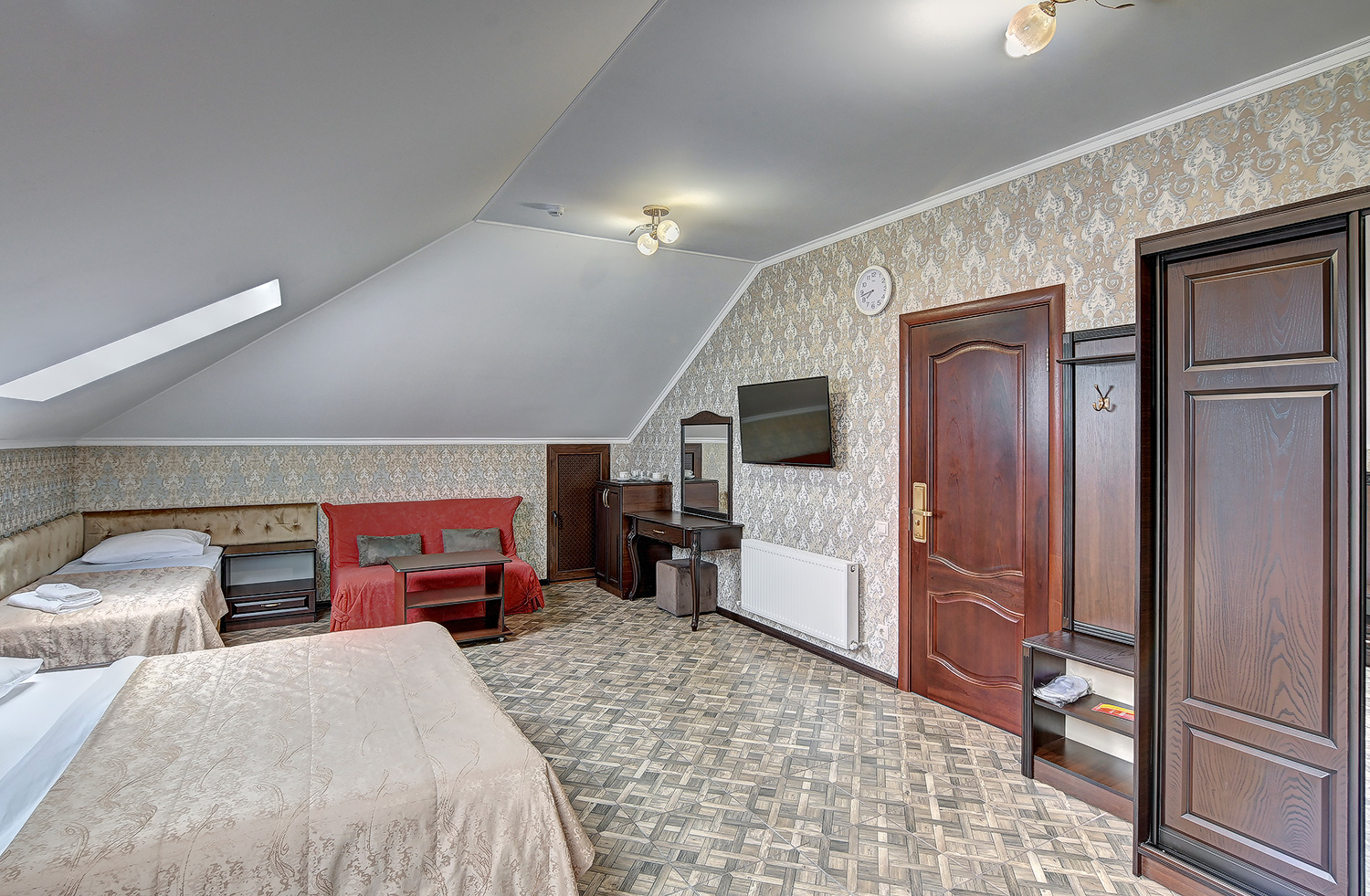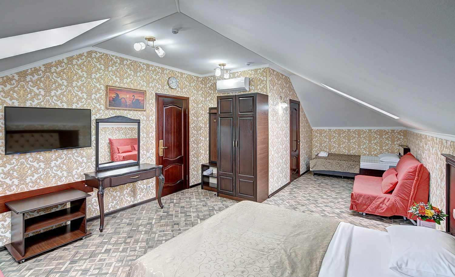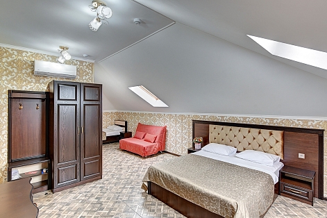 В номере: вешалка, диван раскладной, зеркало, кровать двуспальная, кровать односпальная, обувная полка, прикроватные тумбочки, стол, столик туалетный, шкаф, кондиционер, мини-холодильник, набор посуды, телевизор ЖК
