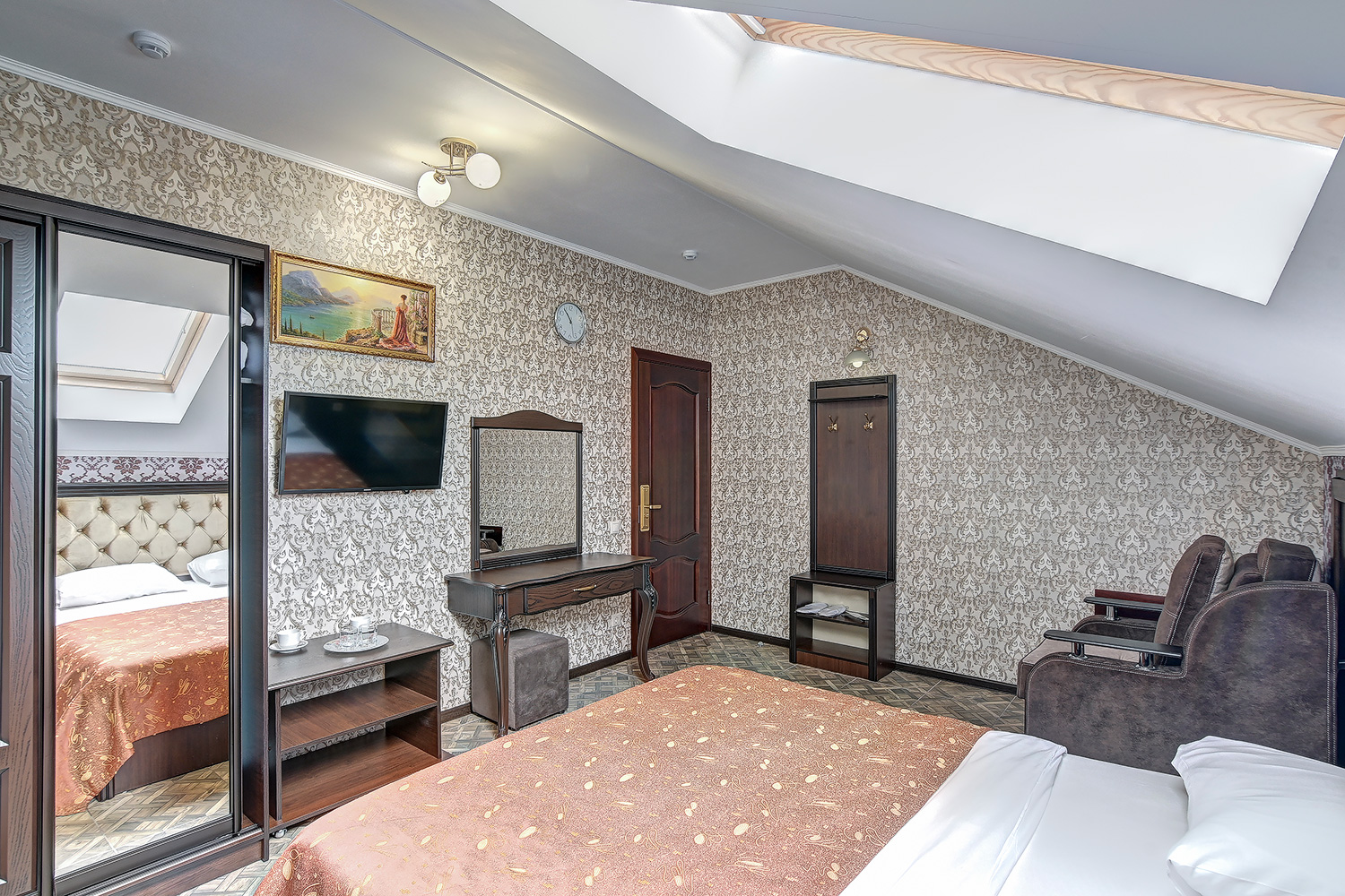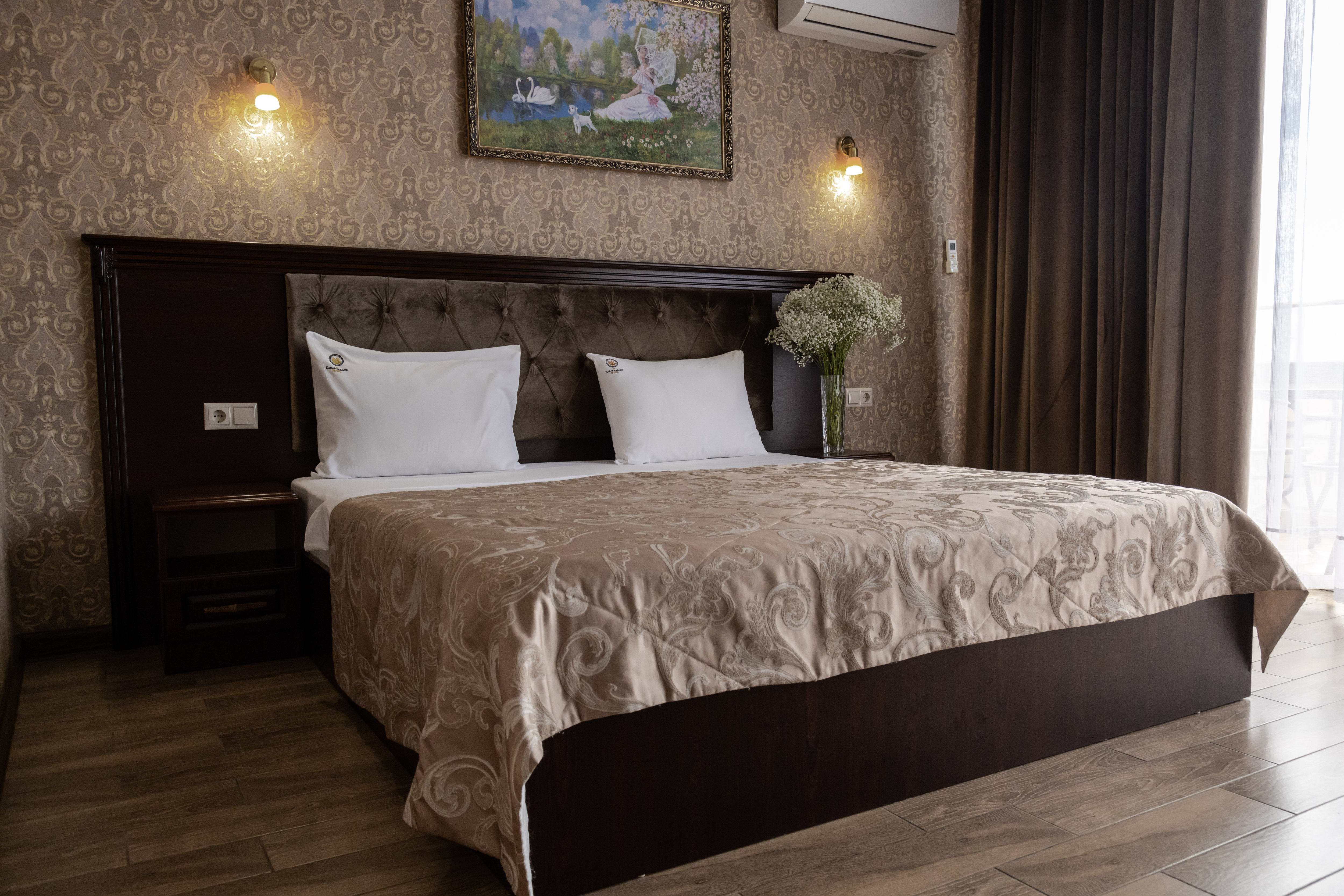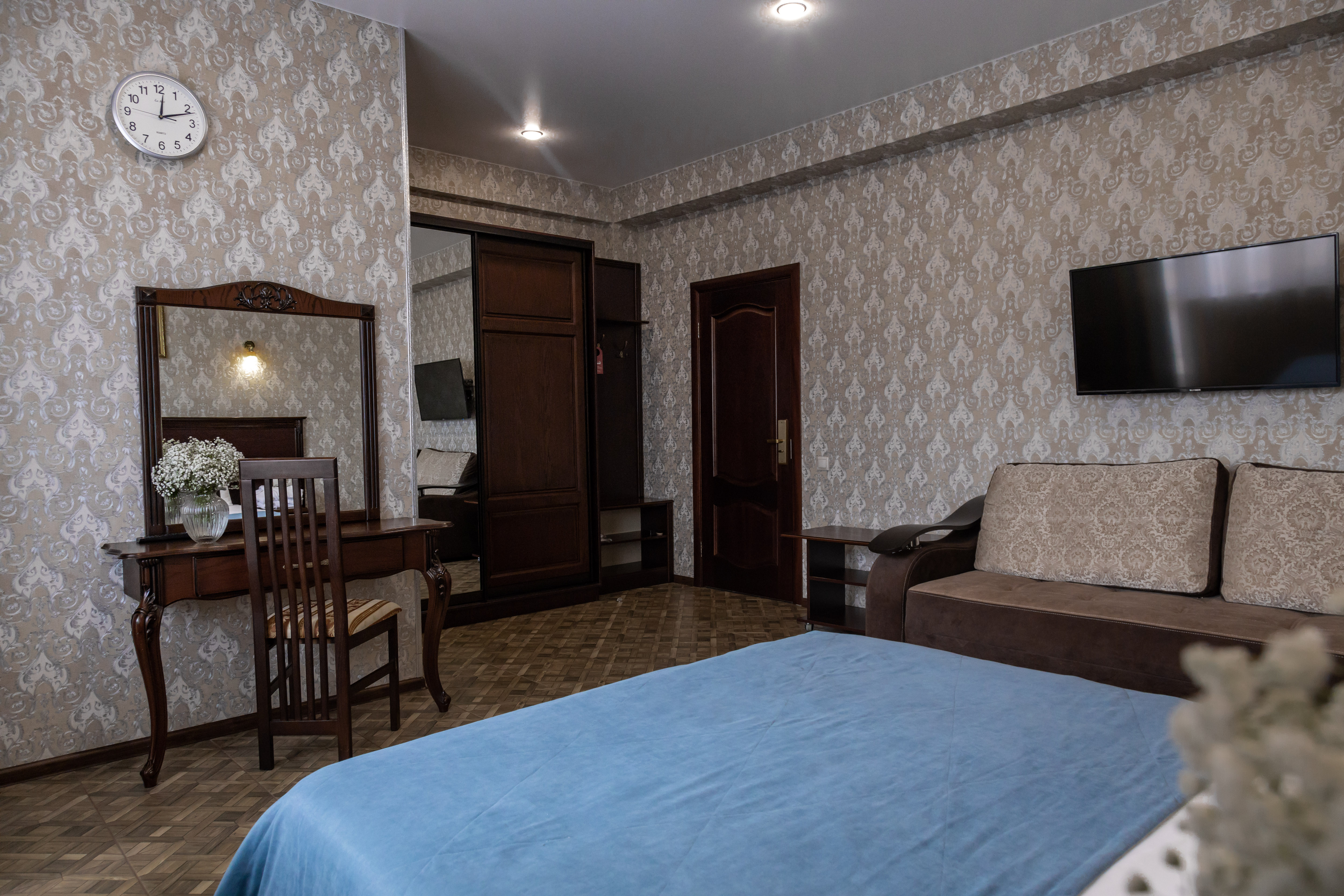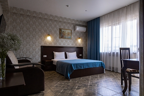 В номере: вешалка, зеркало, кровать двуспальная, обувная полка, прикроватные тумбочки, столик туалетный, шкаф, кондиционер, мини-холодильник, телевизор ЖК
