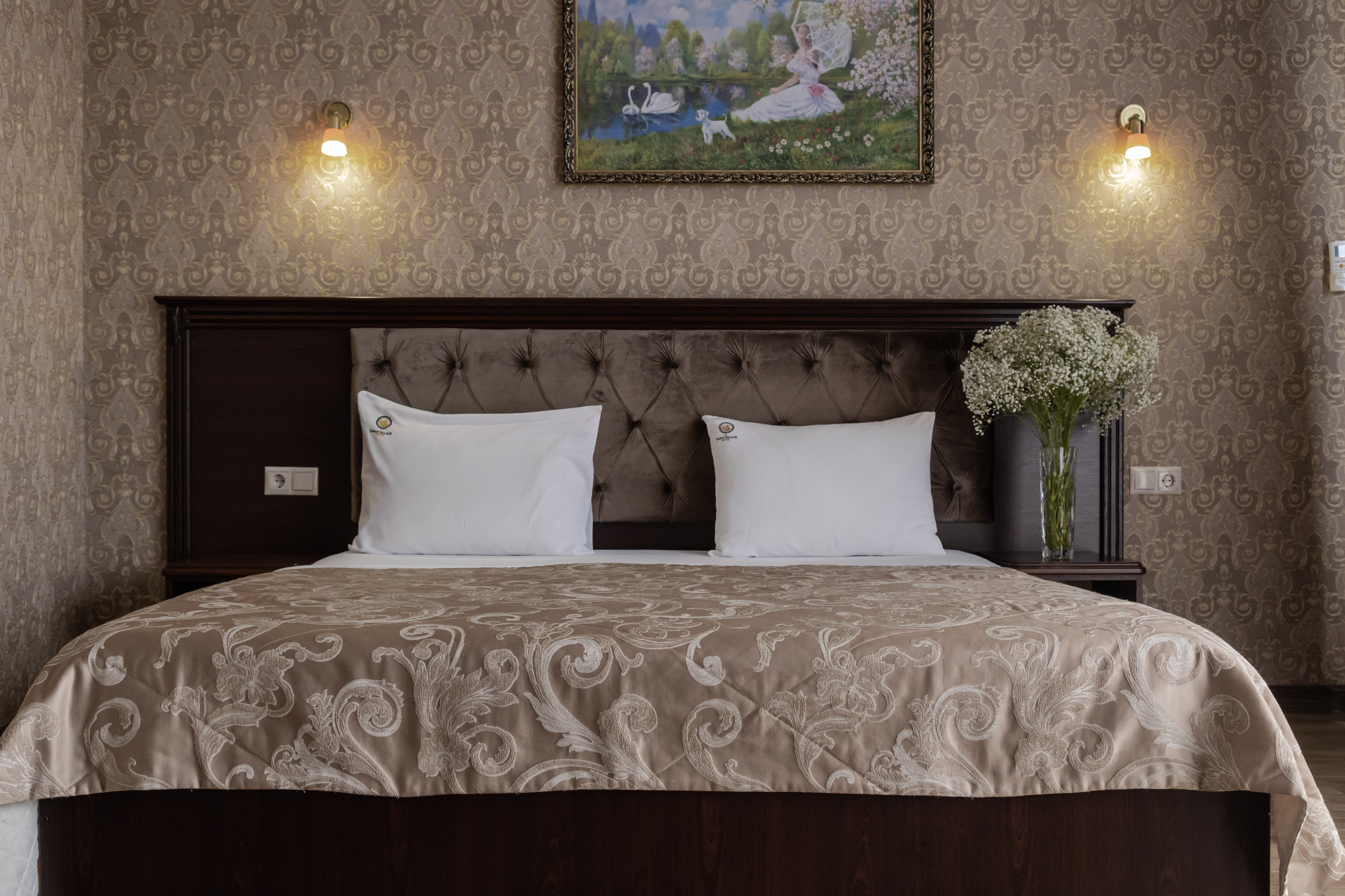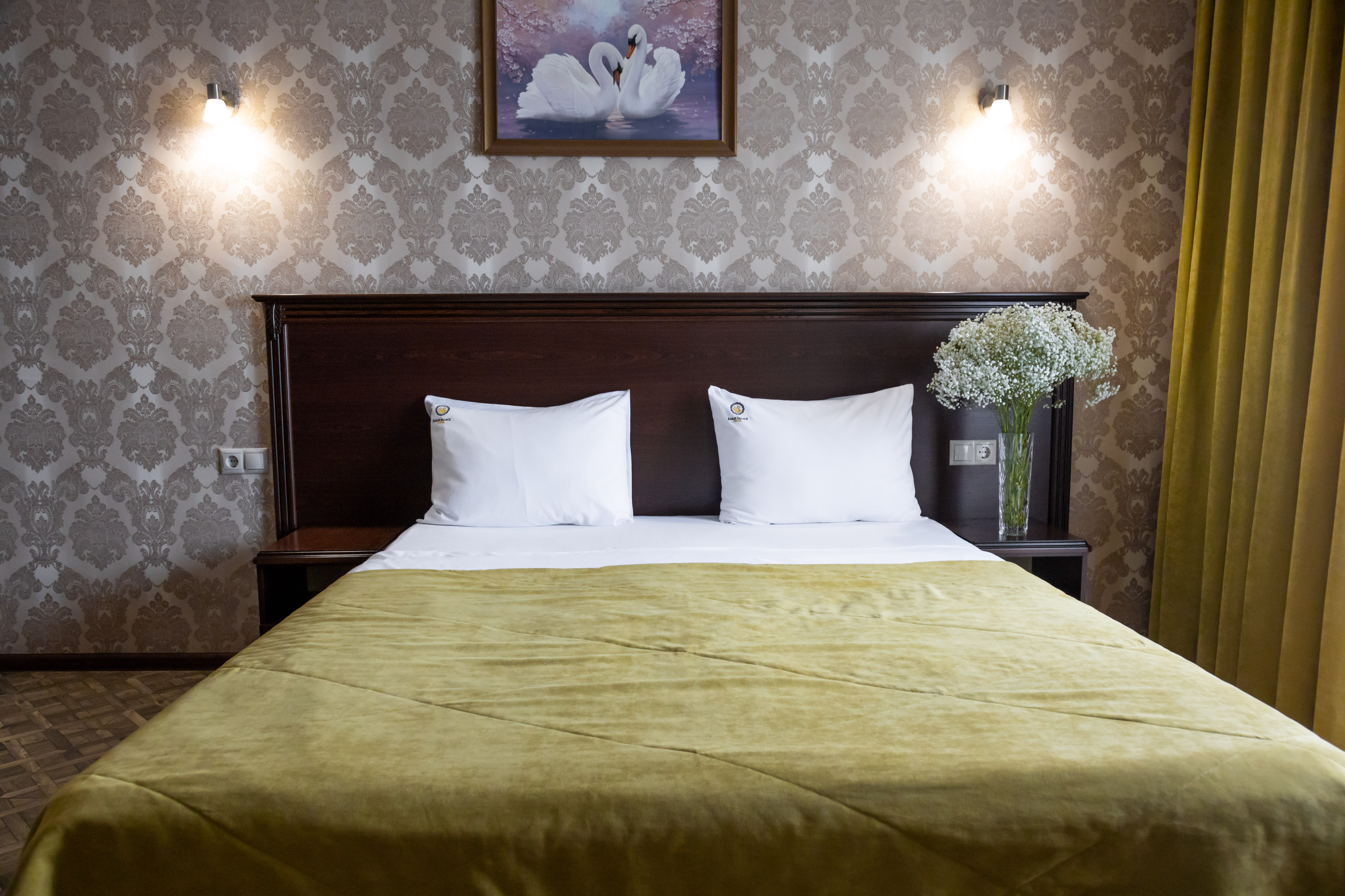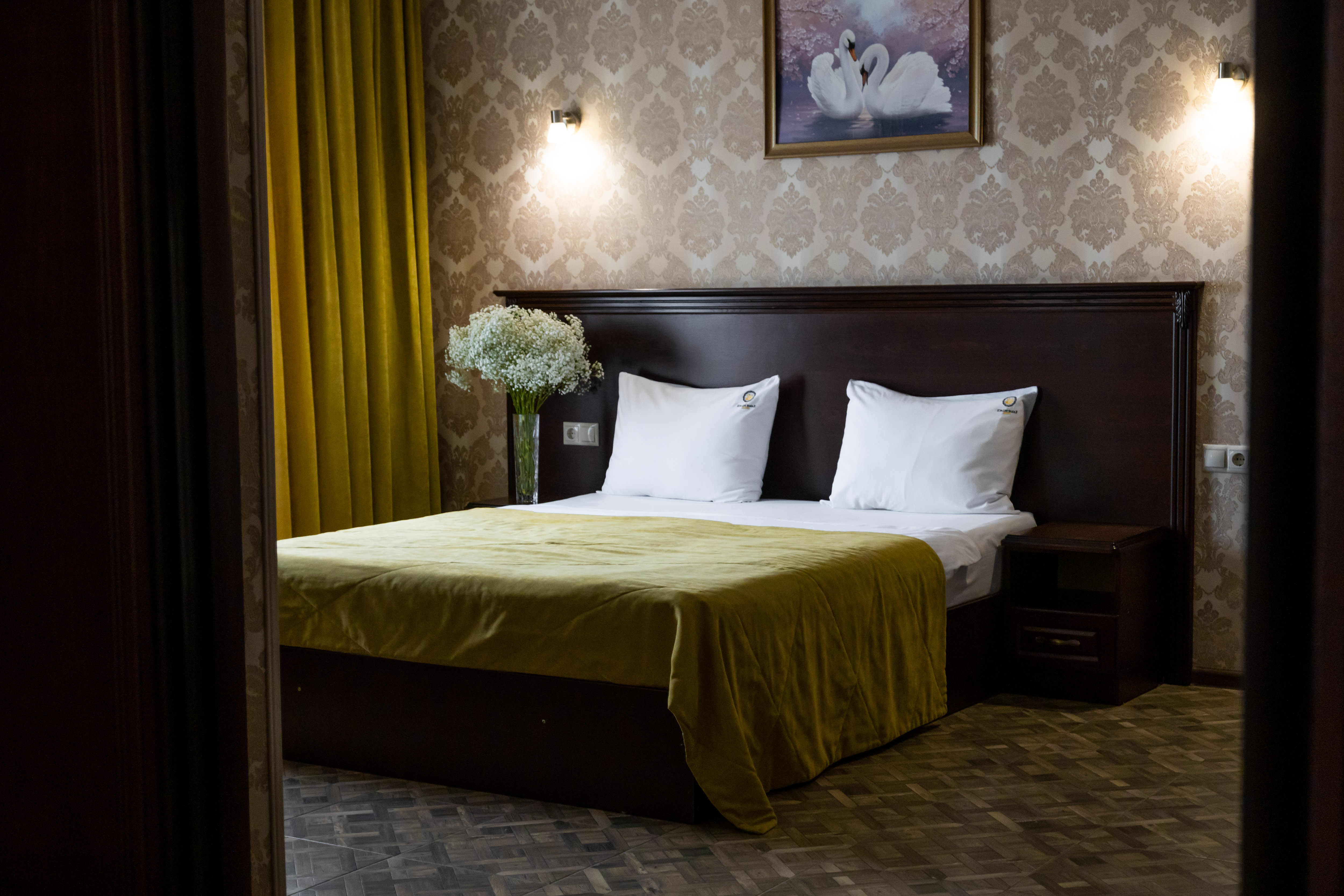 В номере: вешалка, зеркало, кровать двуспальная, обувная полка, прикроватные тумбочки, столик туалетный, шкаф, кондиционер, мини-холодильник, телевизор ЖК