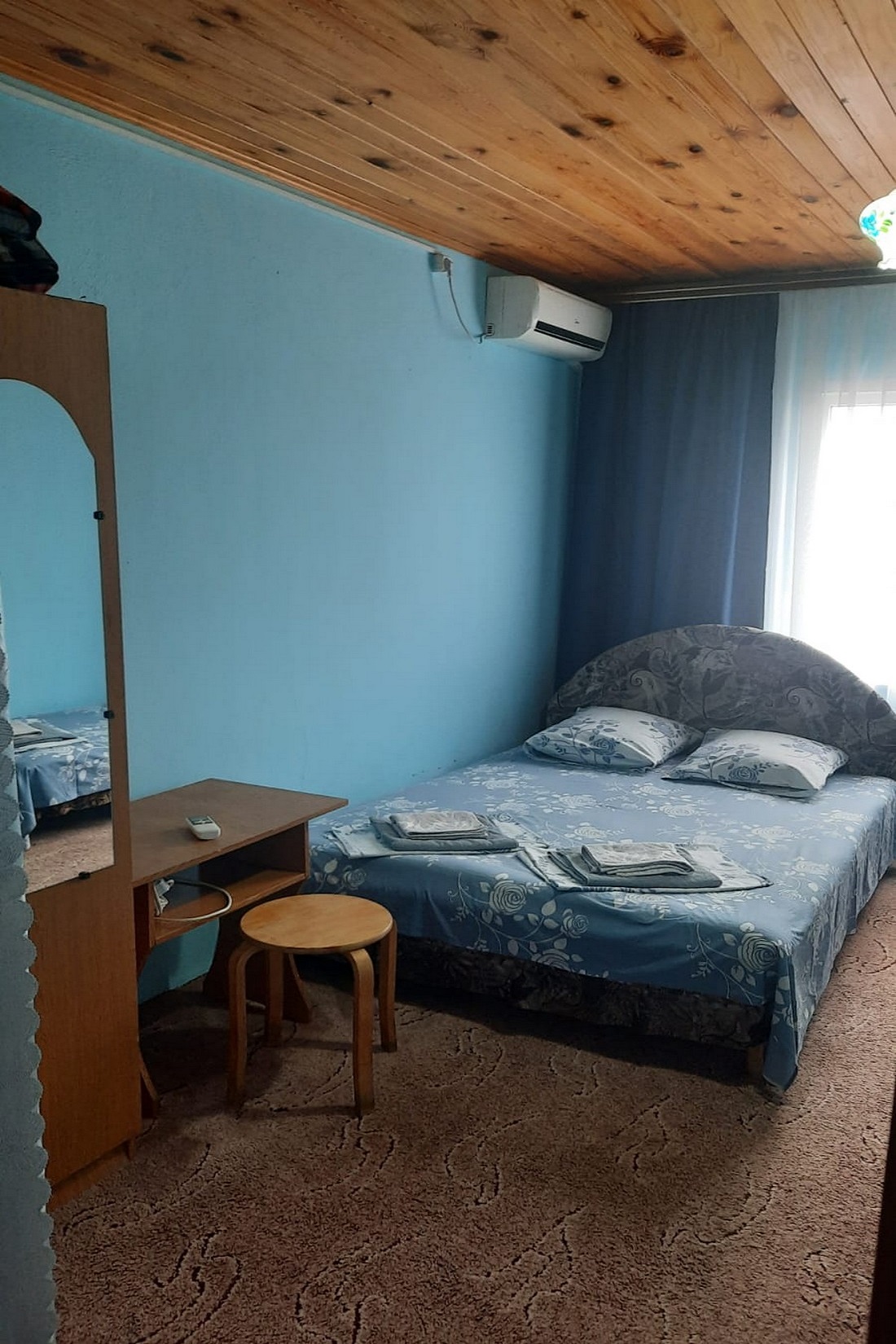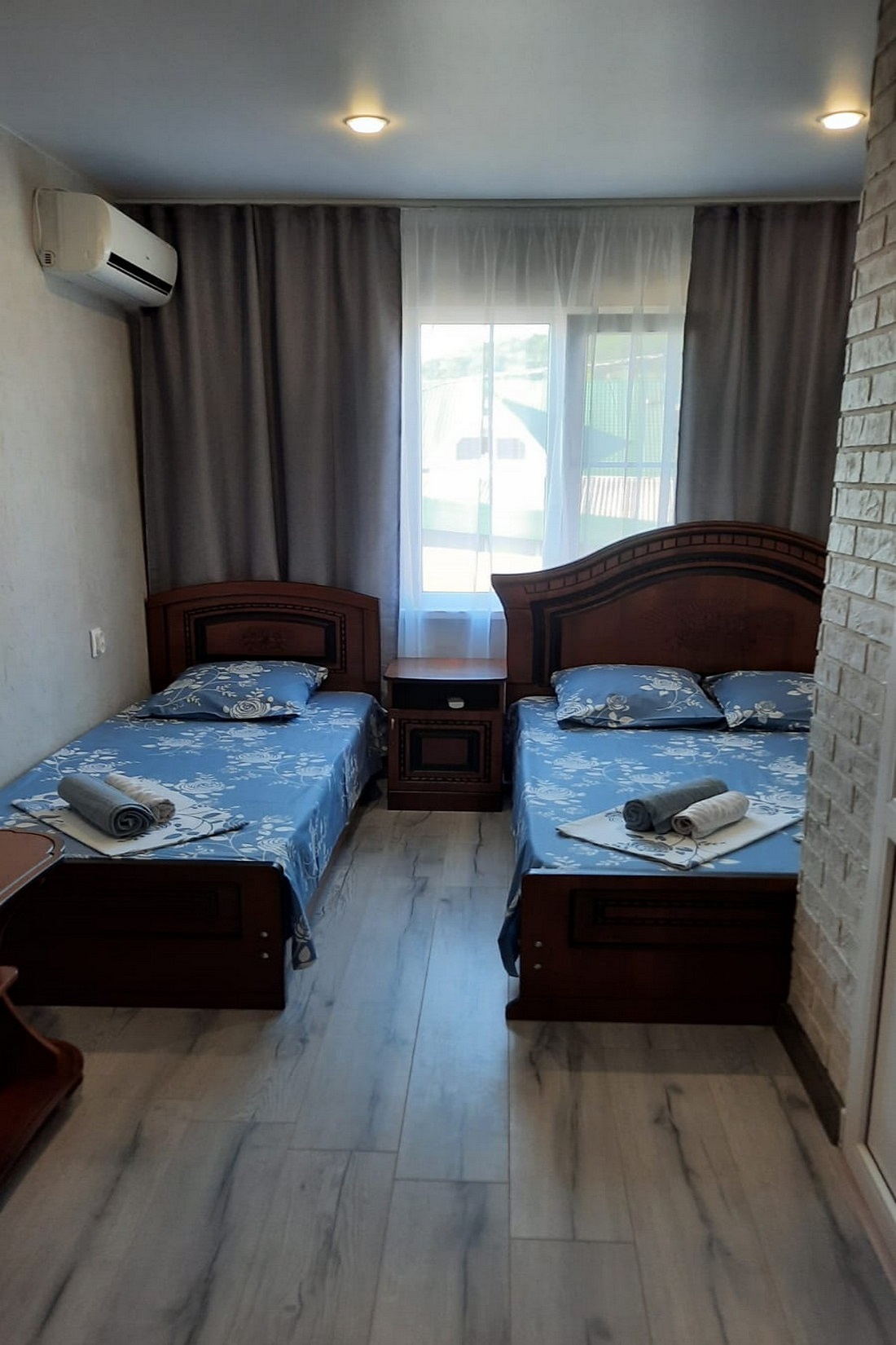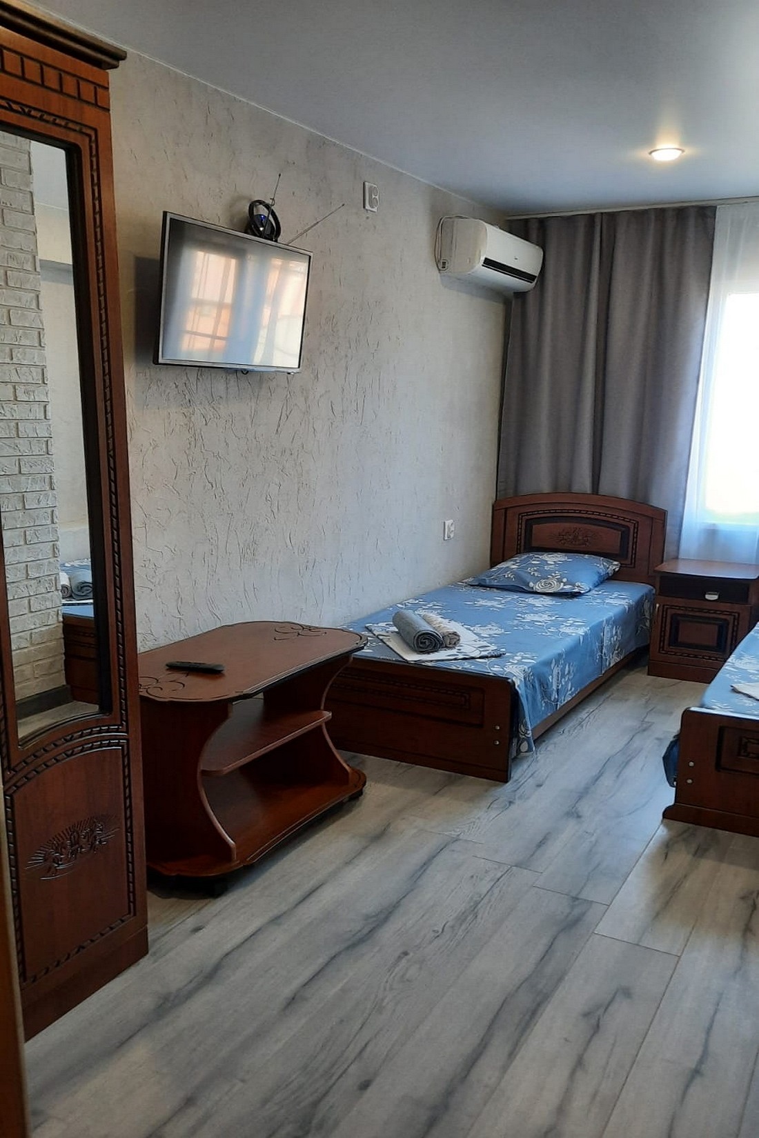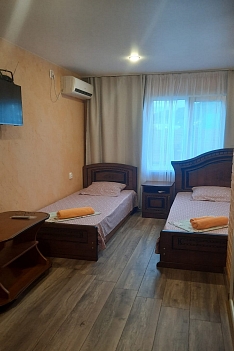 В номере: кровать двуспальная, кровать односпальная, столик журнальный, стулья, шкаф, кондиционер, телевизор