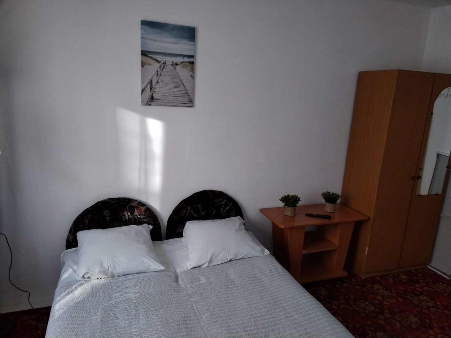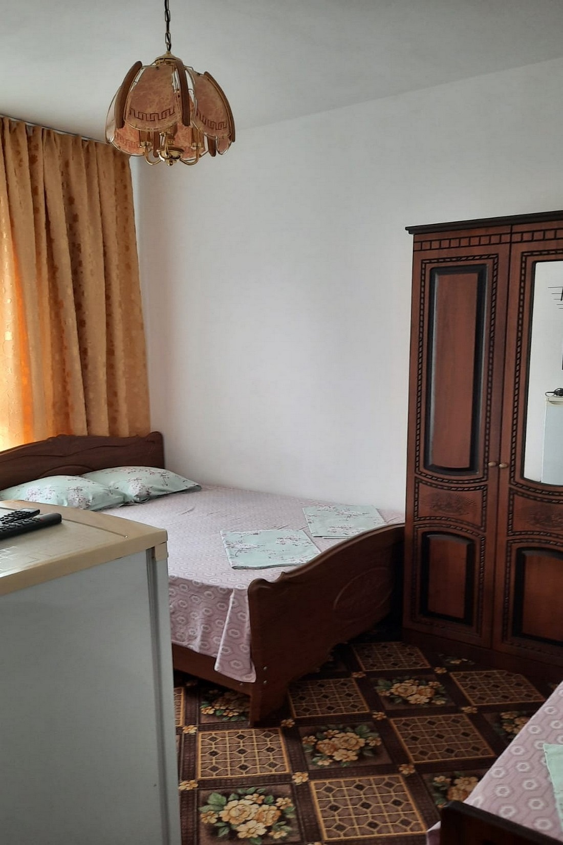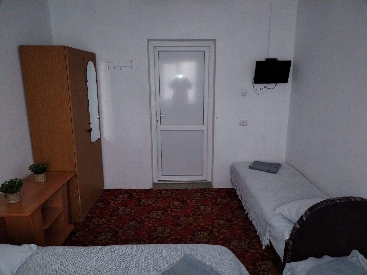 В номере: кровать двуспальная, кровать односпальная, столик журнальный, стулья, шкаф, кондиционер, телевизор