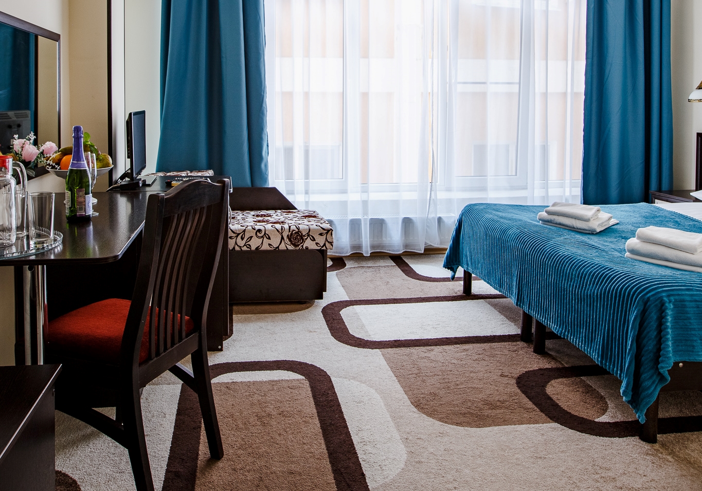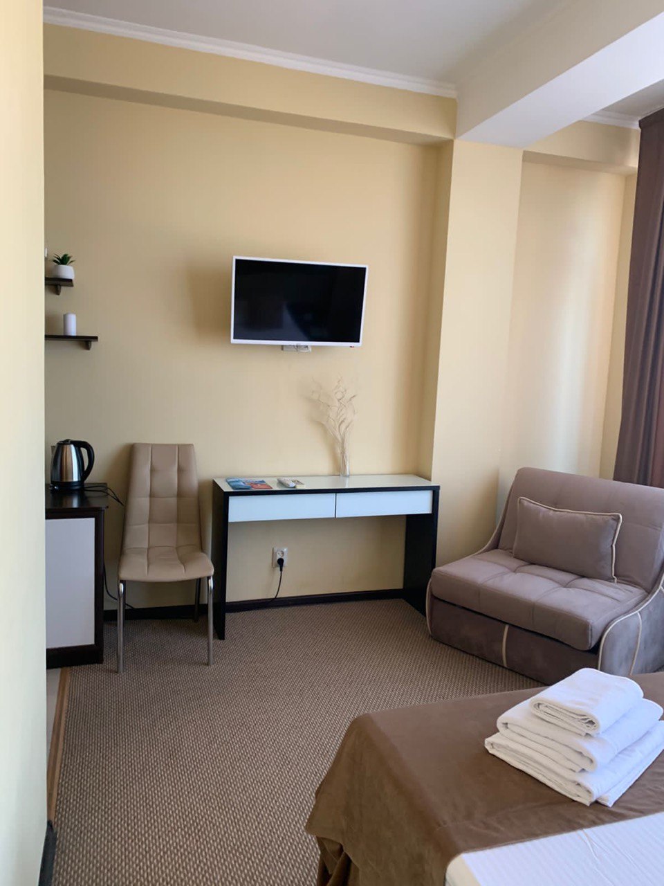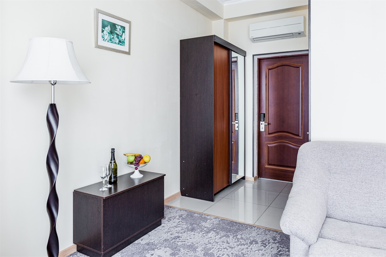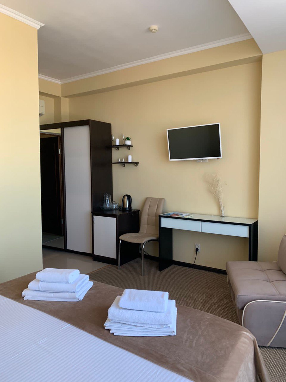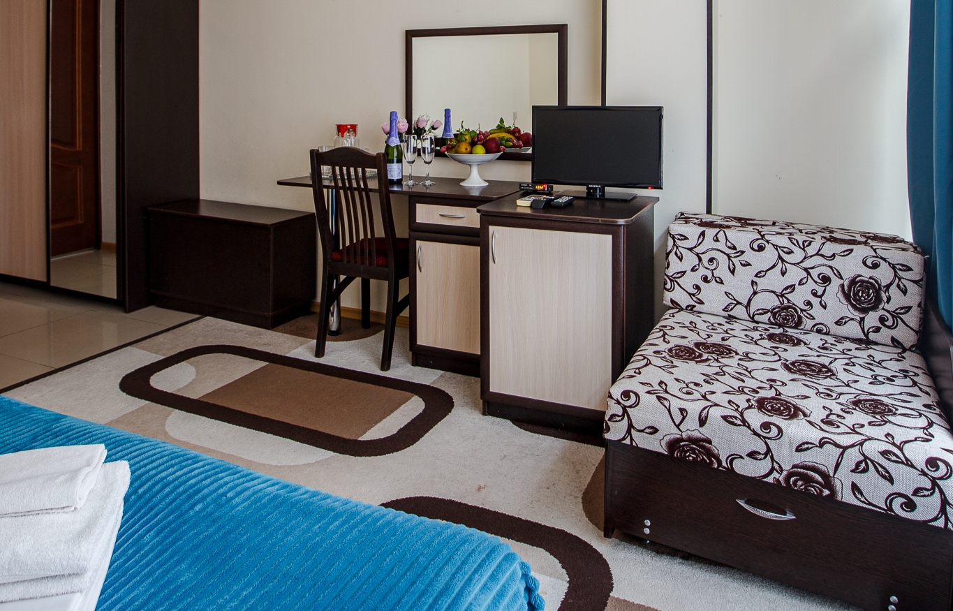 В номере: вешалка, диван раскладной, зеркало, кровать двуспальная, стул, шкаф, кондиционер, мини-холодильник, телевизор