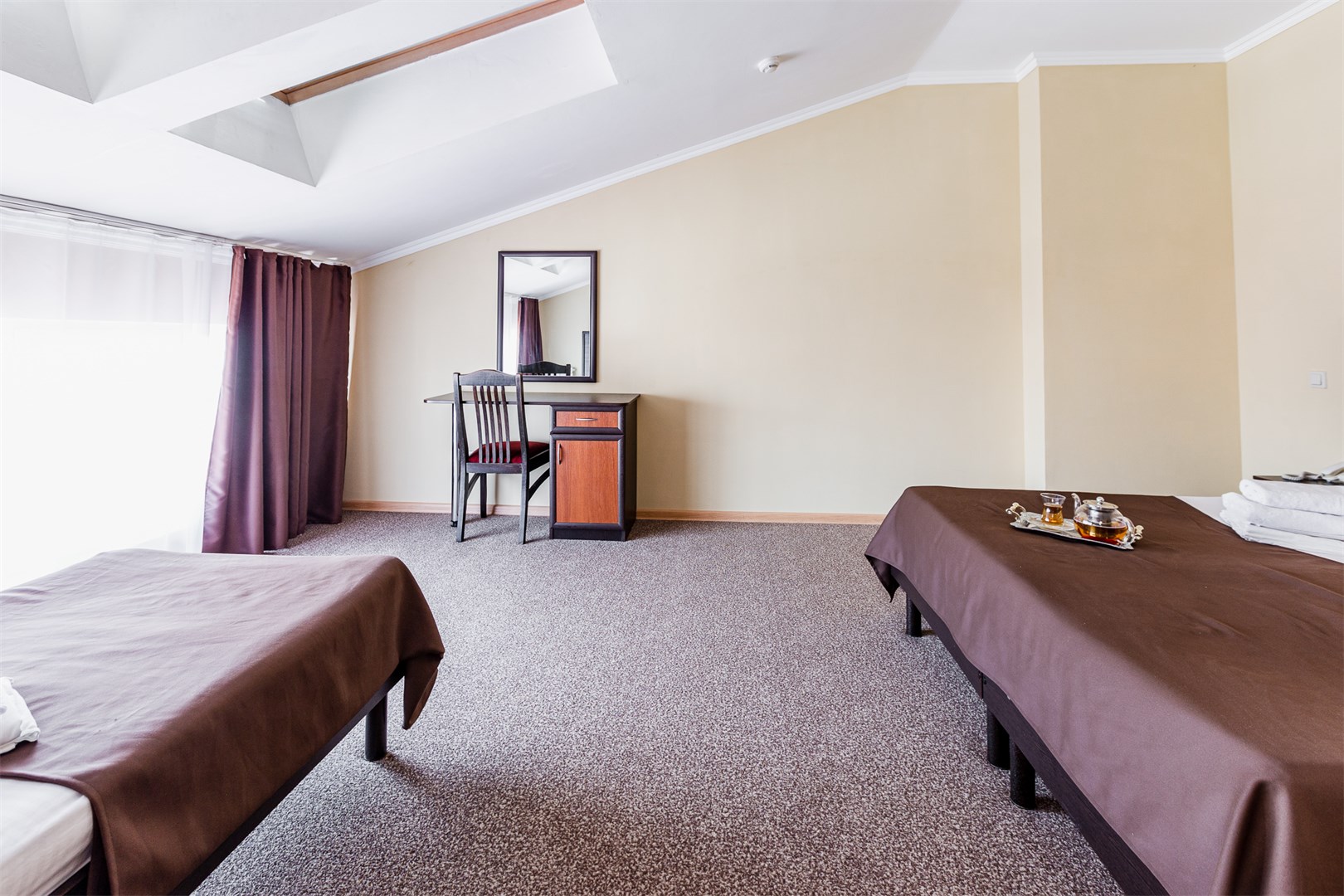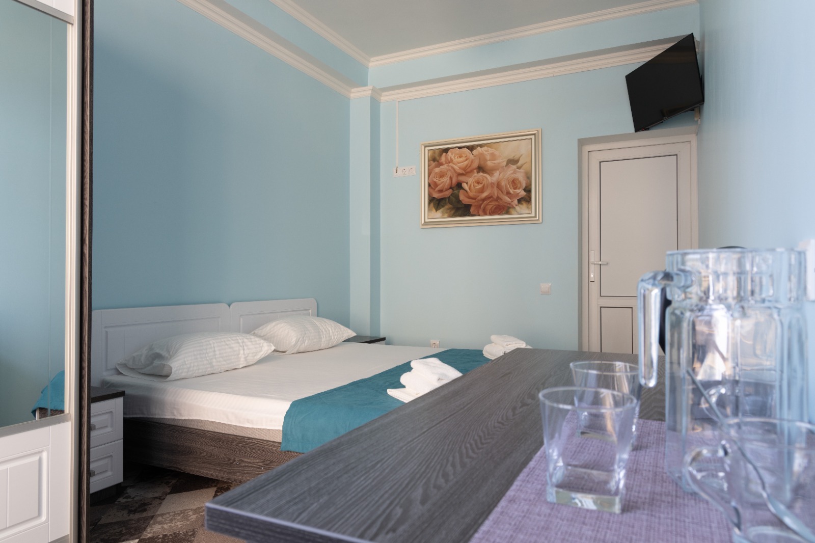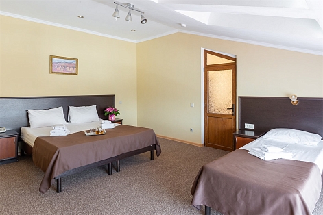 В номере: вешалка, зеркало, кровати односпальные /одна двуспальная кровать, прикроватные тумбочки, стол, стул, шкаф, кондиционер, мини-холодильник, телевизор