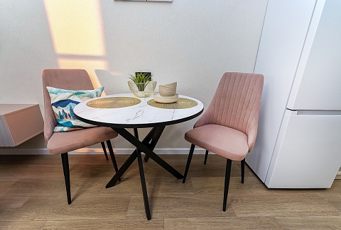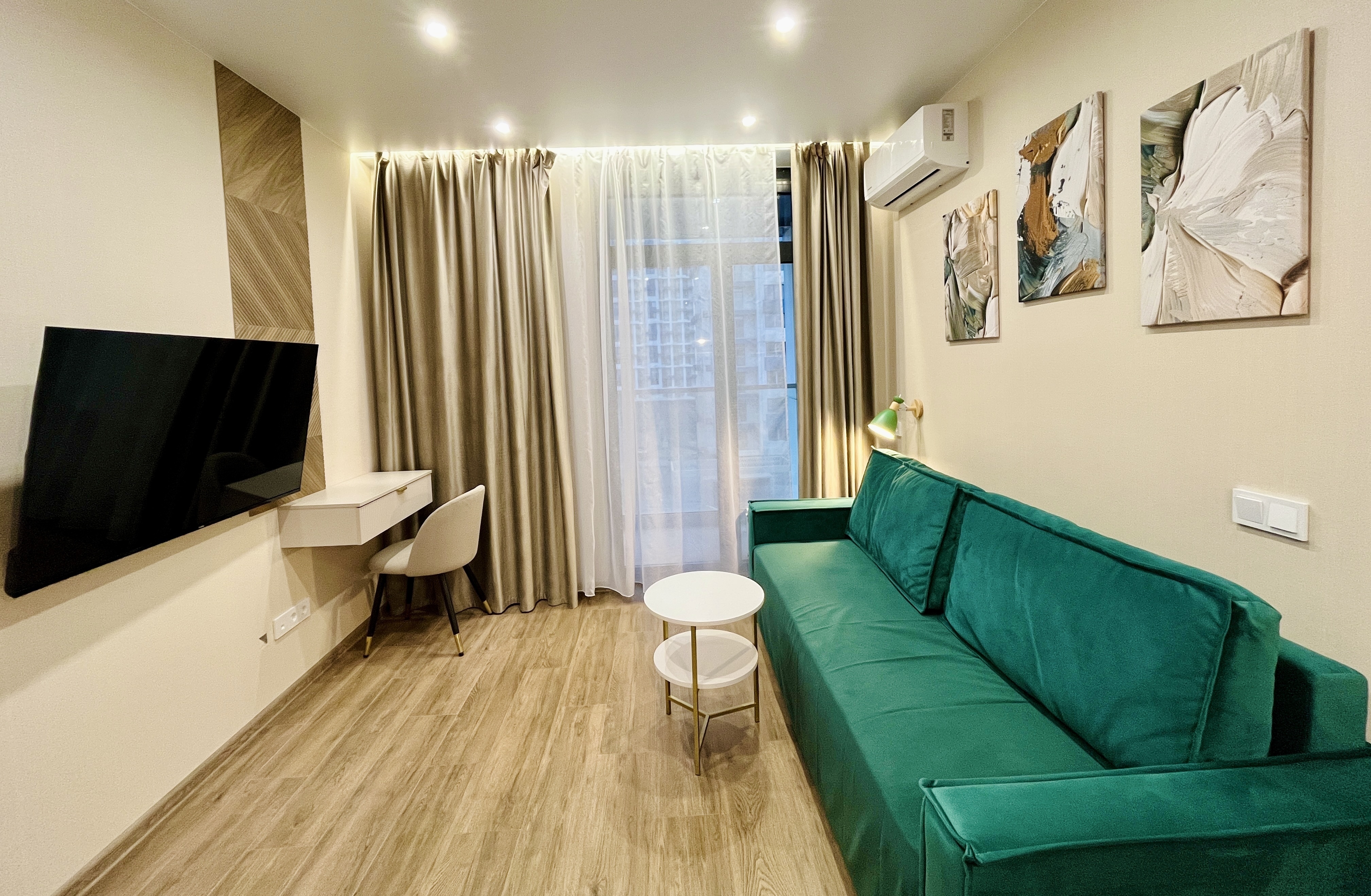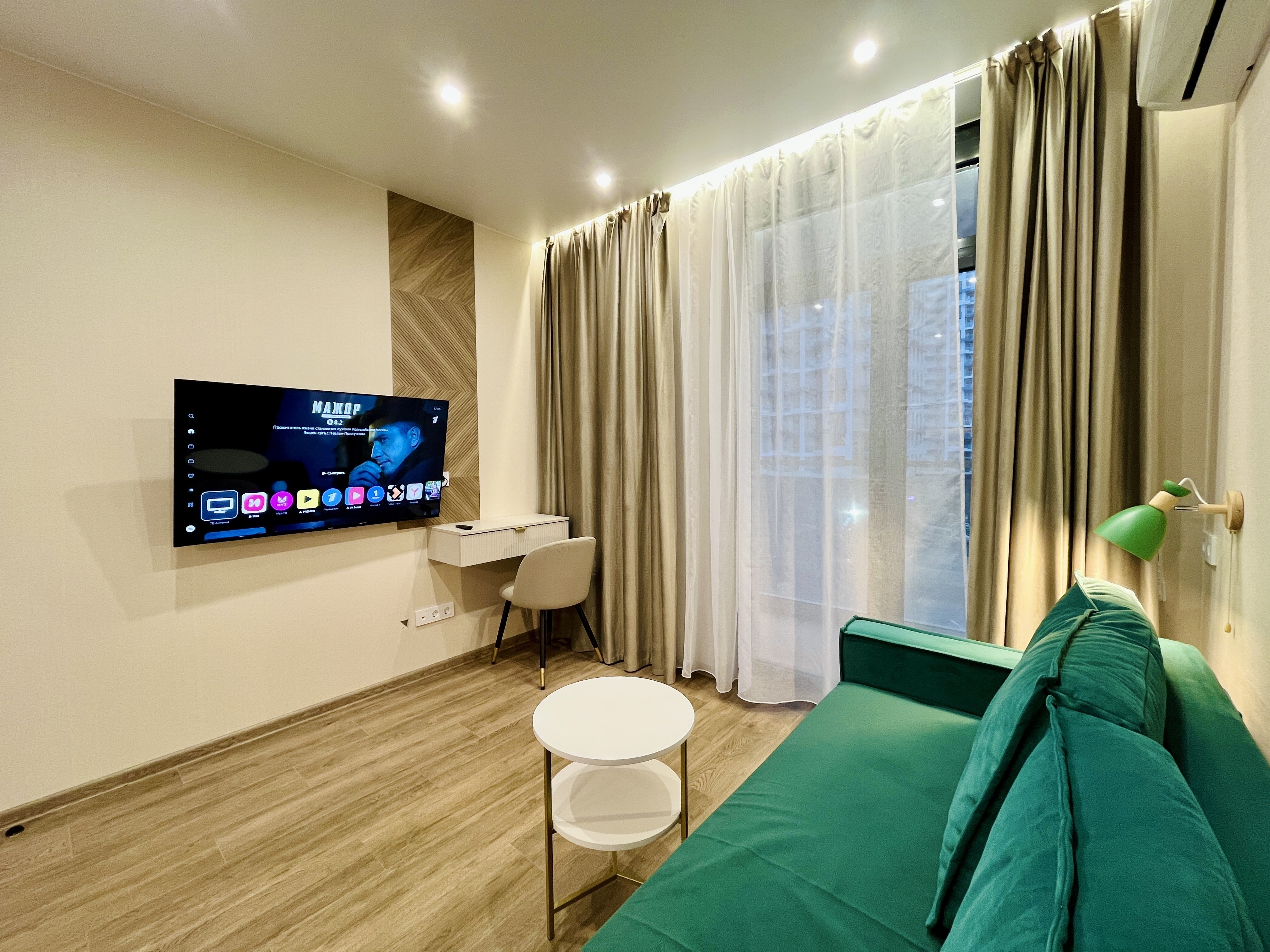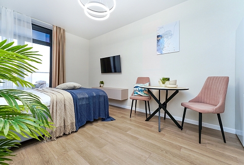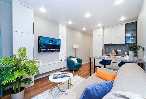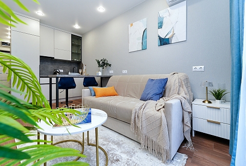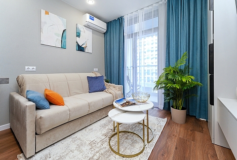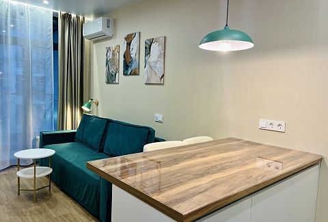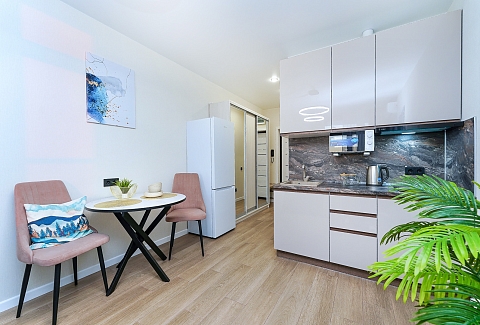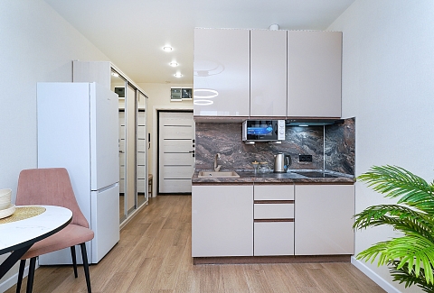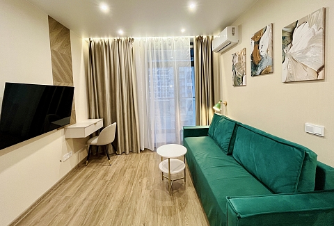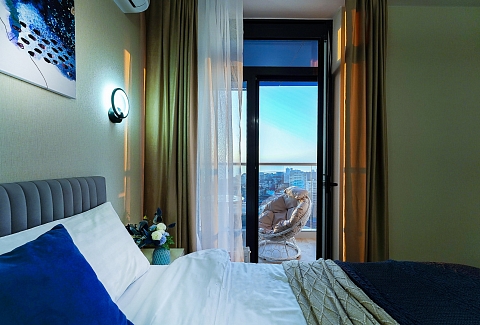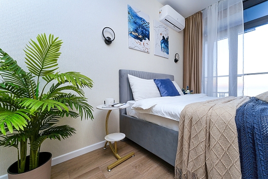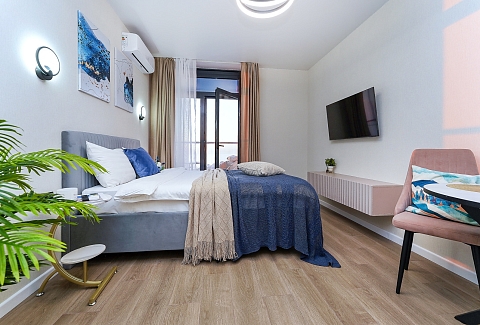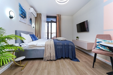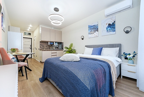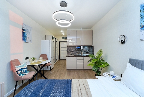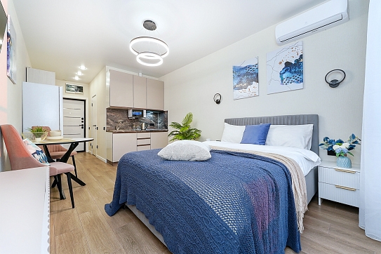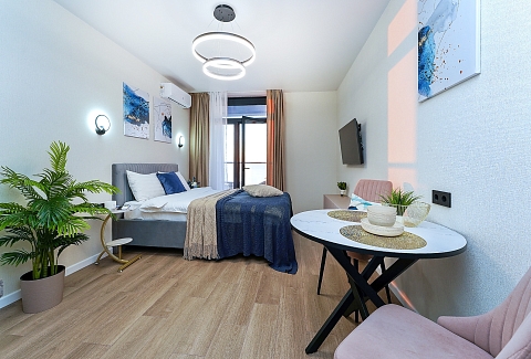 До городских пляжей и до парка «Дендрарий» — всего 7 минут езды.Для размещения предлагается четыре варианта. Три студии рассчитаны на двух гостей каждая, четвёртый вариант — двухкомнатная студия, которая комфортно вмещает до пяти человек. В каждом из вариантов предусмотрены современный двуспальный раскладной ортопедический диван, или кровати вместительный шкаф для вещей. В ряде апартаментов с балкона открывается вид на море, горы или городские окрестности.Кухня оборудована в современном стиле: встраиваемый холодильник, варочная панель, вытяжка, микроволновая печь, чайник, а также полный набор посуды и кухонных принадлежностей. Из техники и электроники — большой ЖК-телевизор, быстрый стабильный Wi-Fi, сплит-система, стиральная машина, фен, утюг, гладильная доска и сушилка для белья. Совмещённый санузел оснащён душем, туалетом и большим зеркалом с подсветкой.На территории комплекса предусмотрены спортивные и детские площадки, столы для настольного тенниса, баскетбольные и футбольные площадки, скейт-парк, отдельные зоны отдыха с шезлонгами, а также открытые террасы с газонной травой, клумбами и живыми насаждениями.