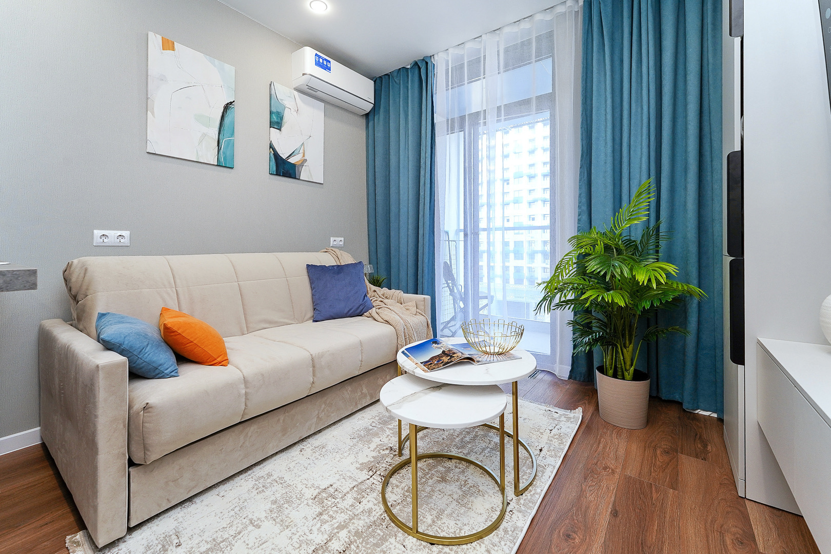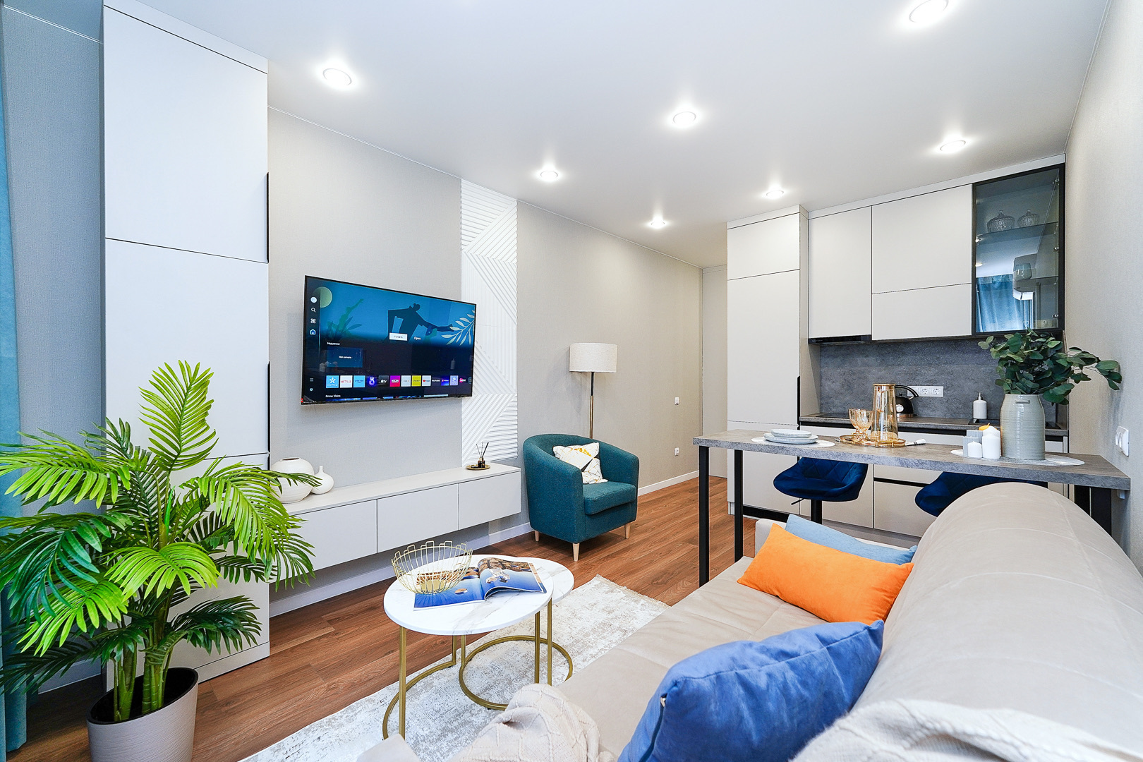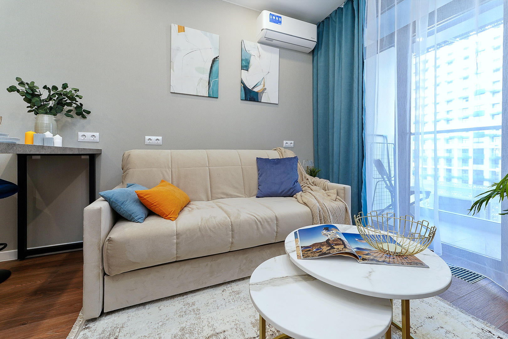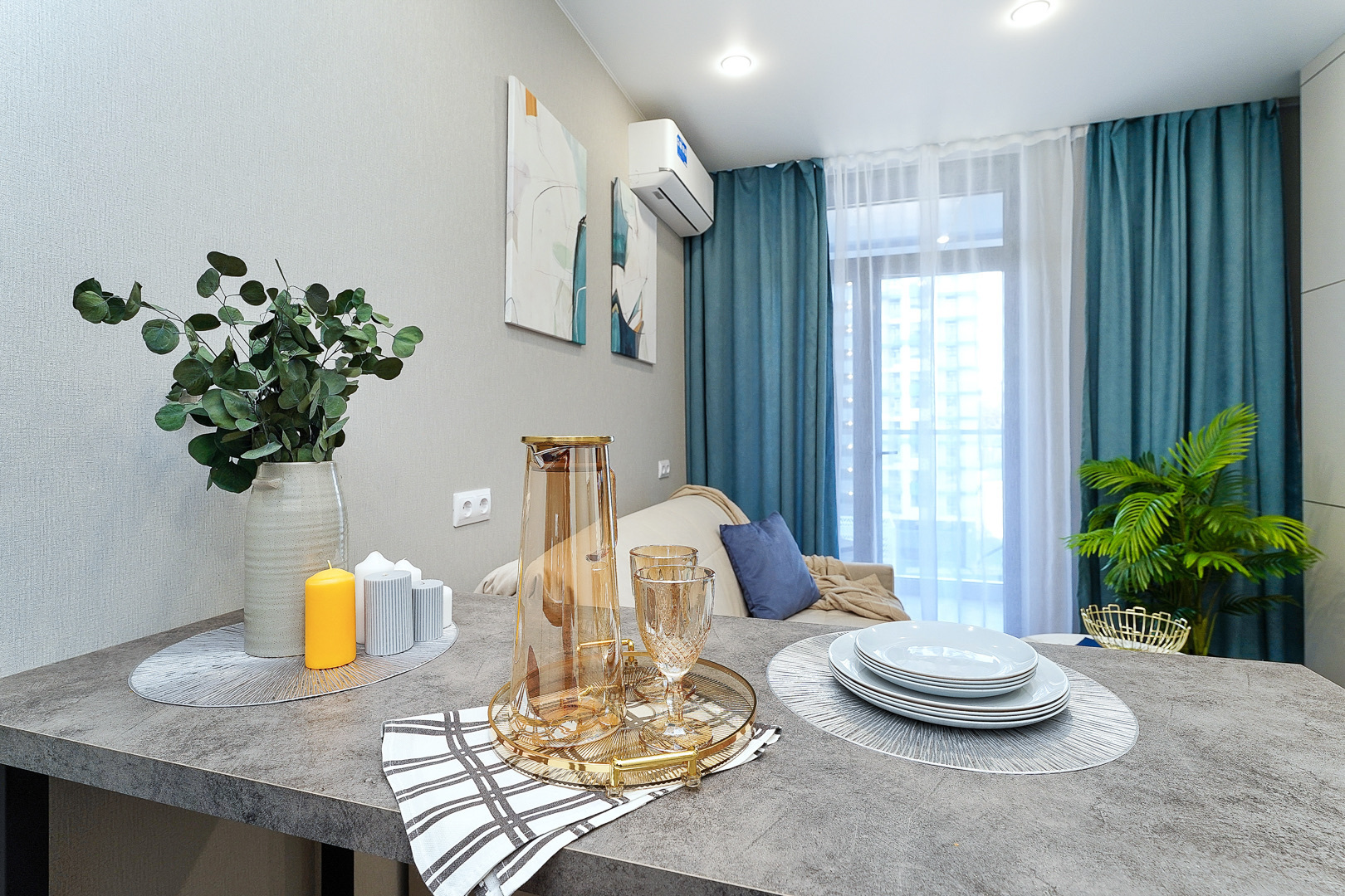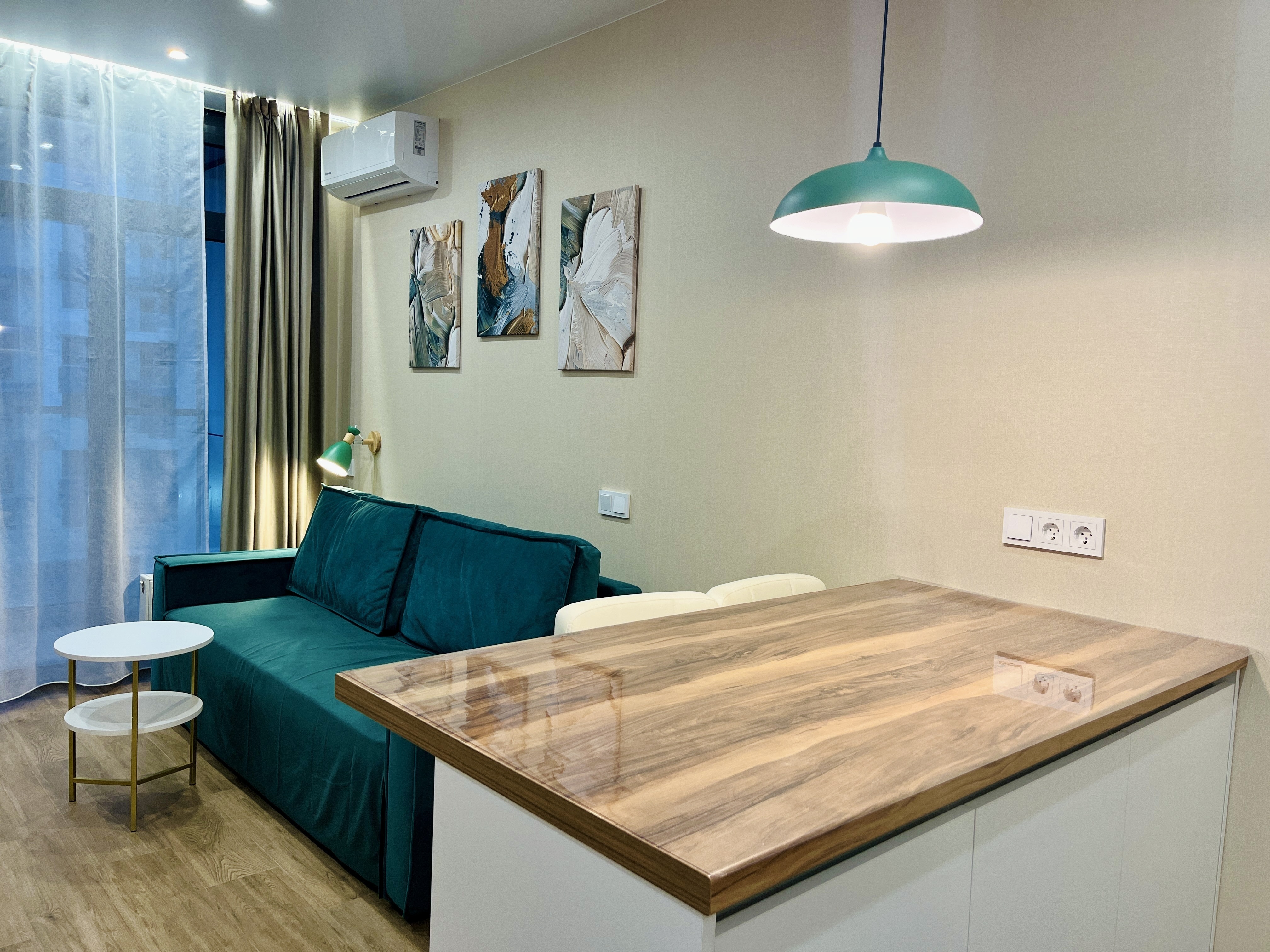 До городских пляжей и до парка «Дендрарий» — всего 7 минут езды.Для размещения предлагается четыре варианта. Три студии рассчитаны на двух гостей каждая, четвёртый вариант — двухкомнатная студия, которая комфортно вмещает до пяти человек. В каждом из вариантов предусмотрены современный двуспальный раскладной ортопедический диван, или кровати вместительный шкаф для вещей. В ряде апартаментов с балкона открывается вид на море, горы или городские окрестности.Кухня оборудована в современном стиле: встраиваемый холодильник, варочная панель, вытяжка, микроволновая печь, чайник, а также полный набор посуды и кухонных принадлежностей. Из техники и электроники — большой ЖК-телевизор, быстрый стабильный Wi-Fi, сплит-система, стиральная машина, фен, утюг, гладильная доска и сушилка для белья. Совмещённый санузел оснащён душем, туалетом и большим зеркалом с подсветкой.На территории комплекса предусмотрены спортивные и детские площадки, столы для настольного тенниса, баскетбольные и футбольные площадки, скейт-парк, отдельные зоны отдыха с шезлонгами, а также открытые террасы с газонной травой, клумбами и живыми насаждениями.
