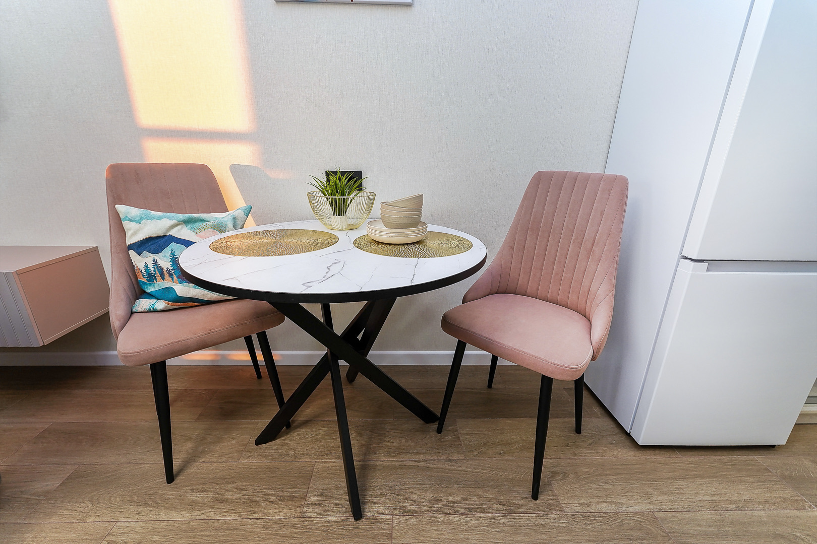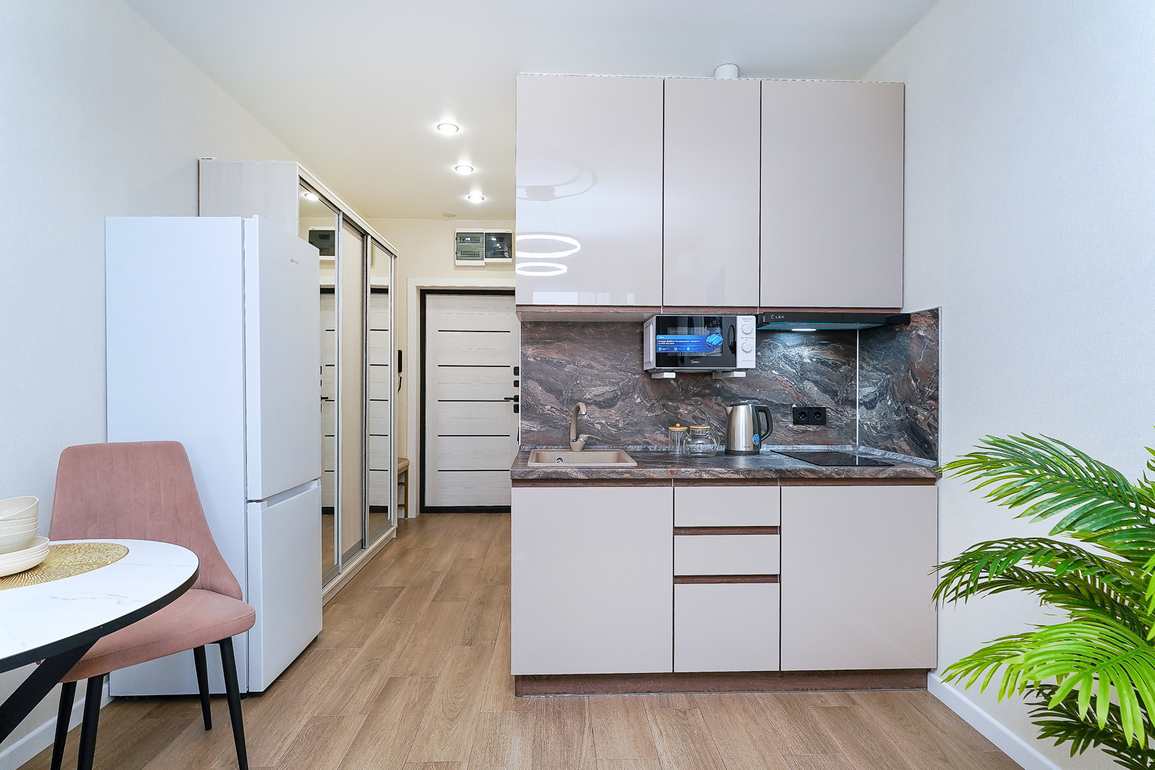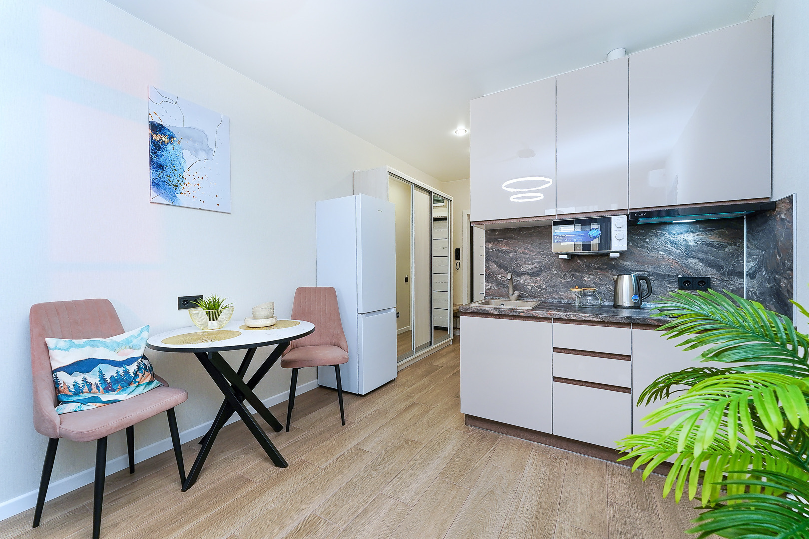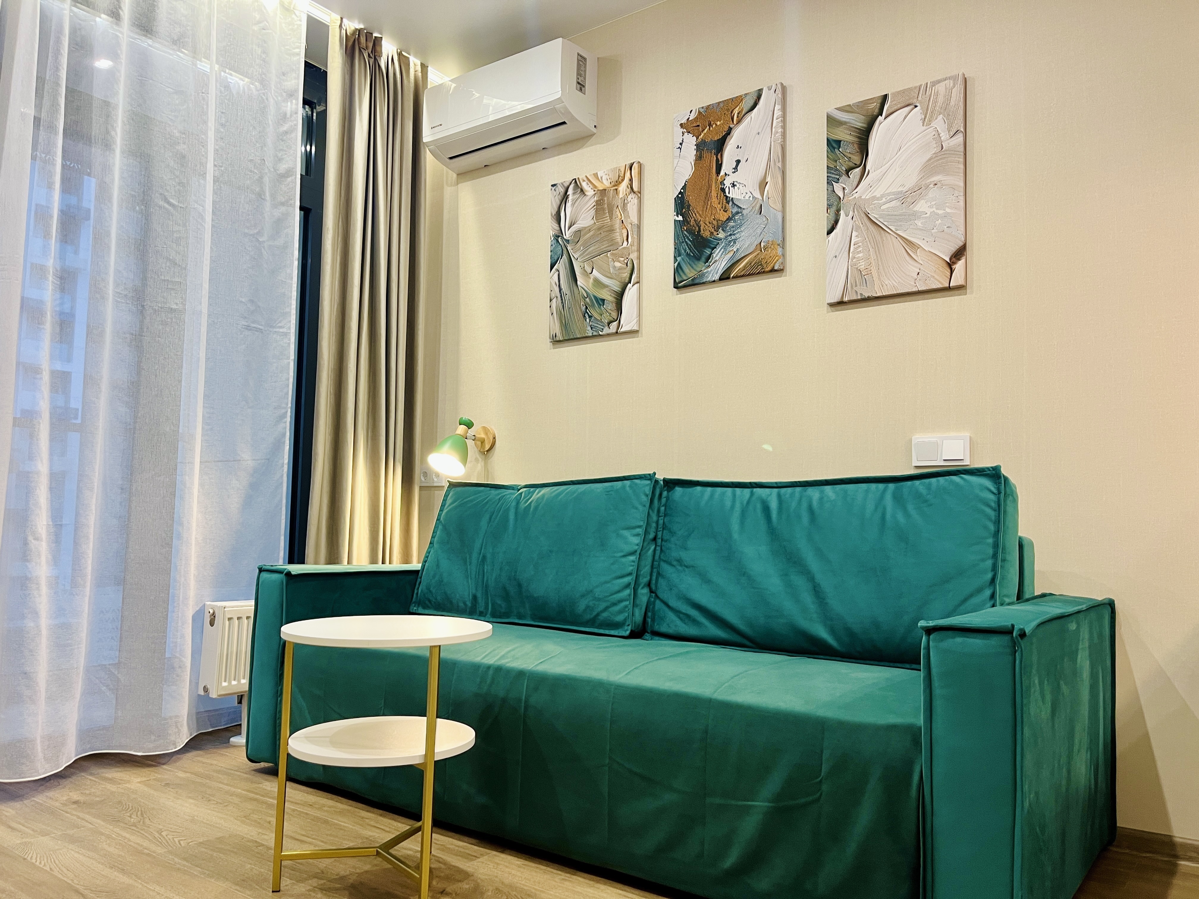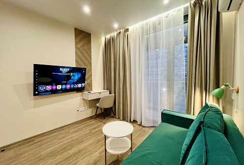 В номере: вешалка, диван, зеркало, стол, стулья, тумба, шкаф, гладильная доска, кондиционер, микроволновая печь, набор посуды, плита, стиральная машина, телевизор, утюг, холодильник, электрочайник