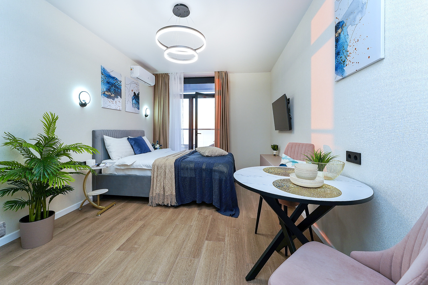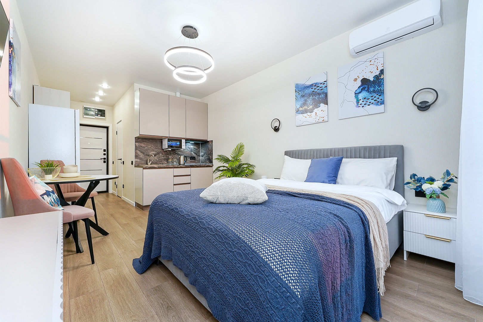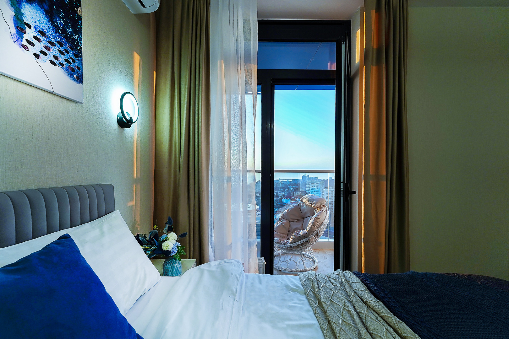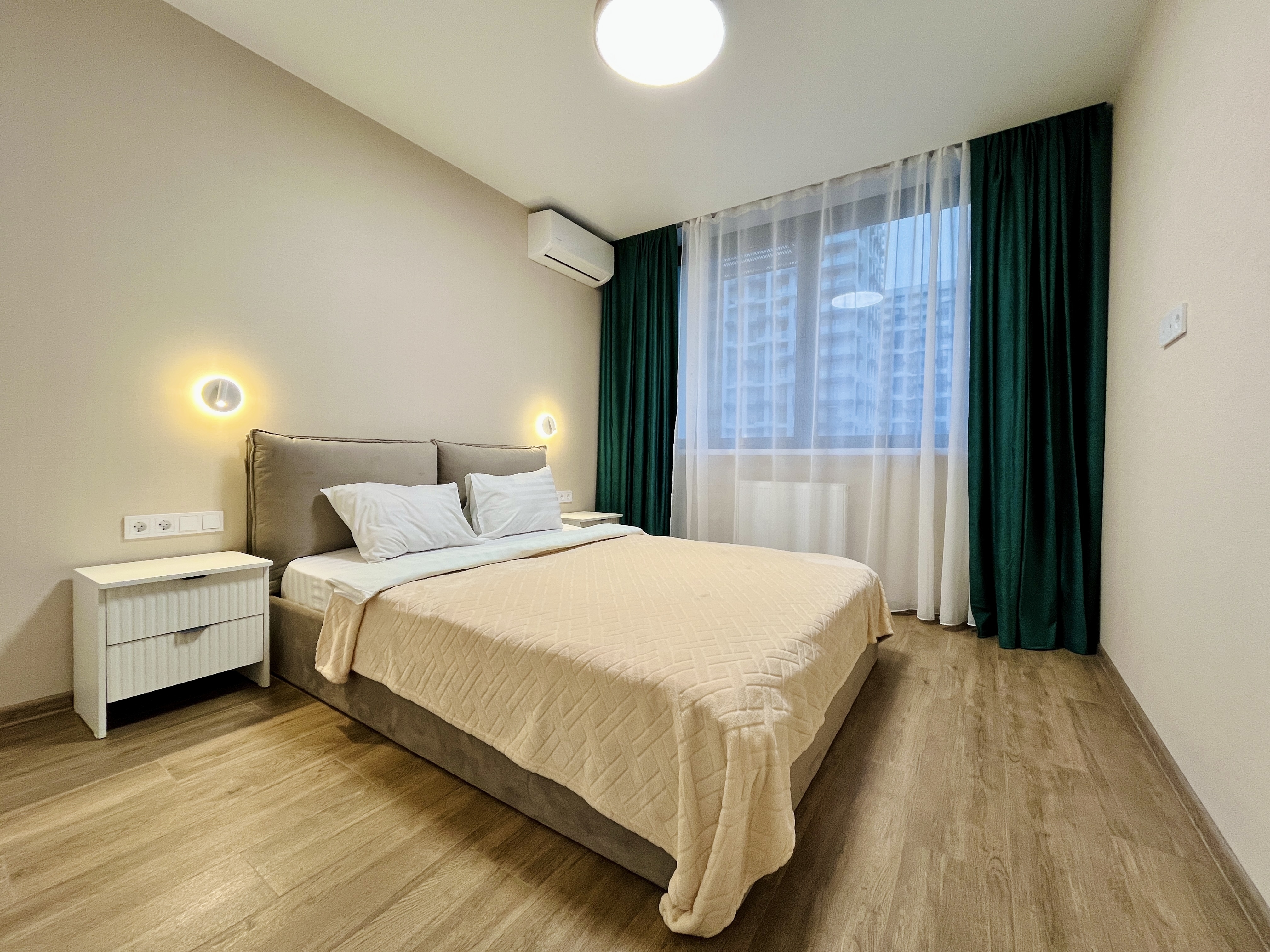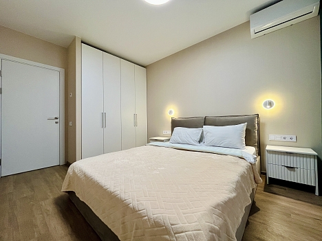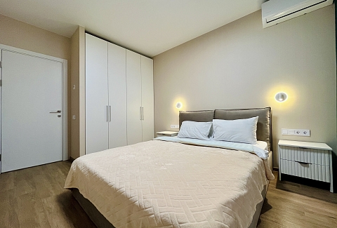 В номере: вешалка, диван, зеркало, кровать двуспальная, прикроватные тумбочки, стол, стулья, тумба, шкаф, гладильная доска, кондиционер, микроволновая печь, набор посуды, плита, стиральная машина, телевизор, утюг, холодильник, электрочайник