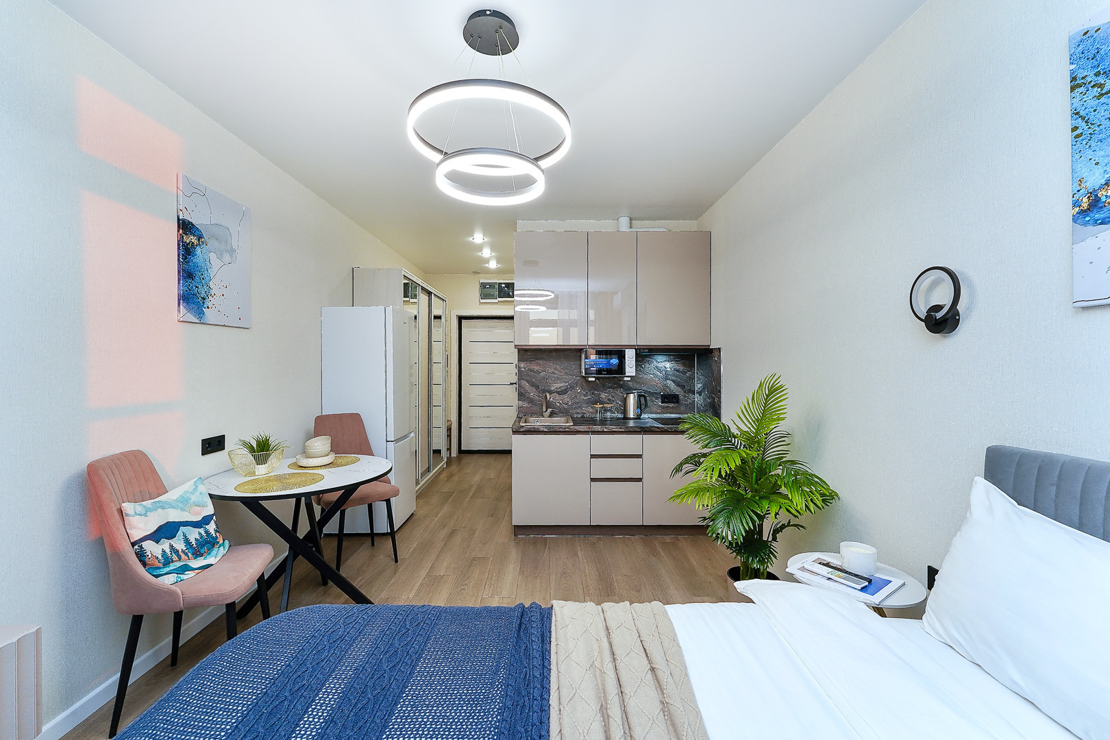 В номере: вешалка, зеркало, кровать двуспальная, прикроватные тумбочки, стол, стулья, тумба, шкаф, гладильная доска, кондиционер, микроволновая печь, набор посуды, плита, стиральная машина, телевизор, утюг, холодильник, электрочайник