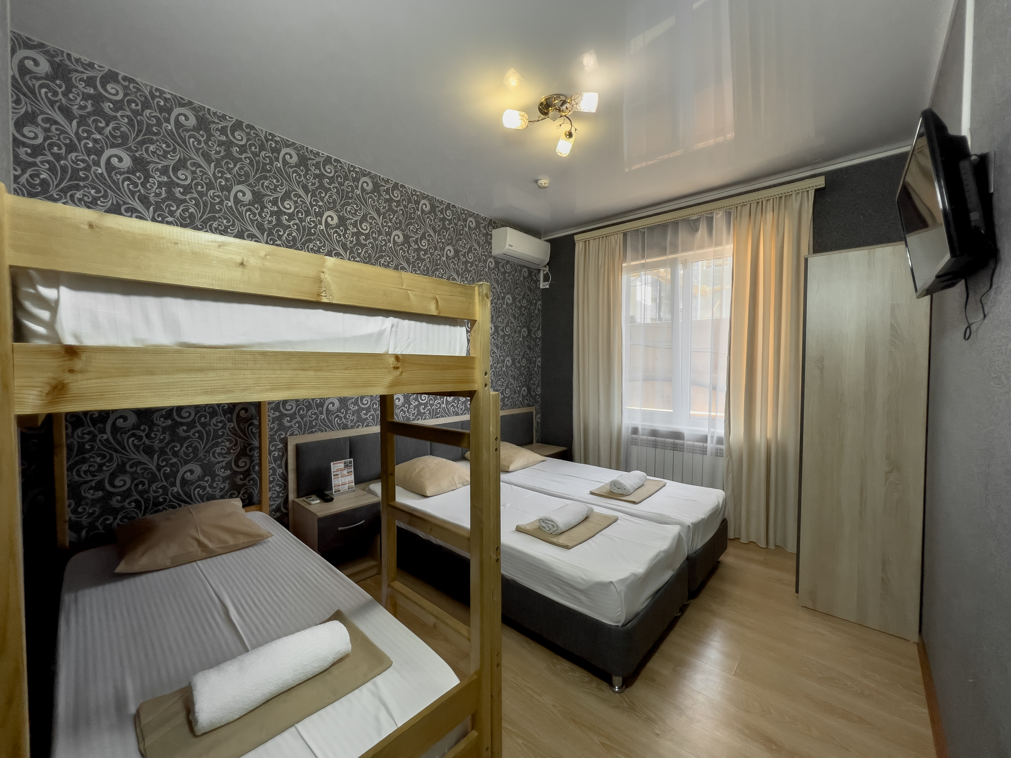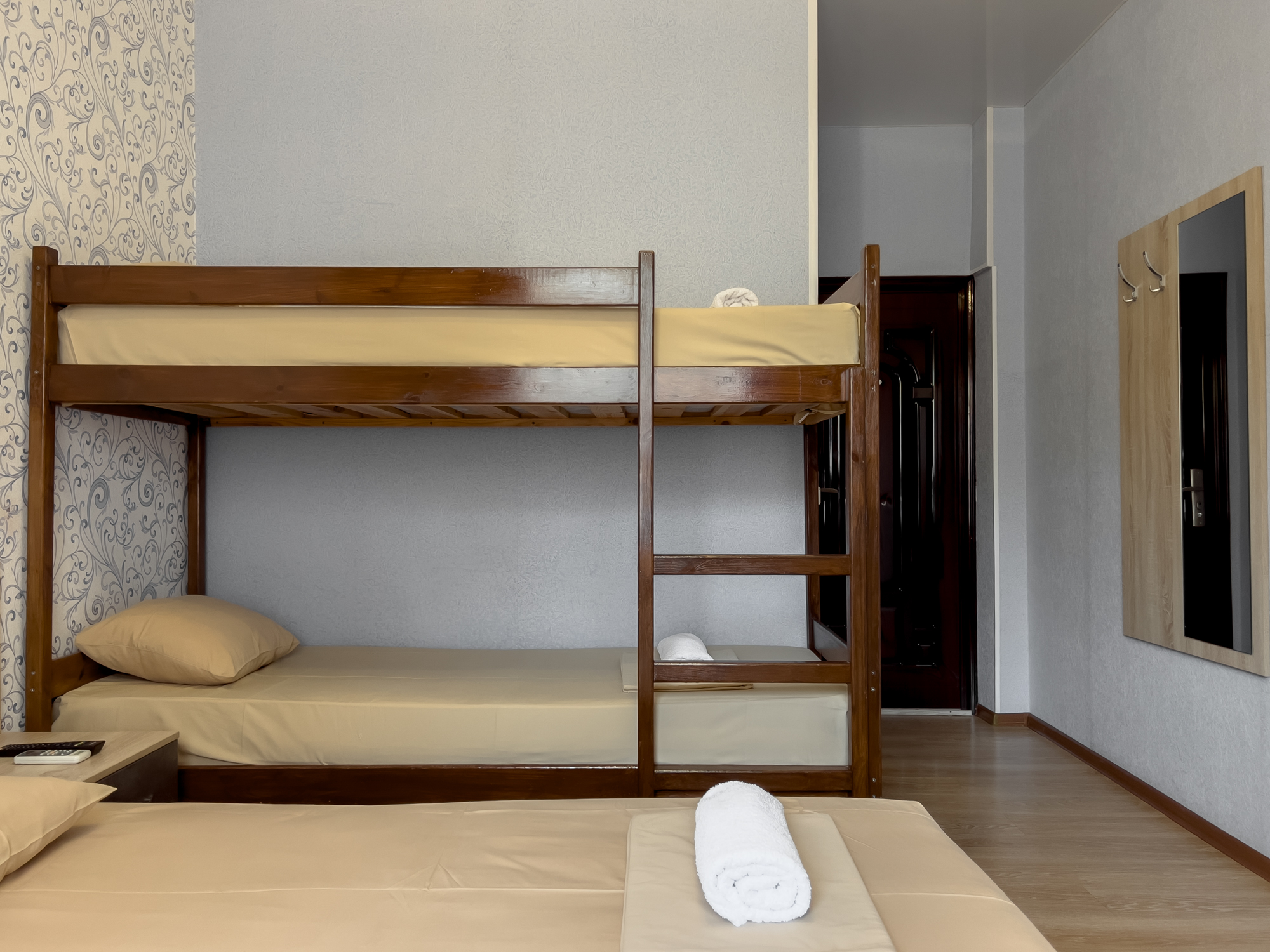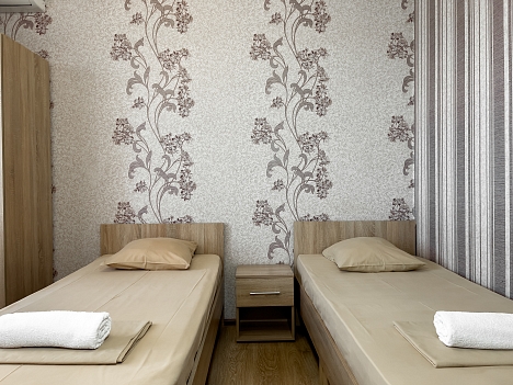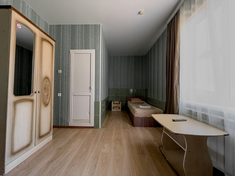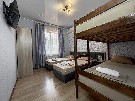 В номере: вешалка, зеркало, кровати односпальные, кровать двухъярусная, прикроватные тумбочки, стол, стулья, шкаф, вентилятор, телевизор