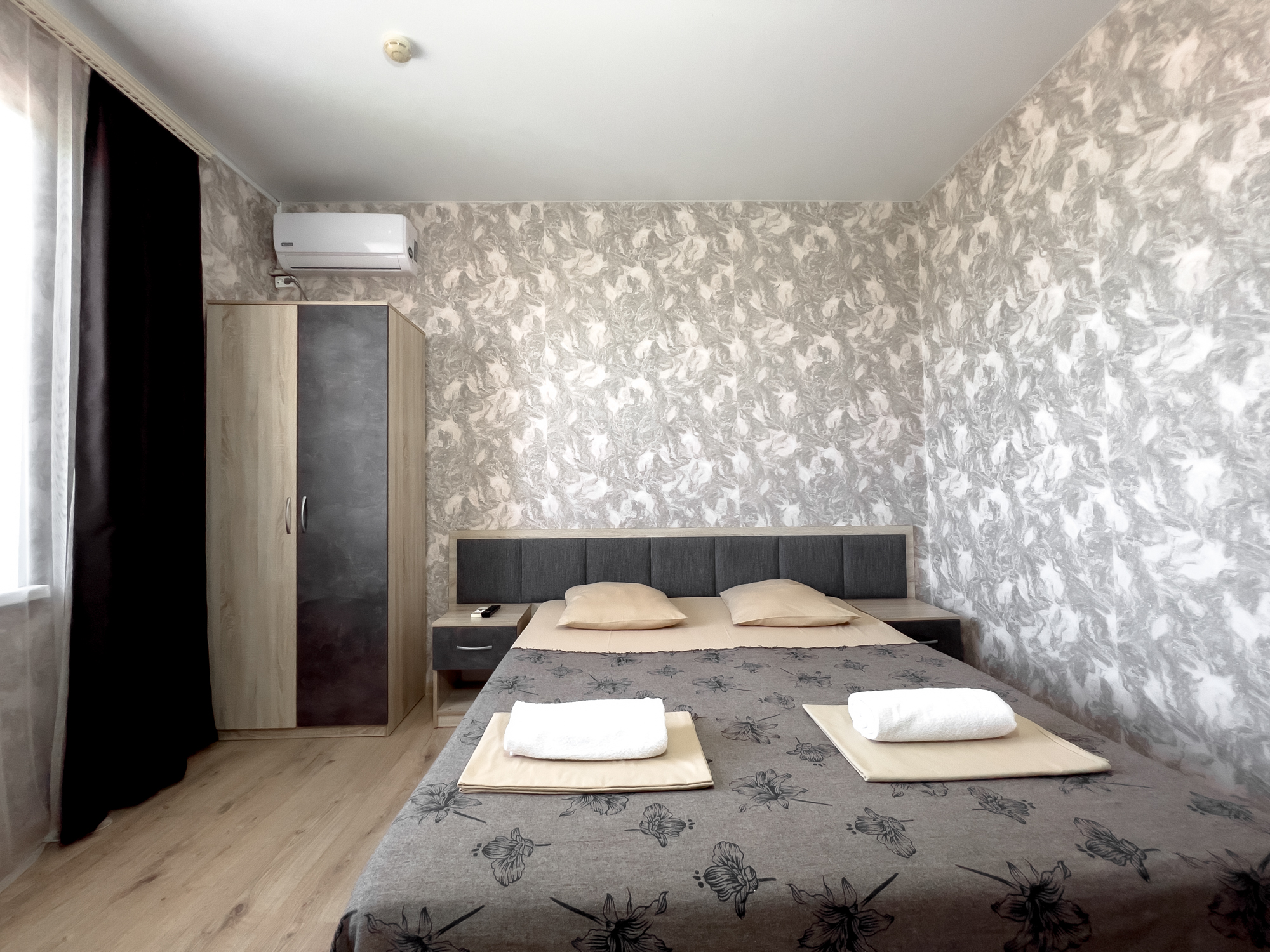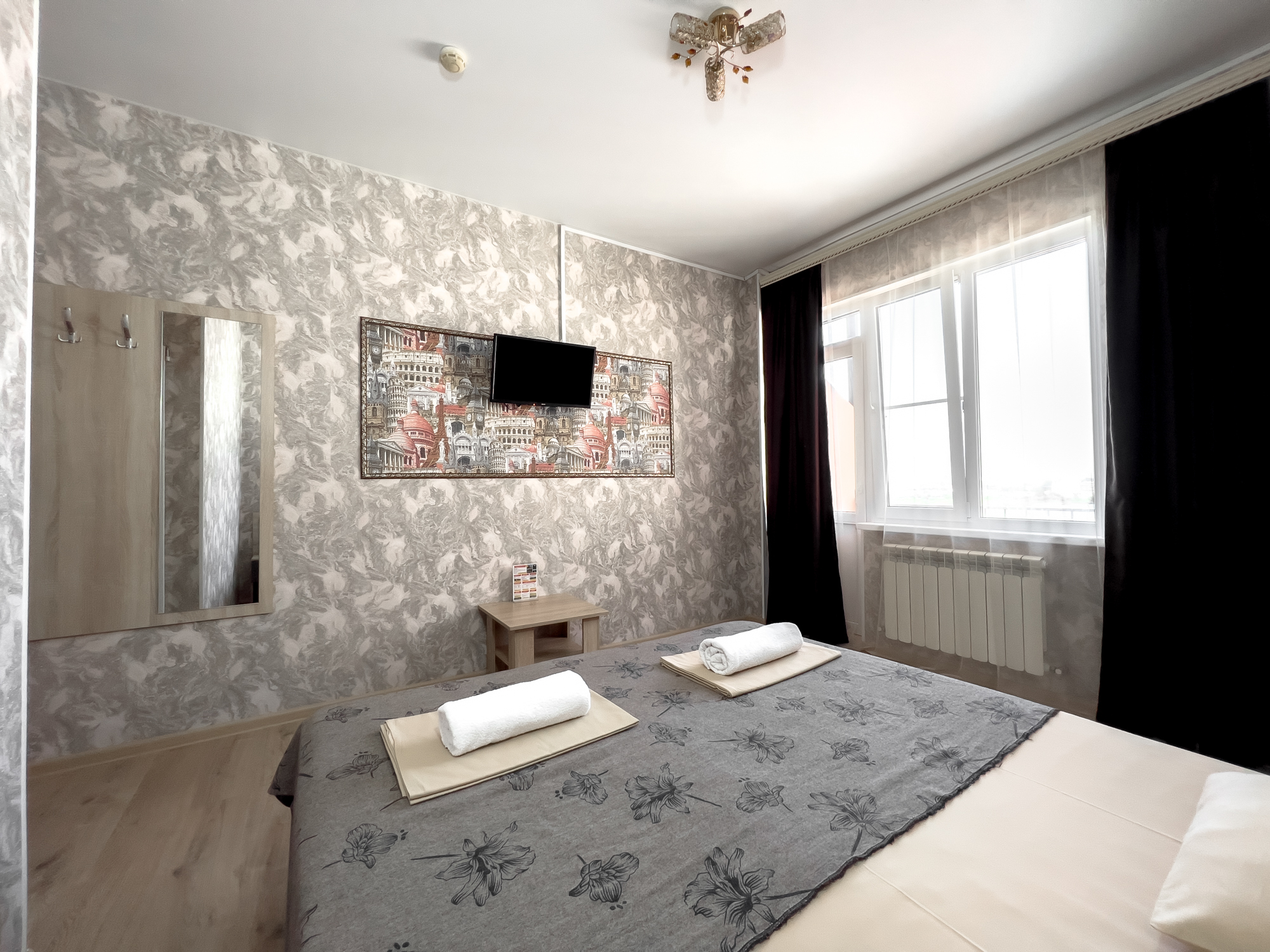 В номере: вешалка, зеркало, кровать двуспальная, прикроватные тумбочки, стол, стулья, шкаф, кондиционер, телевизор