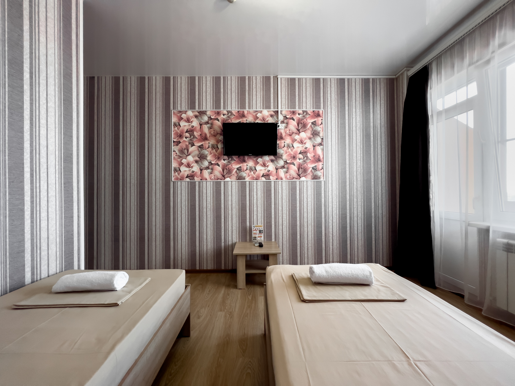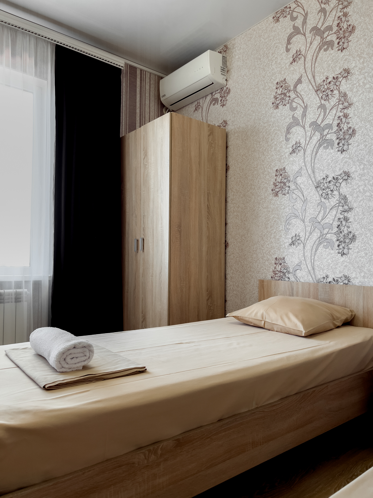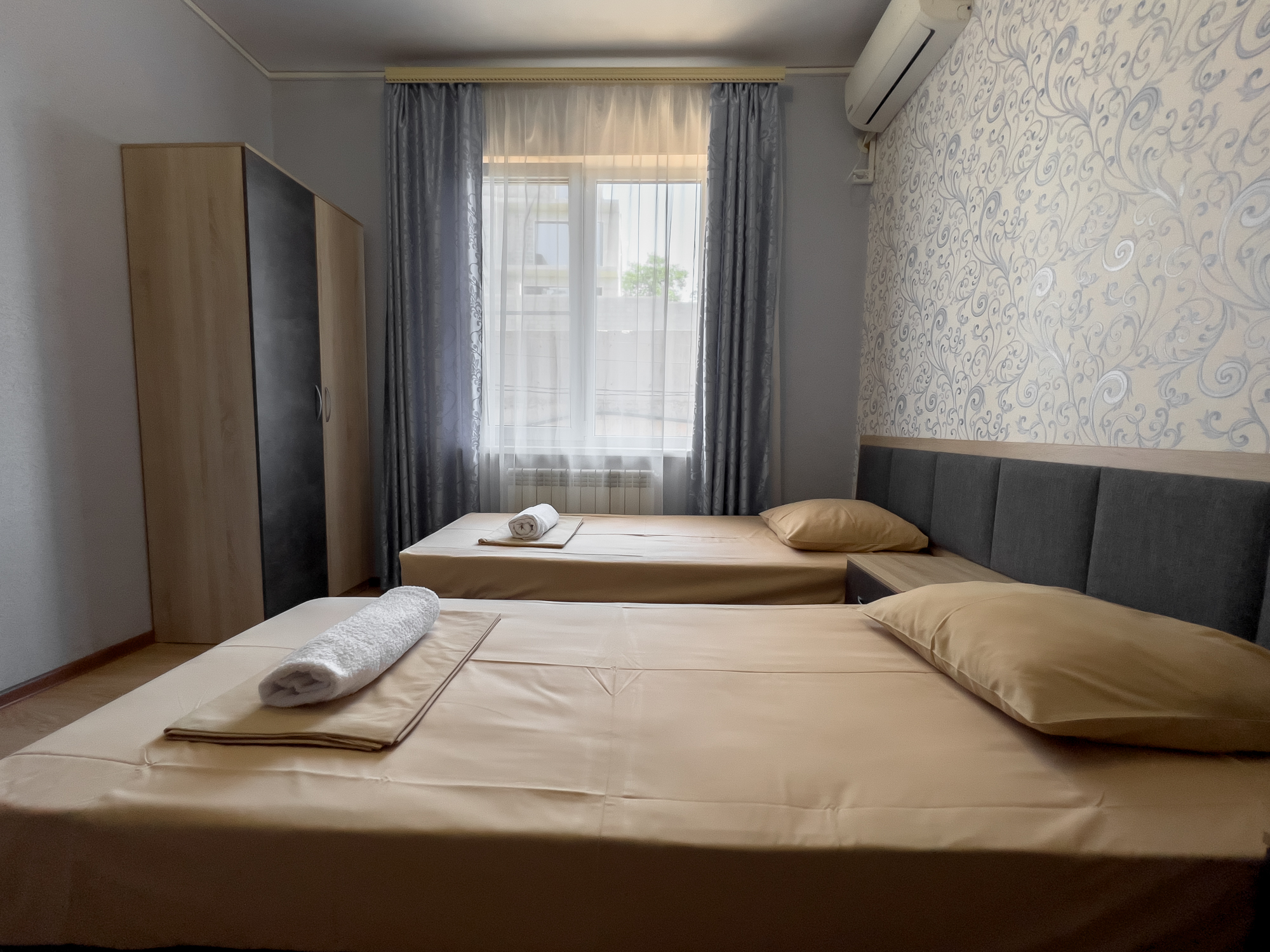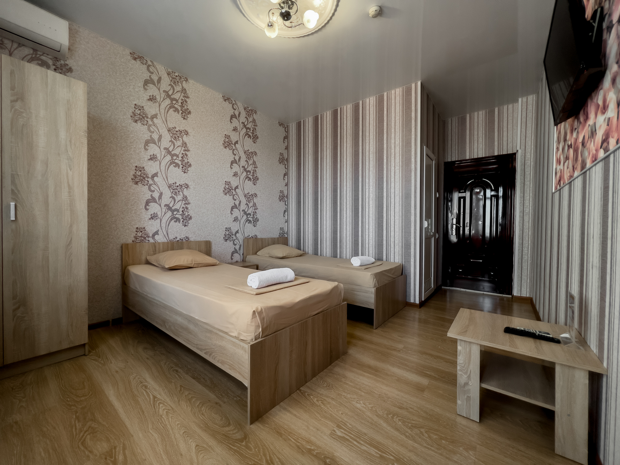 В номере: вешалка, зеркало, кровати односпальные, прикроватные тумбочки, стол, стулья, шкаф, кондиционер, телевизор