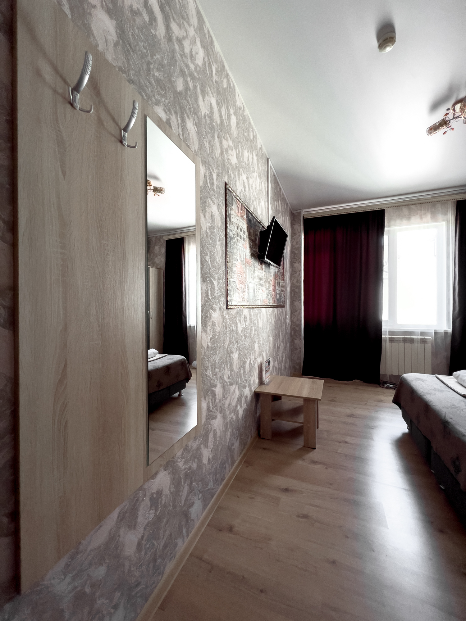 В номере: вешалка, зеркало, кровати односпальные, прикроватные тумбочки, стол, стулья, шкаф, телевизор