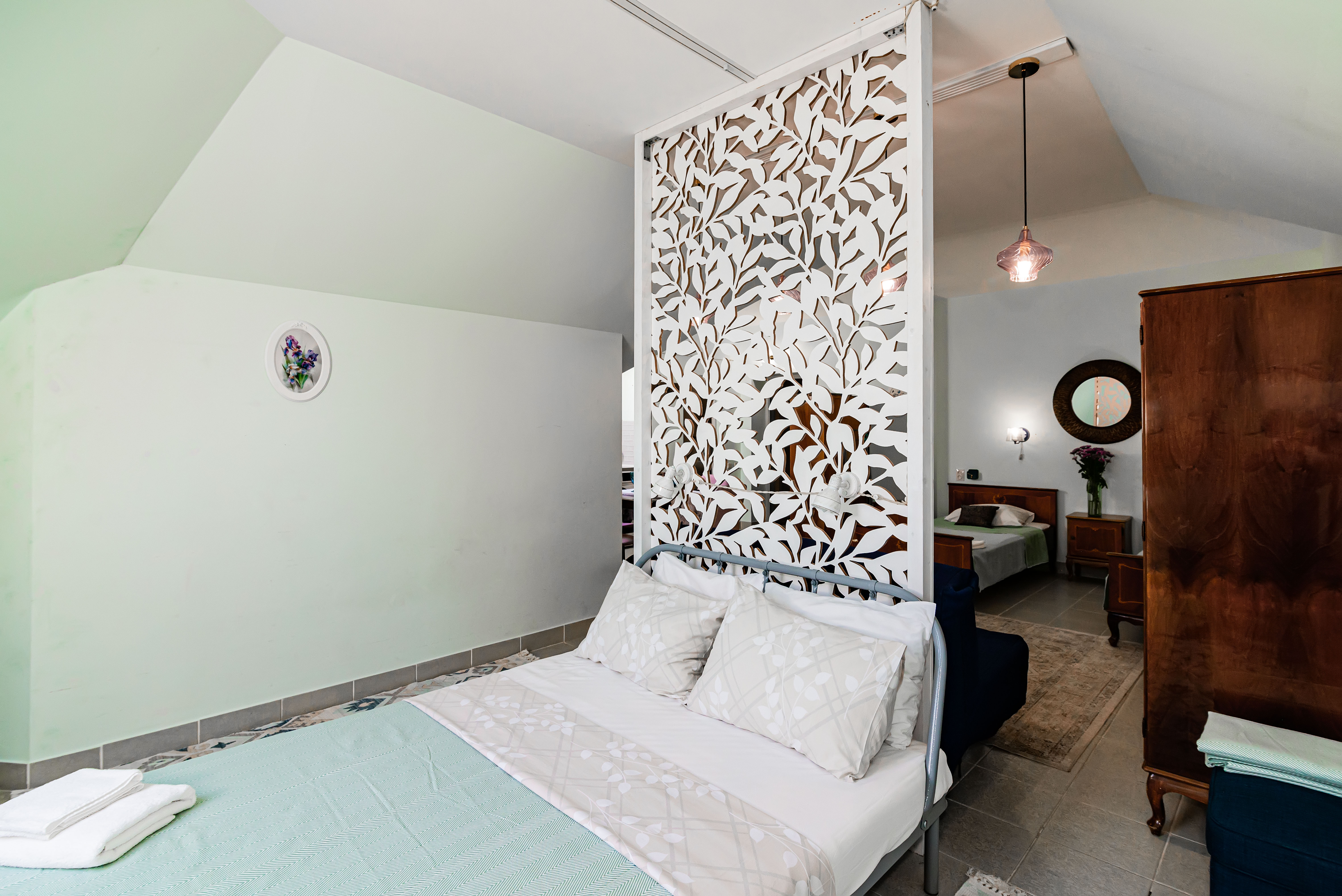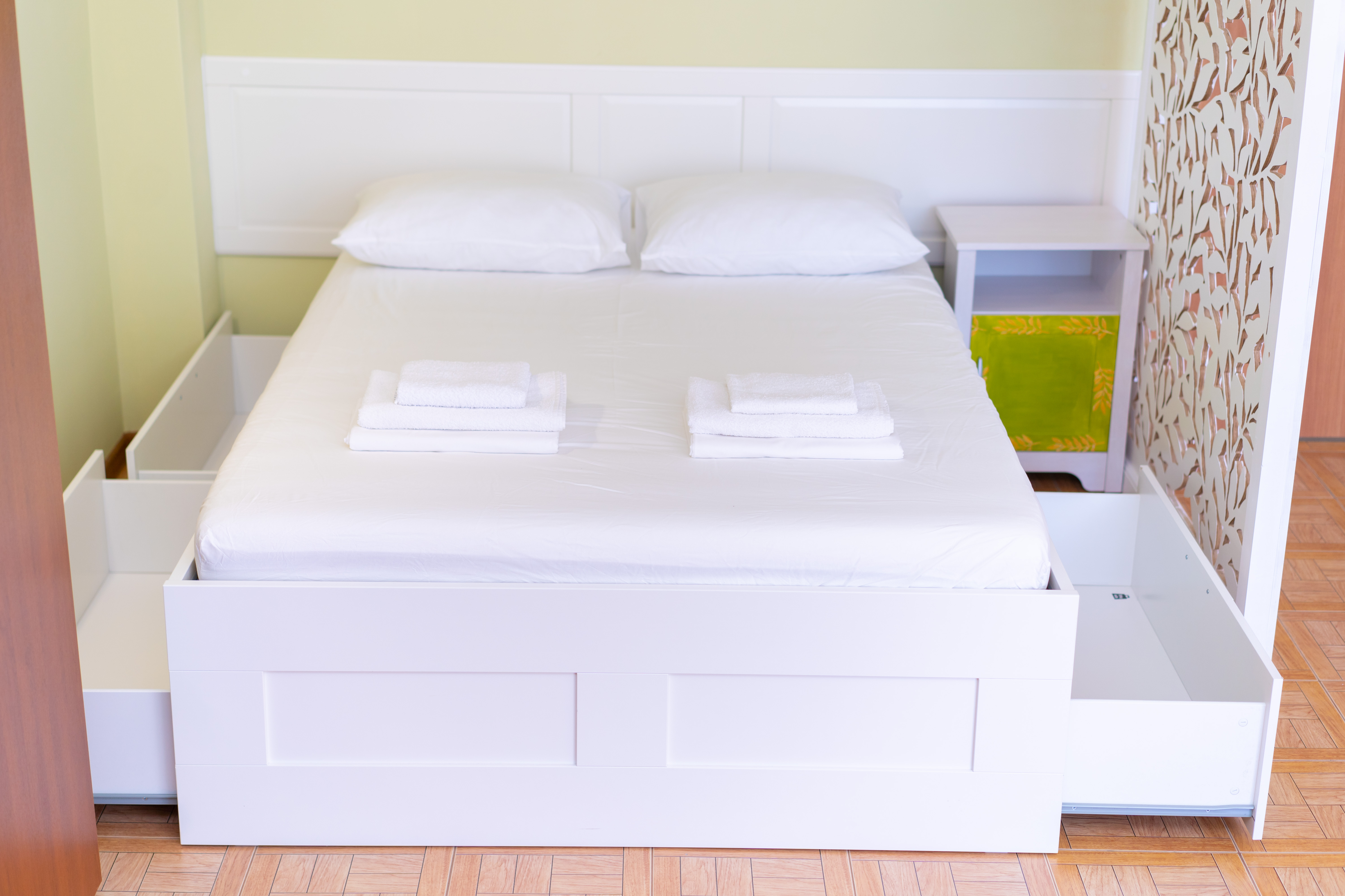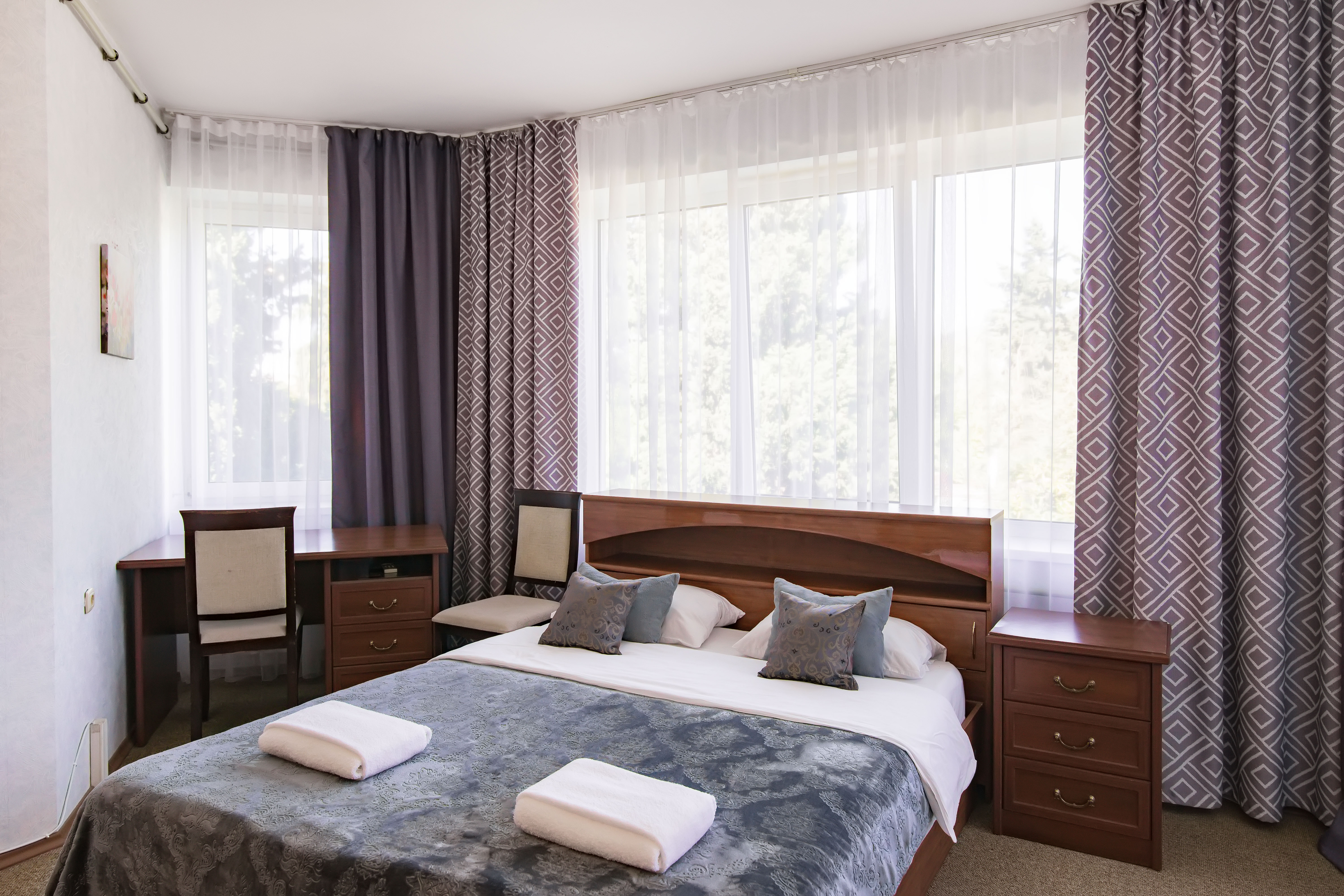 В номере: диван, зеркало, кровать двуспальная, прикроватные тумбочки, стол, стулья, тумба, шкаф, кондиционер, набор посуды, посудомоечная машина, стиральная машина, телевизор, холодильник, электрочайник