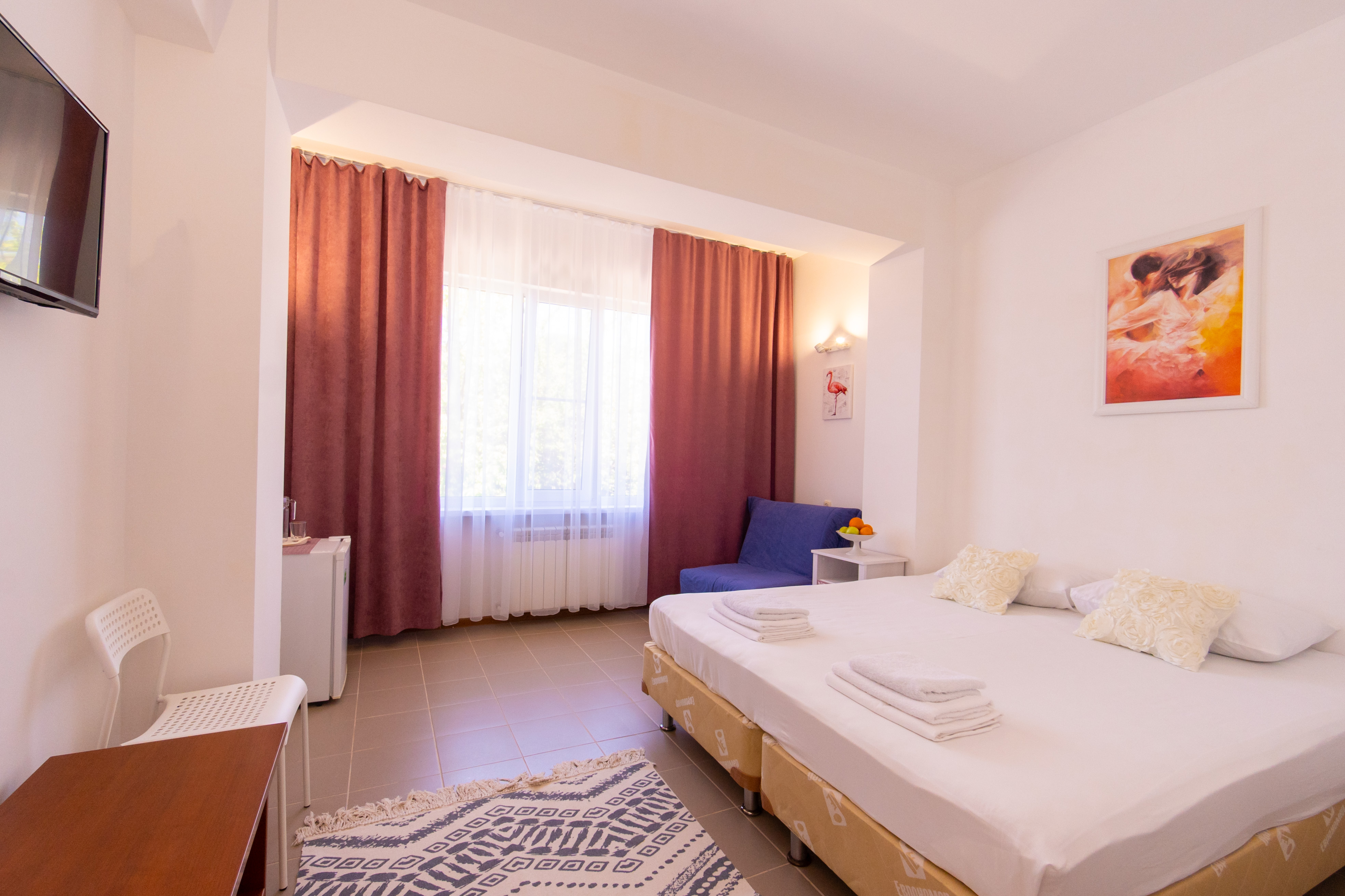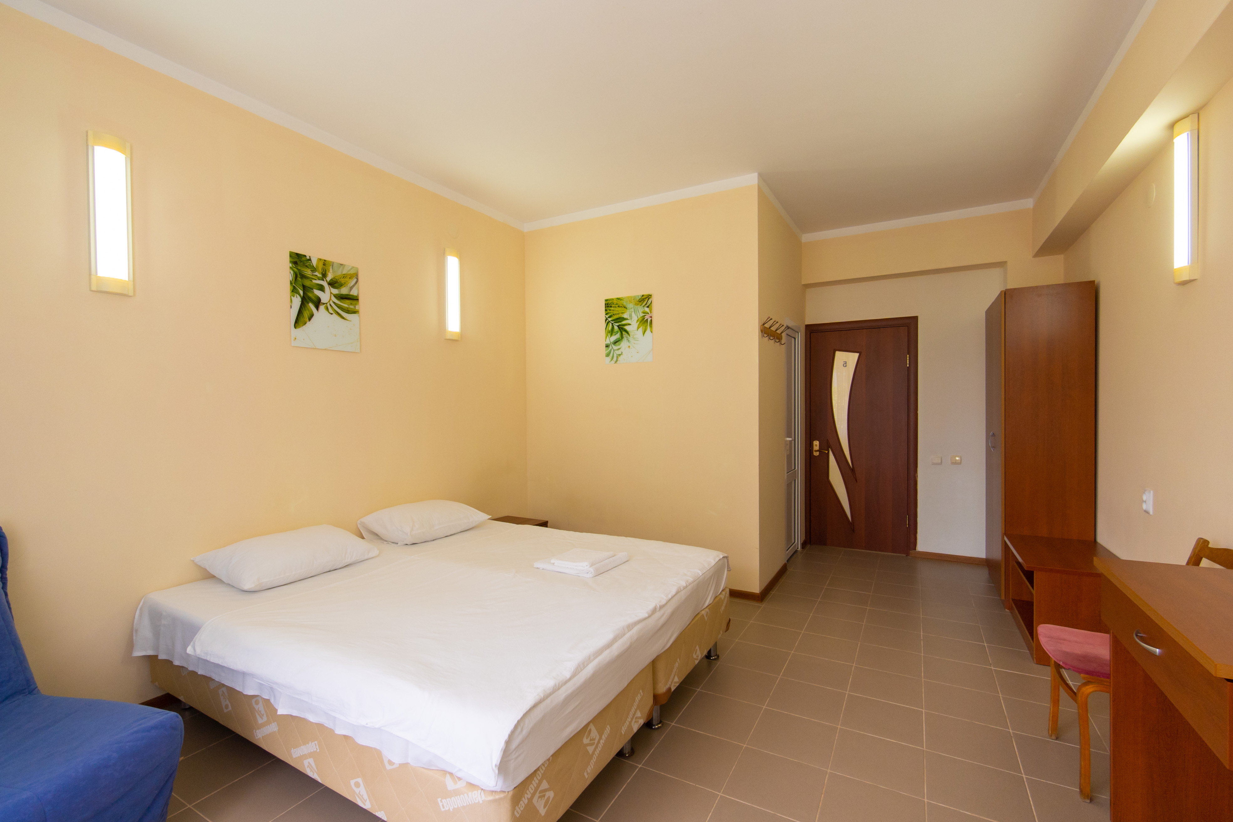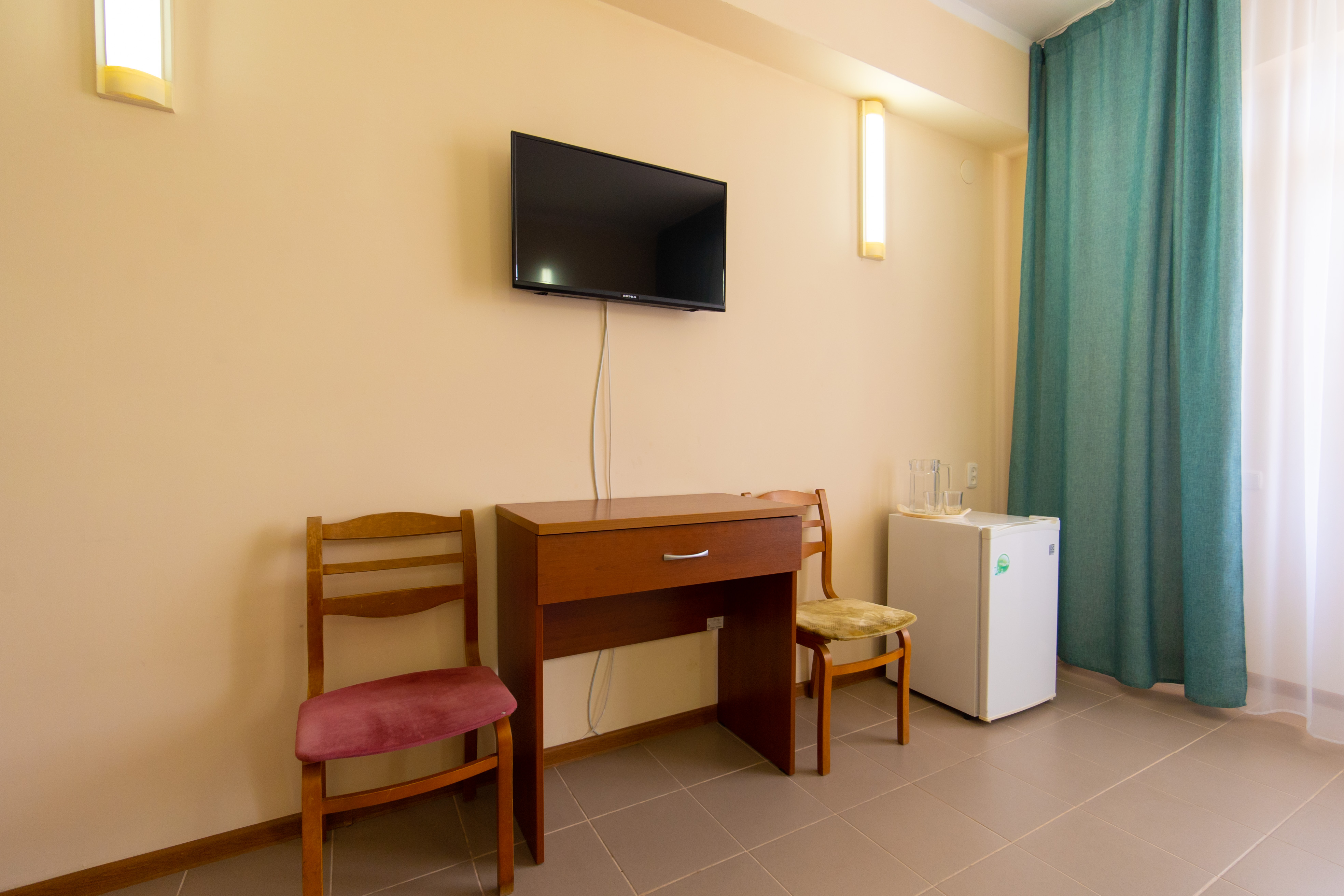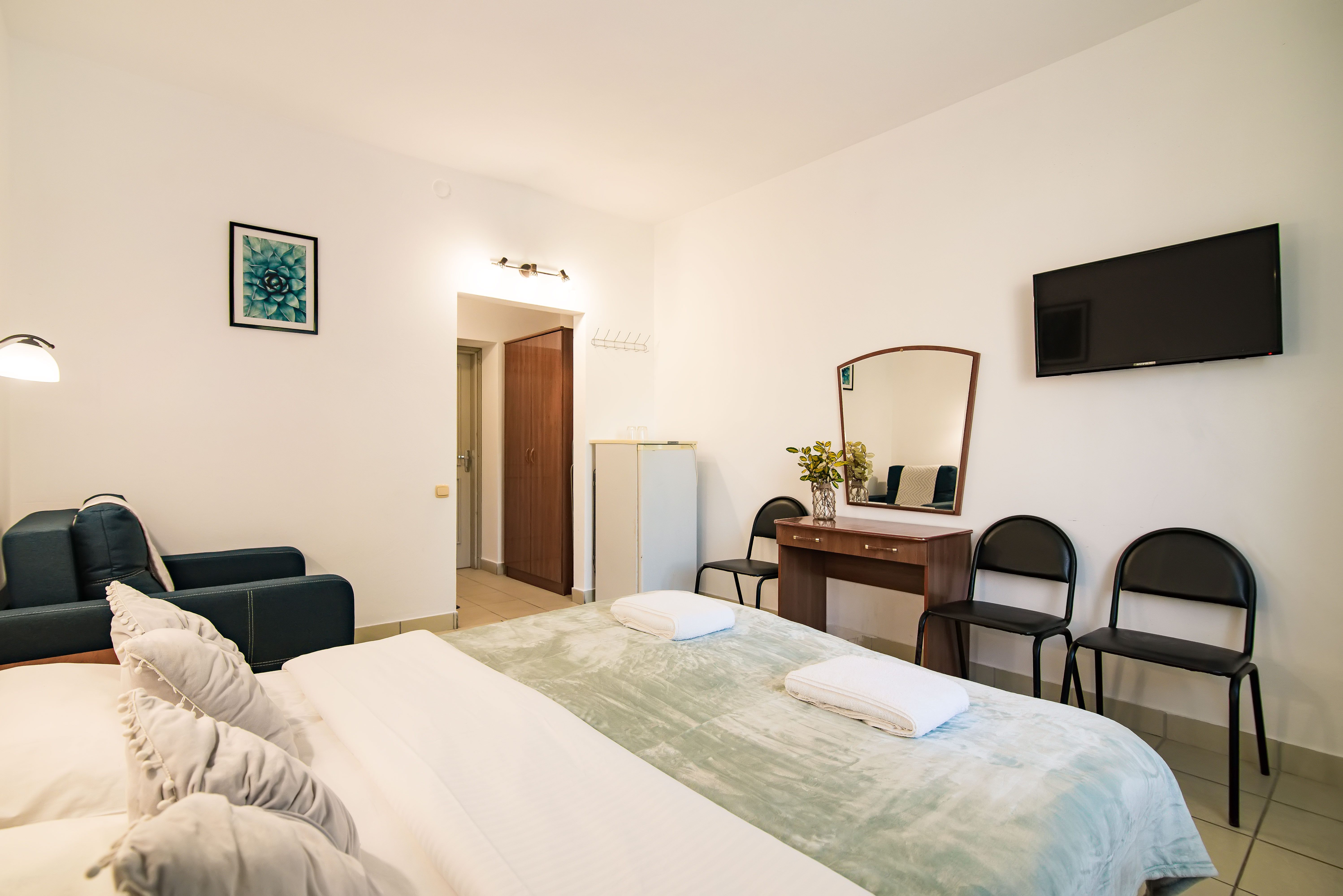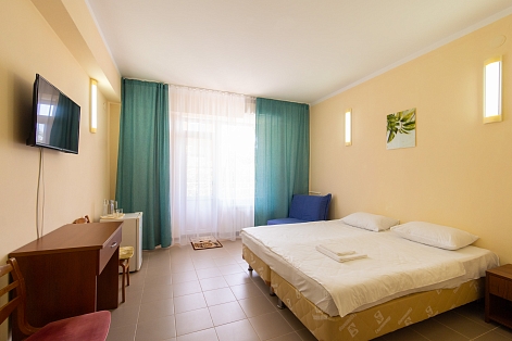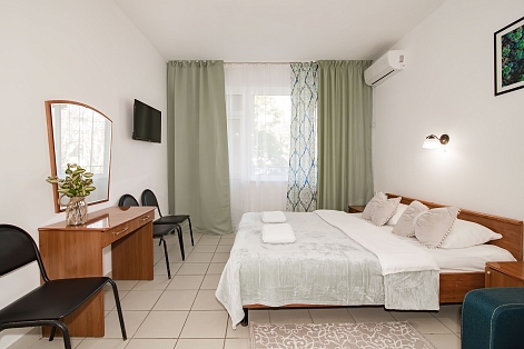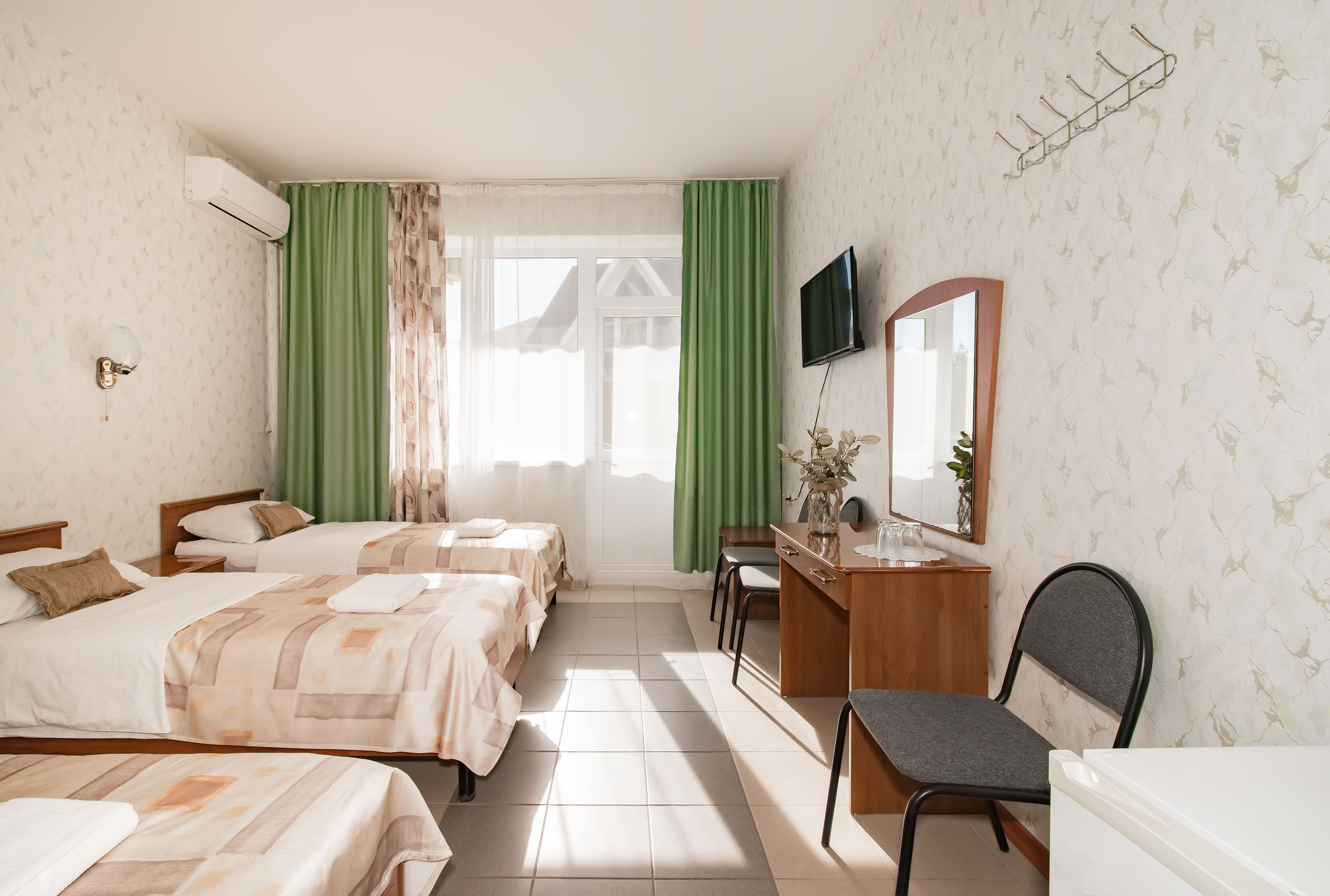 В номере: зеркало, кровати односпальные /одна двуспальная кровать, стол, стулья, шкаф, кондиционер, телевизор, холодильник