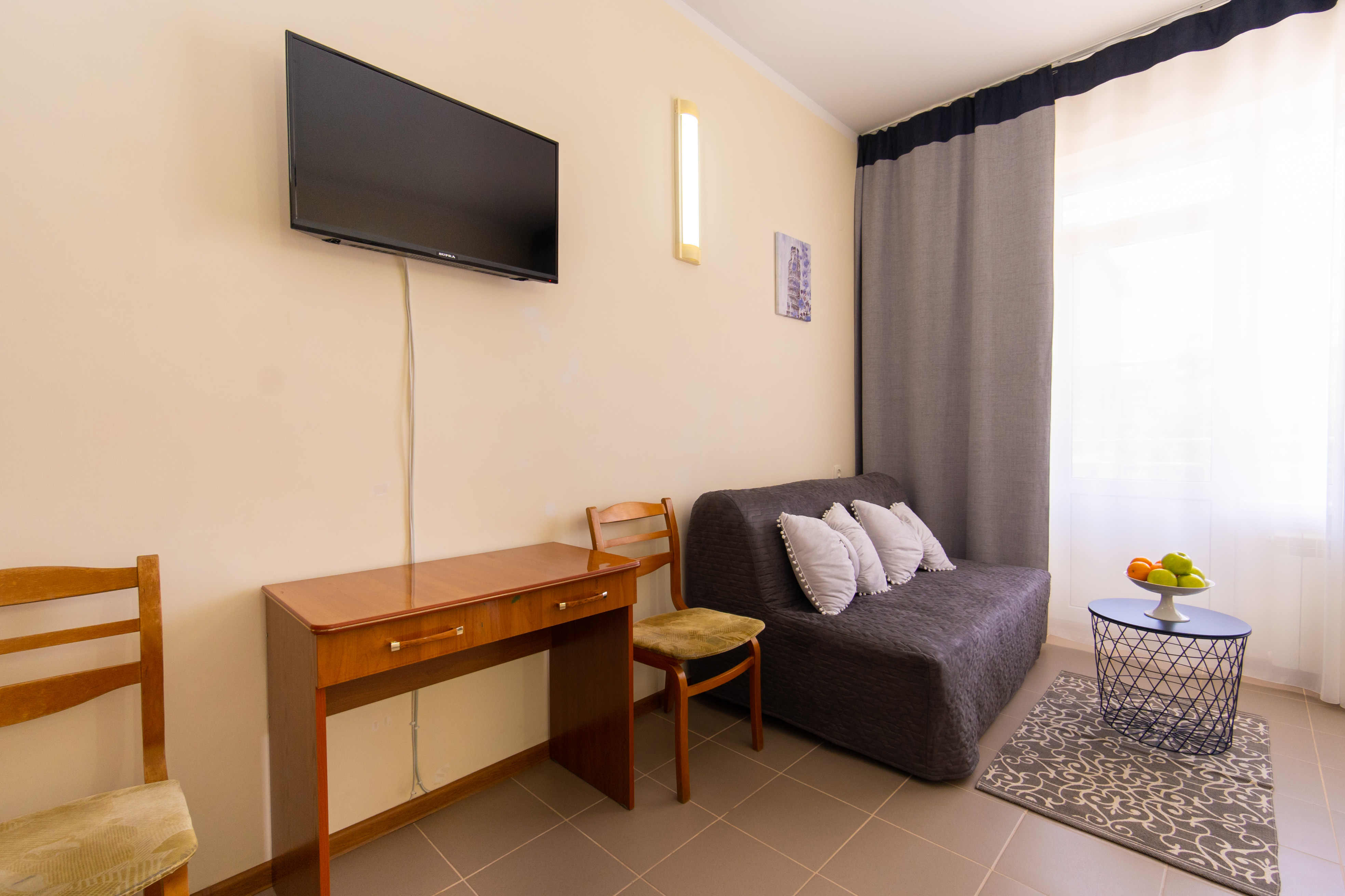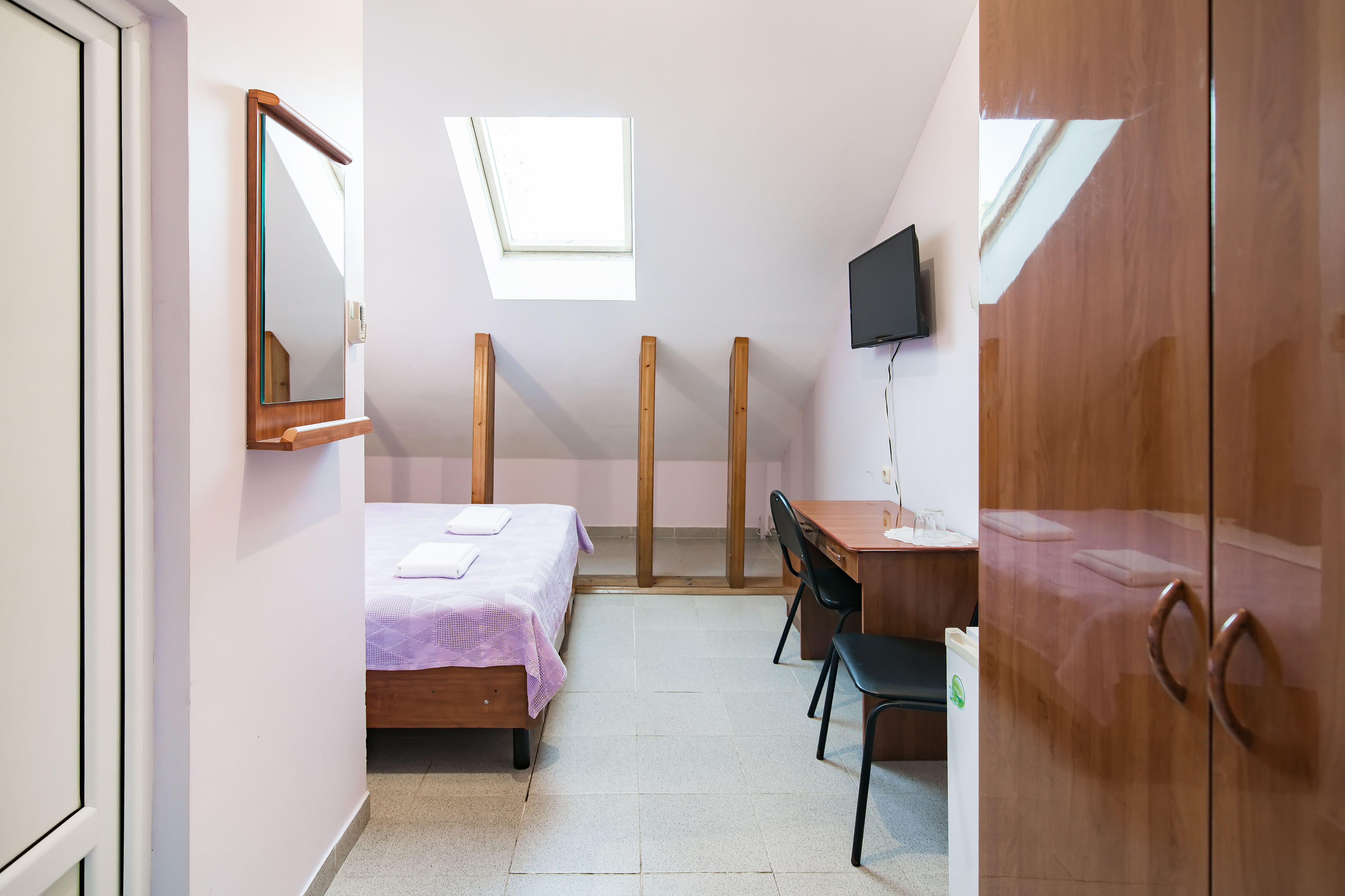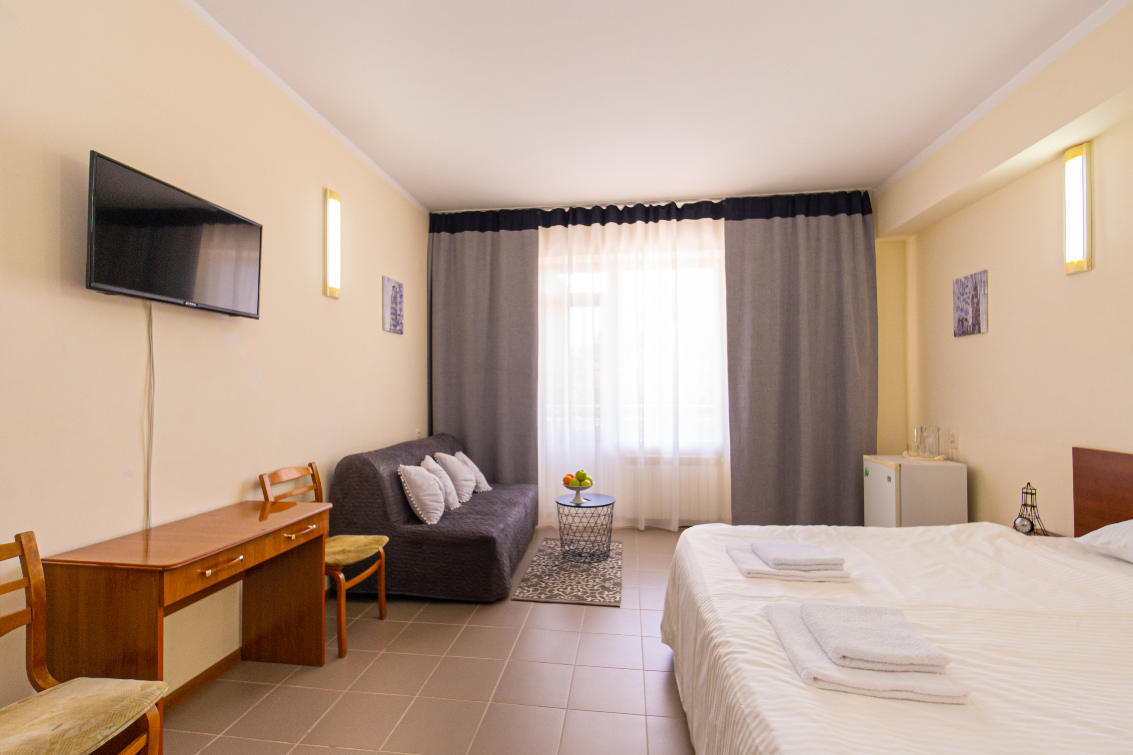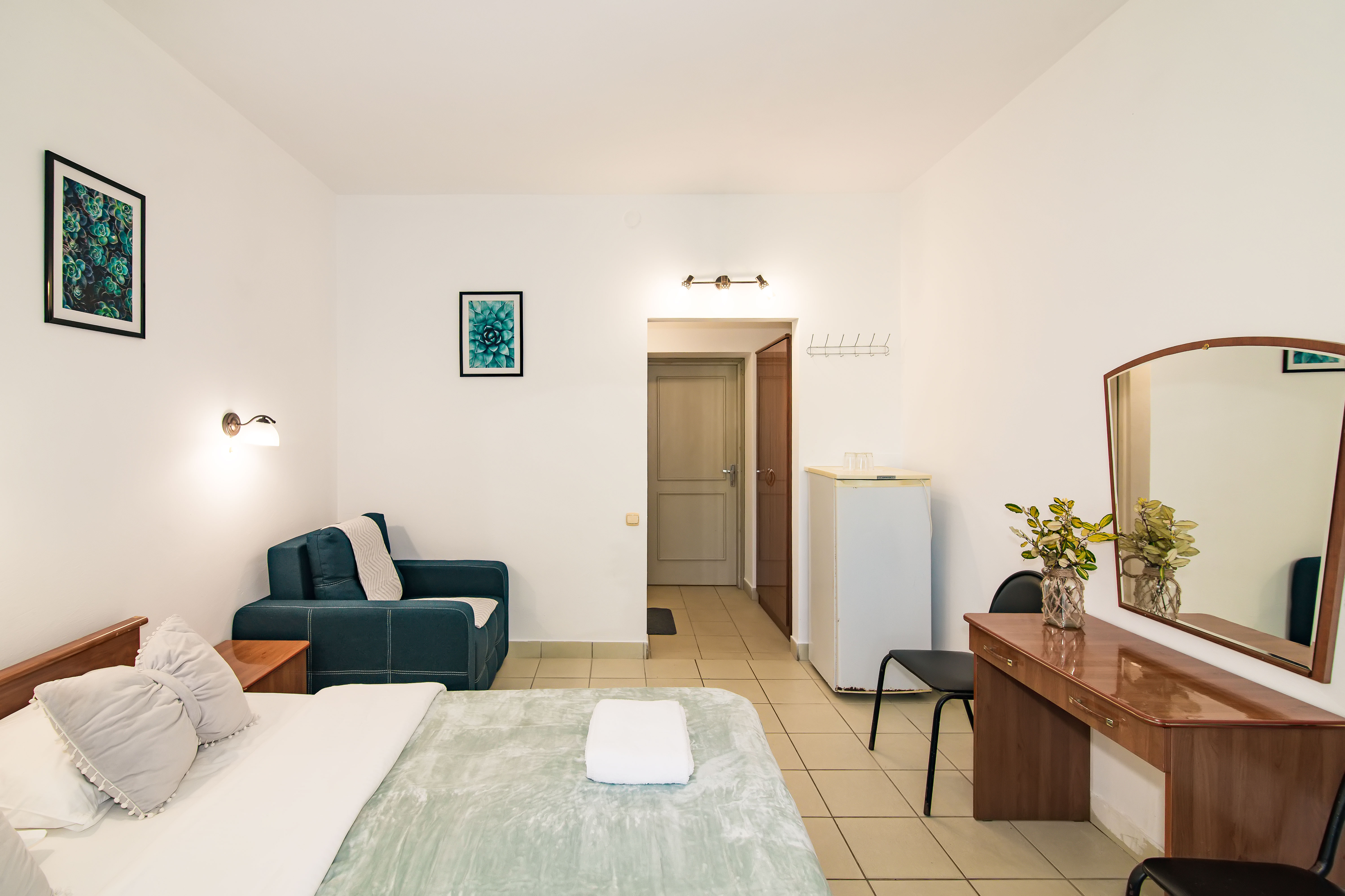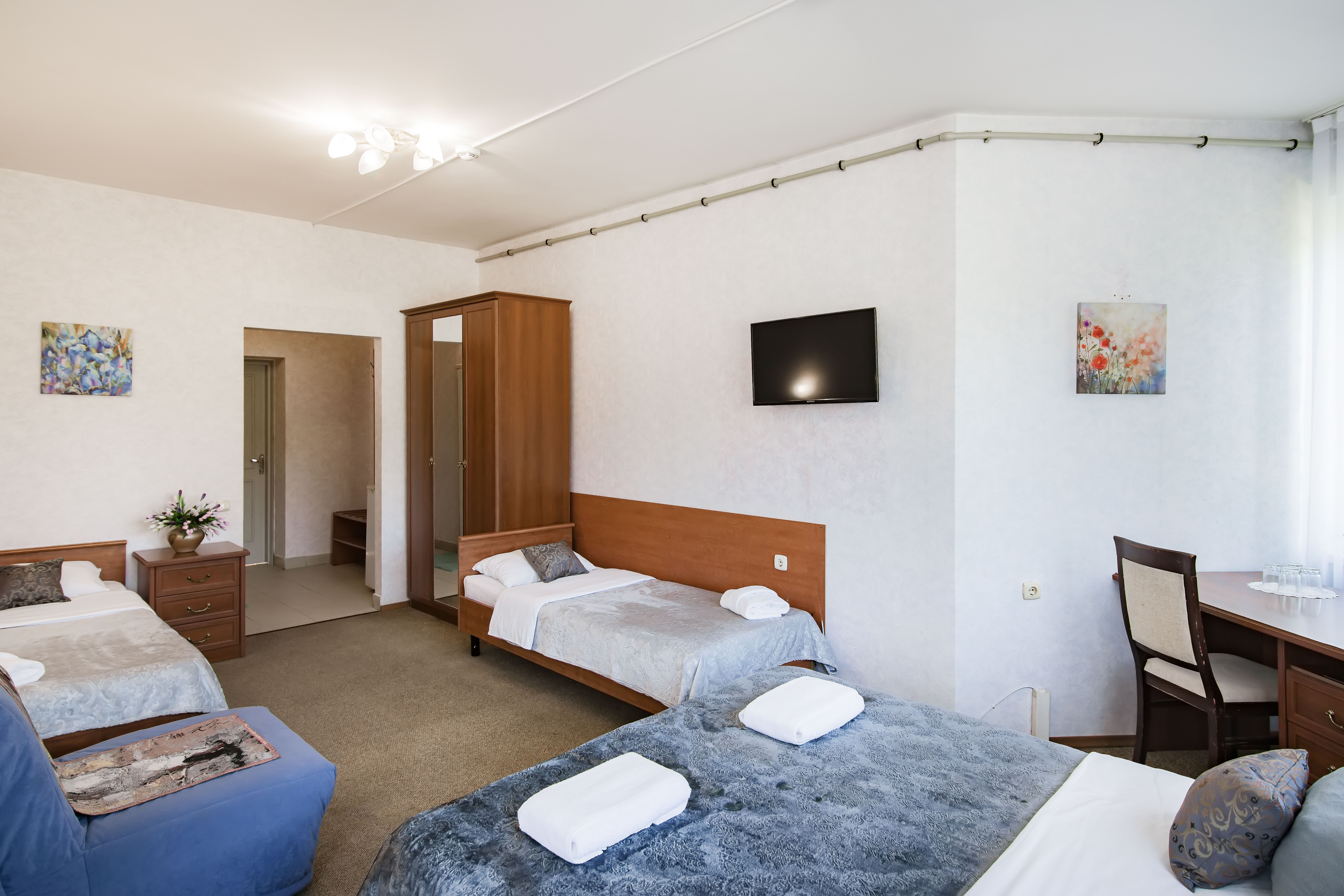 В номере: зеркало, кровати односпальные /одна двуспальная кровать, стол, стулья, шкаф, кондиционер, телевизор, холодильник