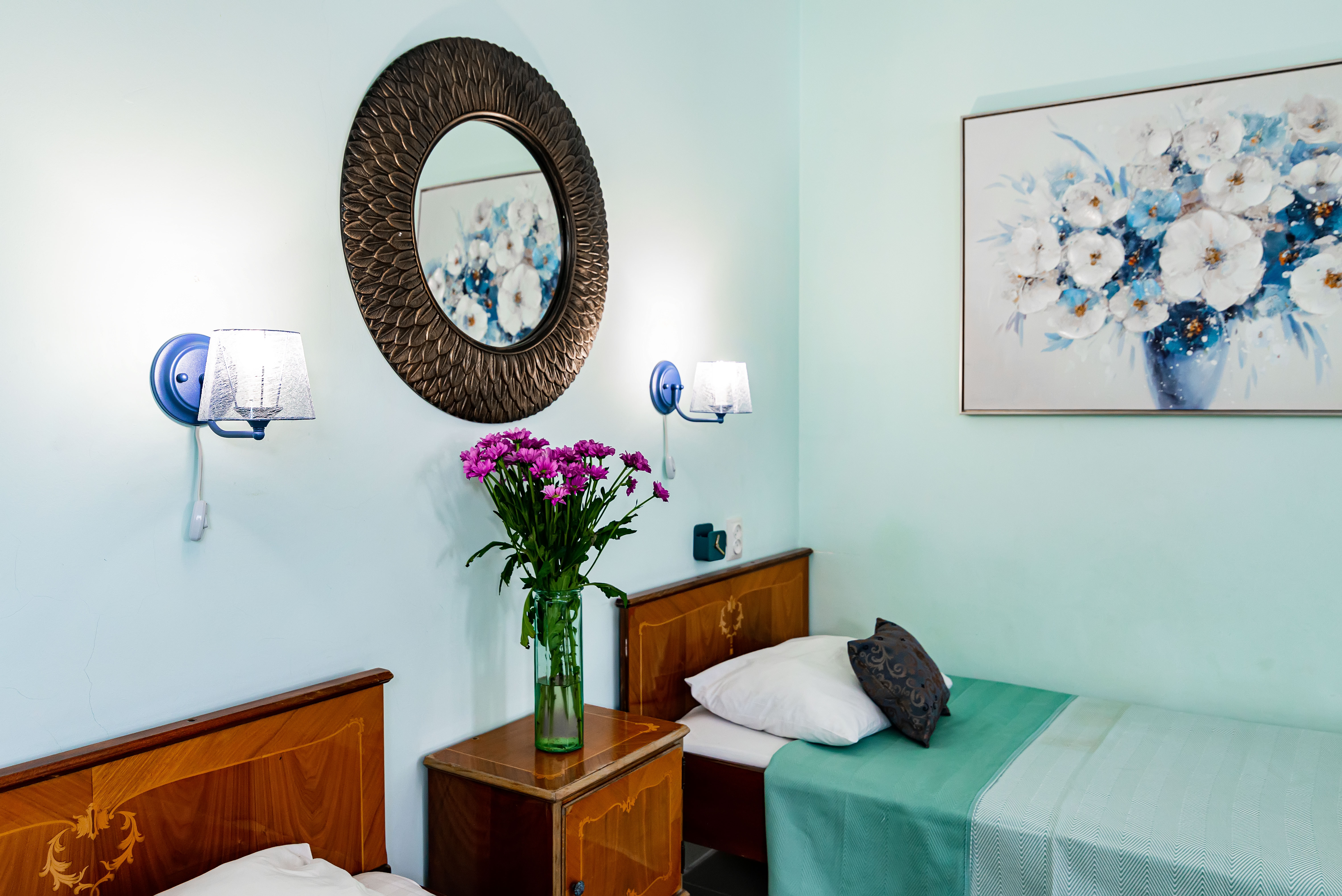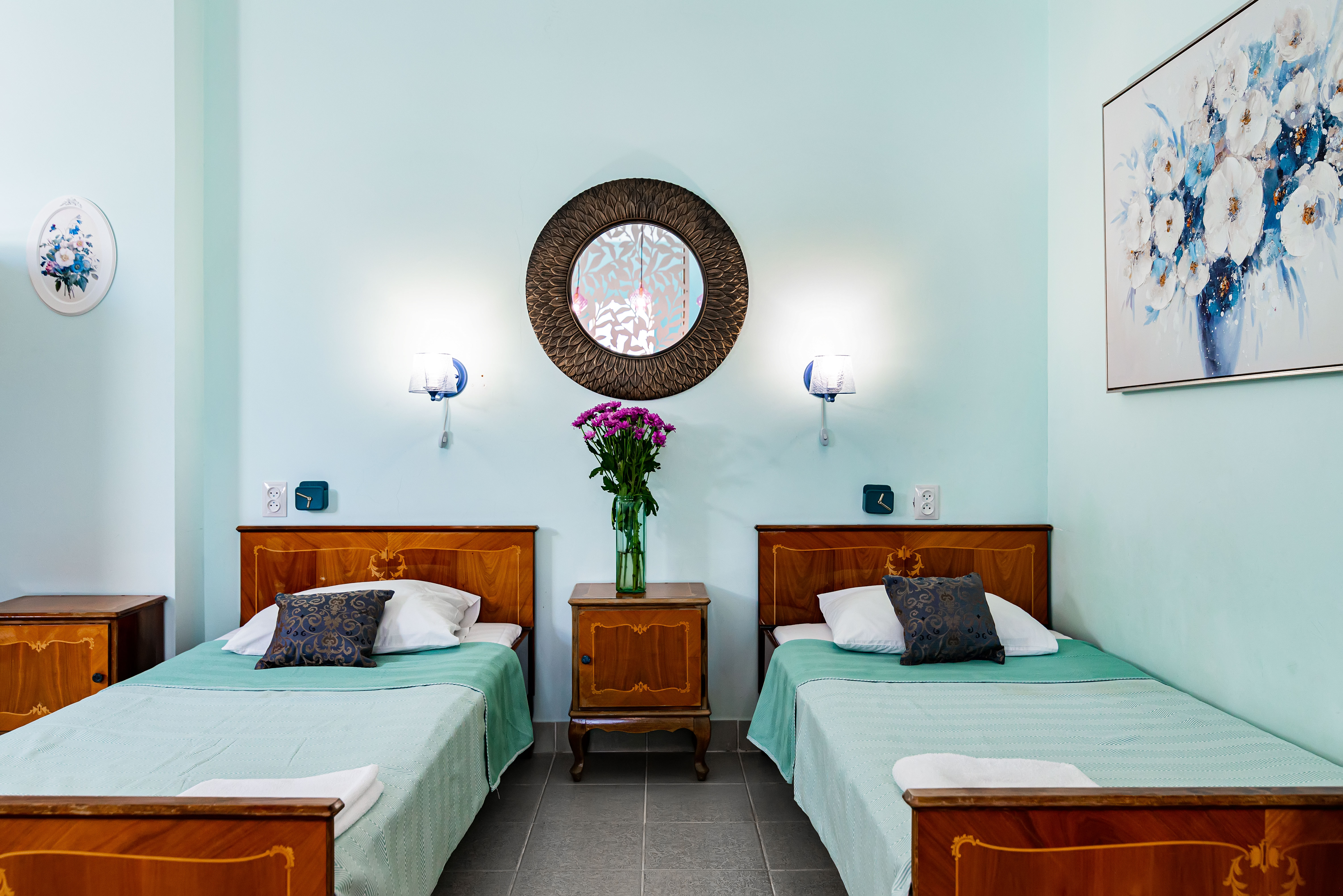 В номере: зеркало, кровати односпальные, прикроватные тумбочки, стол, стул, кондиционер, телевизор, холодильник