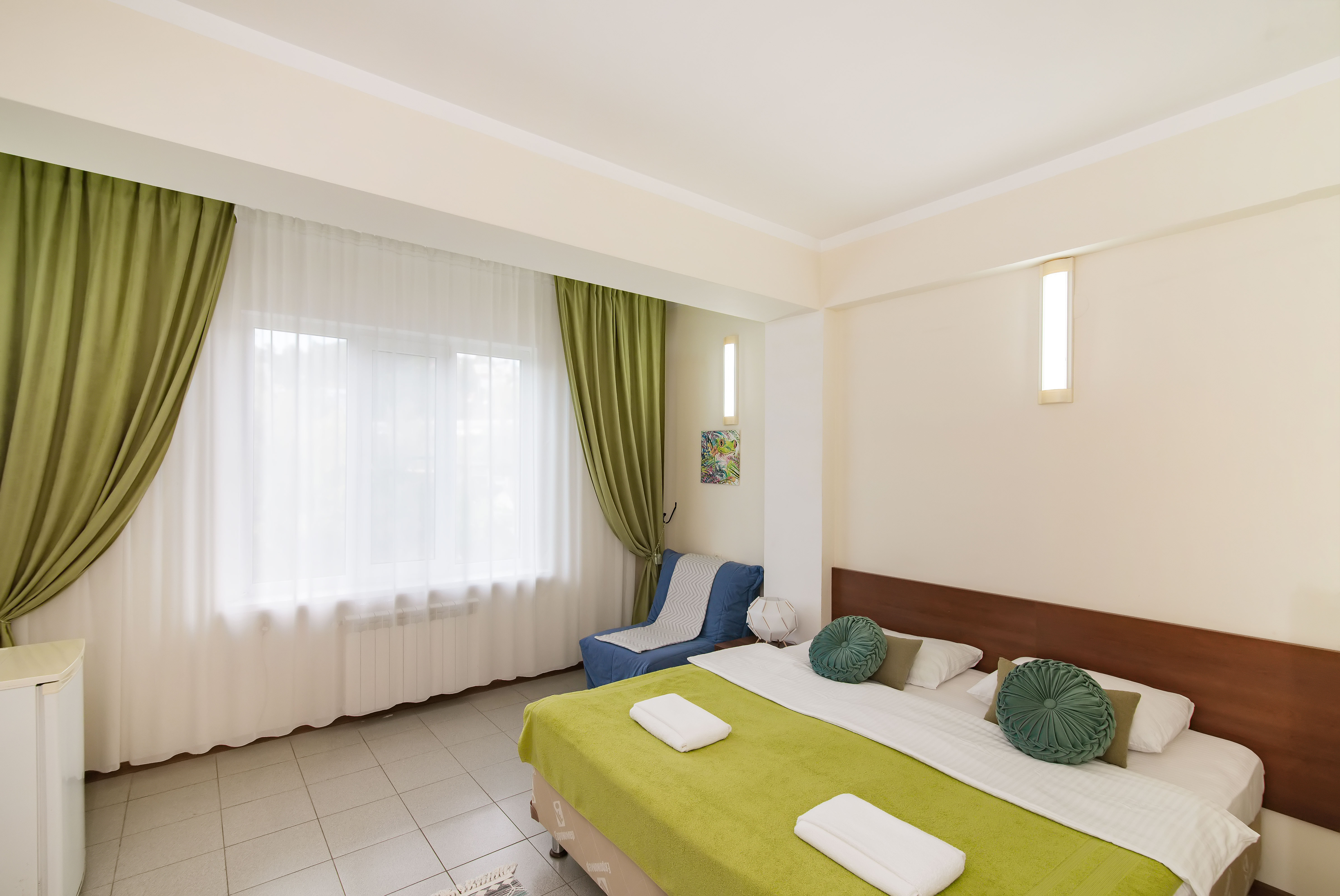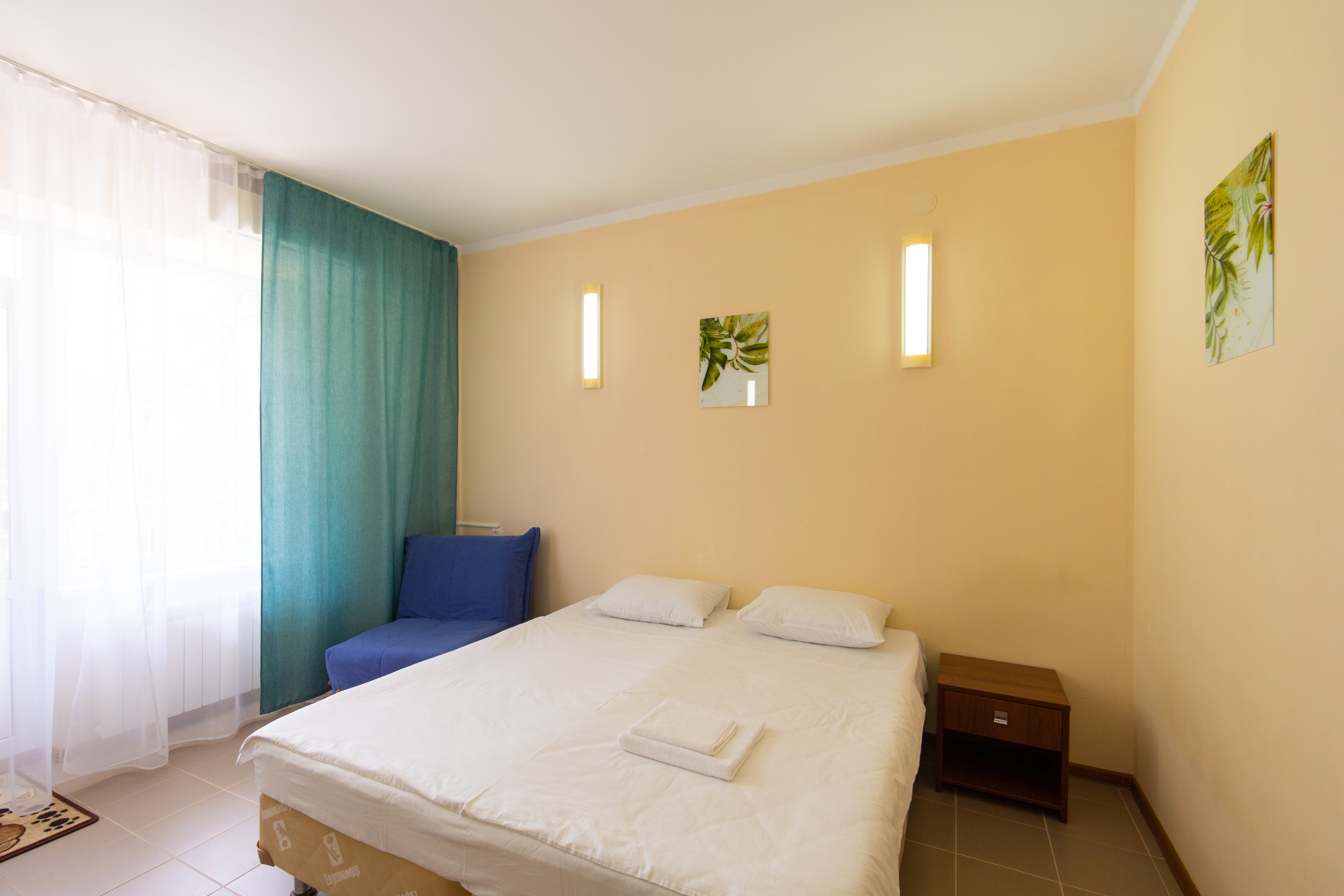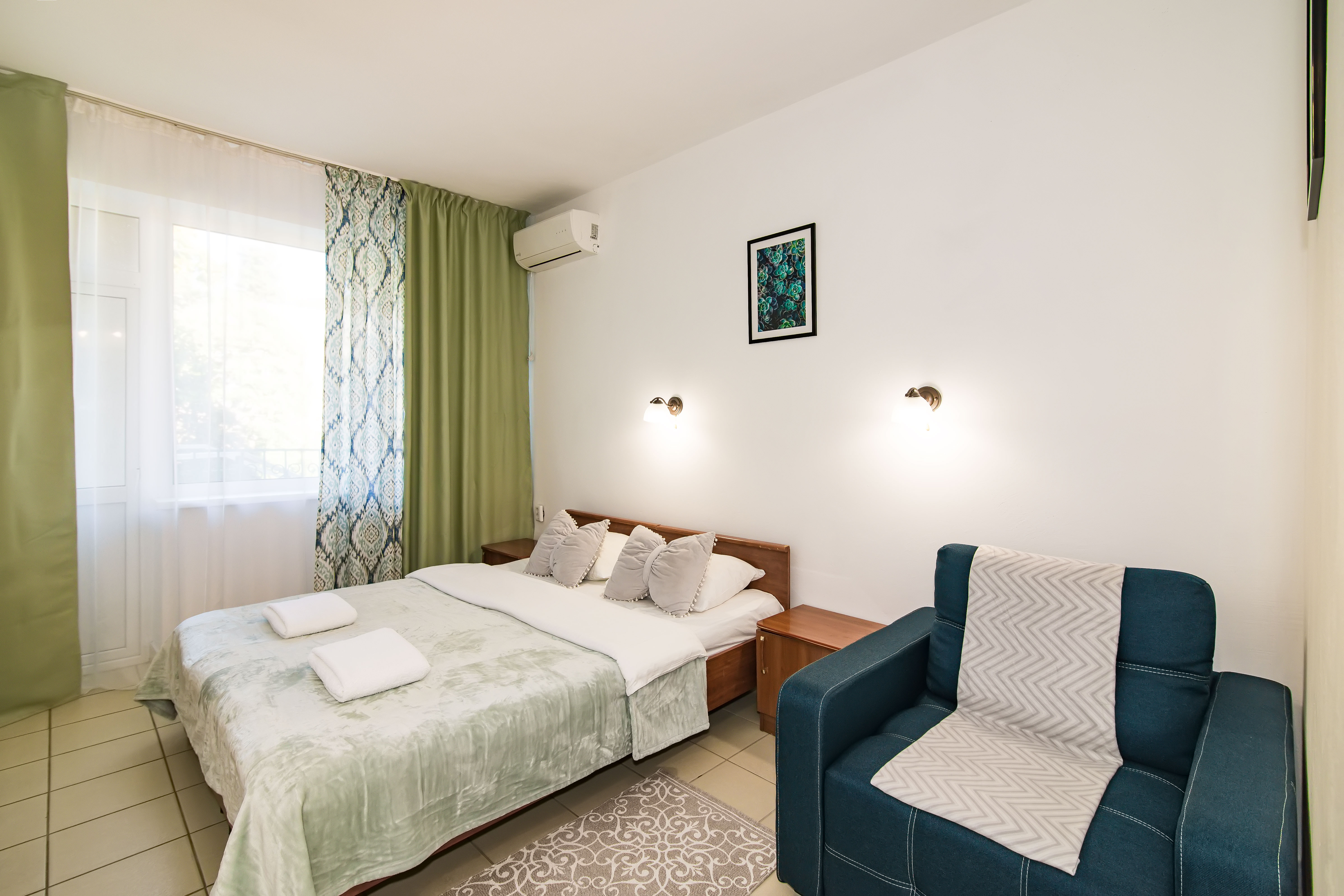 В номере: зеркало, кресло-кровать, кровати односпальные /одна двуспальная кровать, прикроватные тумбочки, стол, стул, шкаф, кондиционер, телевизор, холодильник
