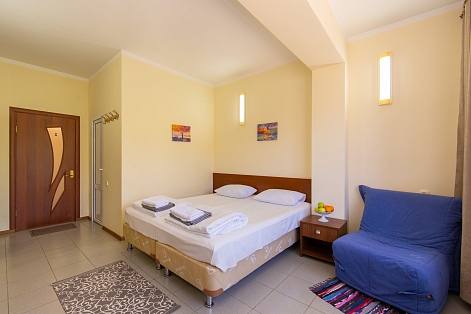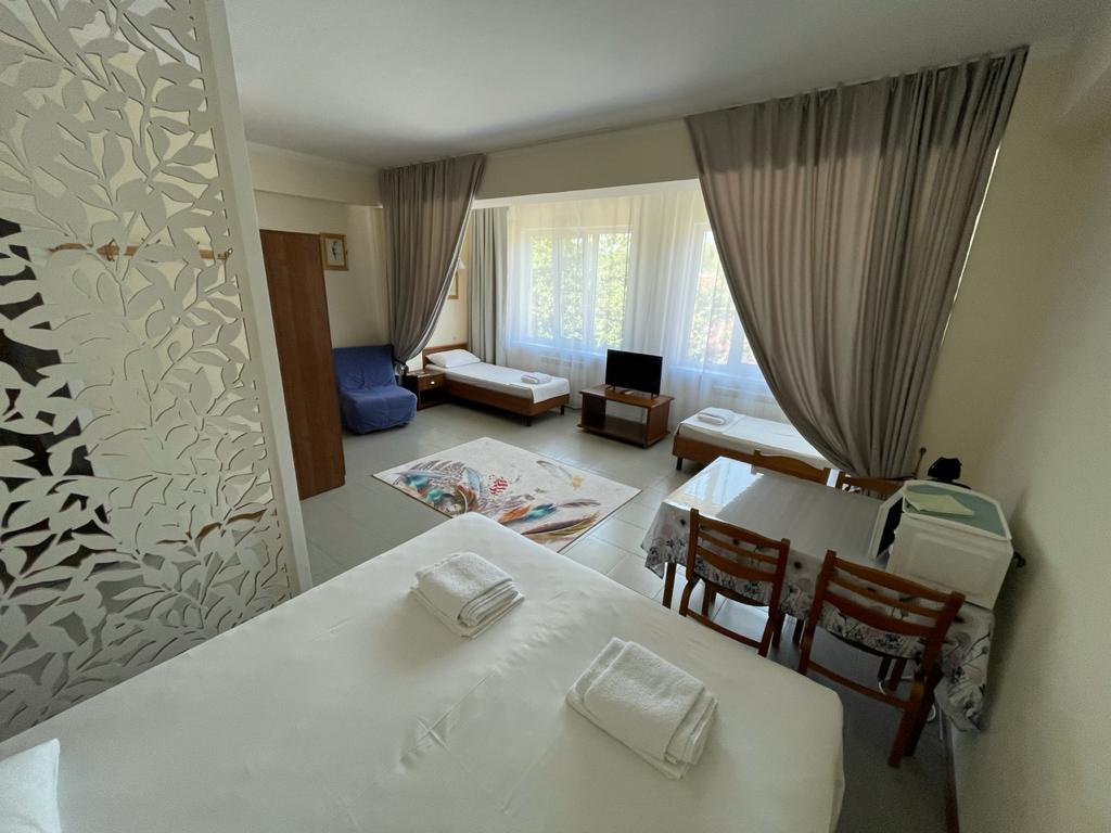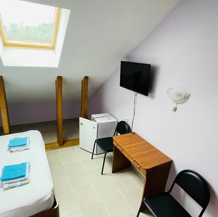 До адлерского вокзала чуть больше 5 километров, до аэропорта — около 9. Четырехэтажный корпус с мансардой разместился в 300 метрах от морского побережья. Отдыхающих ожидают номера стандарт, рассчитанные на заселение 2-х, 3-х и 4-х гостей. В номерах имеется все для комфортного проживания: индивидуальный санузел, телевизор, холодильник, кондиционер. При гостевом доме работает столовая, где можно заказать блюда европейской и кавказской кухонь. Отдыхающим доступны автостоянка и сеть wi-fi. В 4 минутах ходьбы разместился пляж, покрытый мелкой галькой и песком. Пляж хорошо оборудован: вдоль побережья установлены раздевалки, душевые, навесы, работает прокат зонтиков и шезлонгов, много водных развлечений.