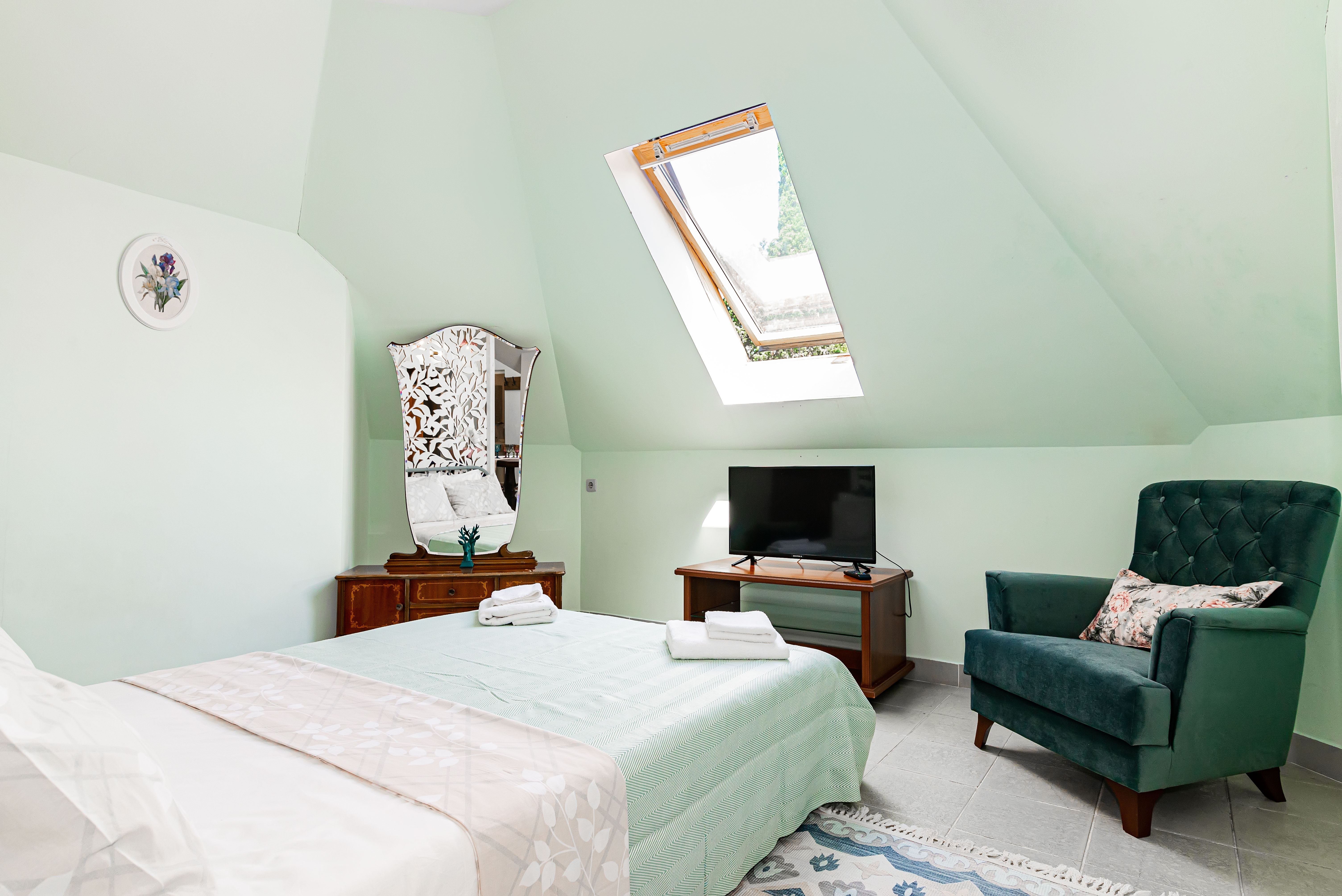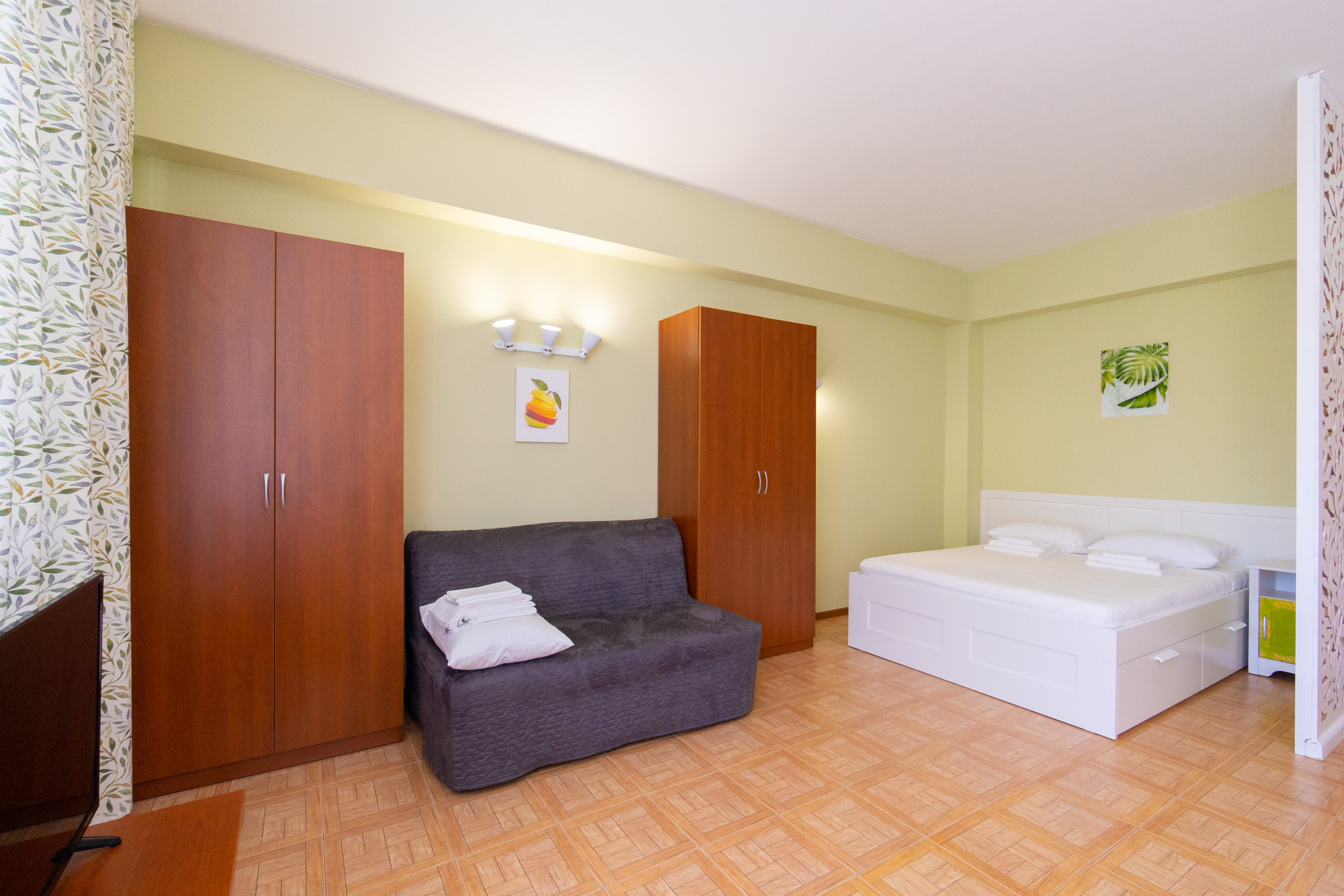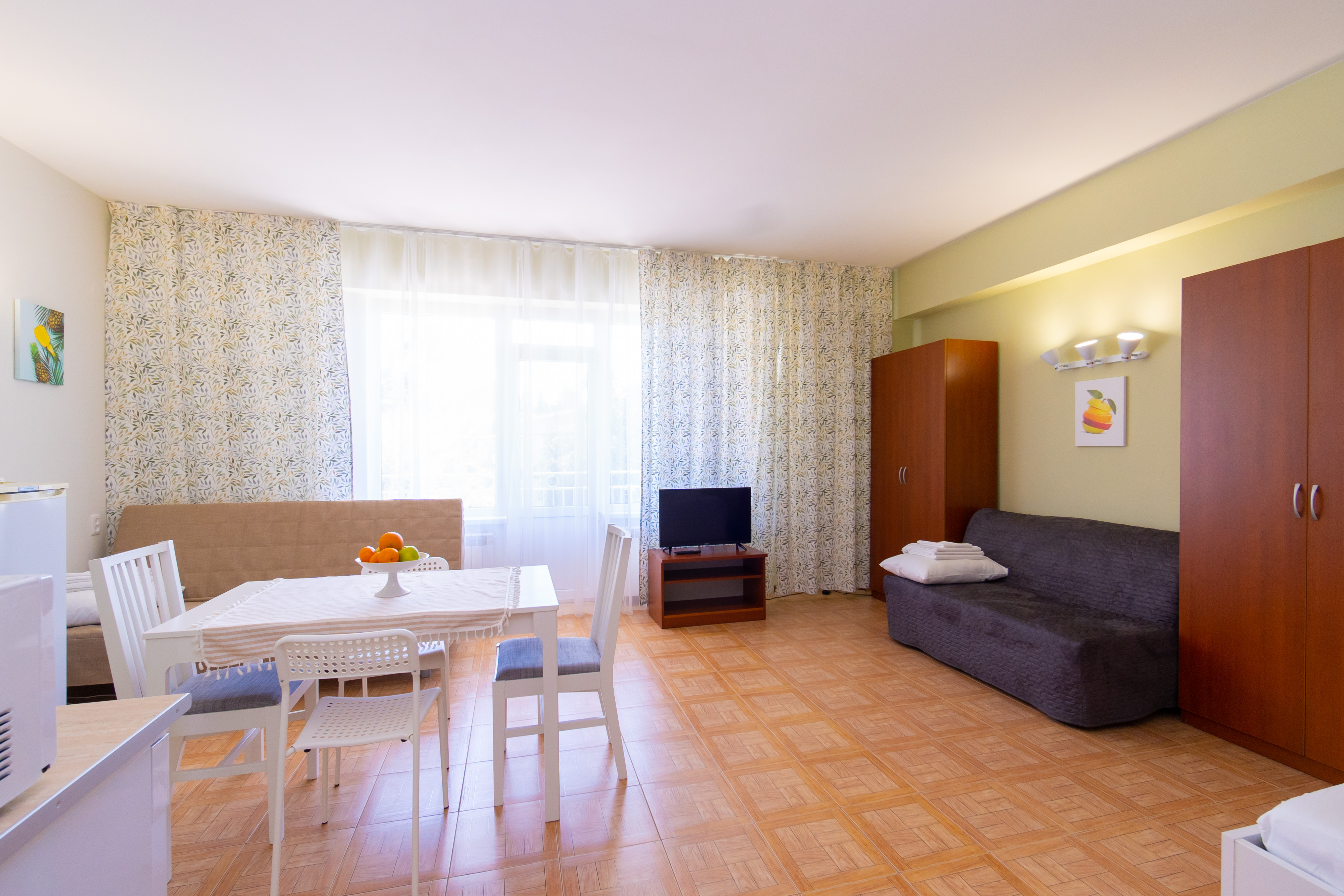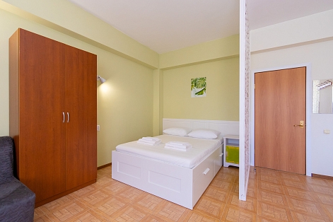В номере: диван, зеркало, кровать двуспальная, кухонная мебель, стол, стулья, шкаф, кондиционер, микроволновая печь, посудомоечная машина, стиральная машина, телевизор, холодильник, чайная станция