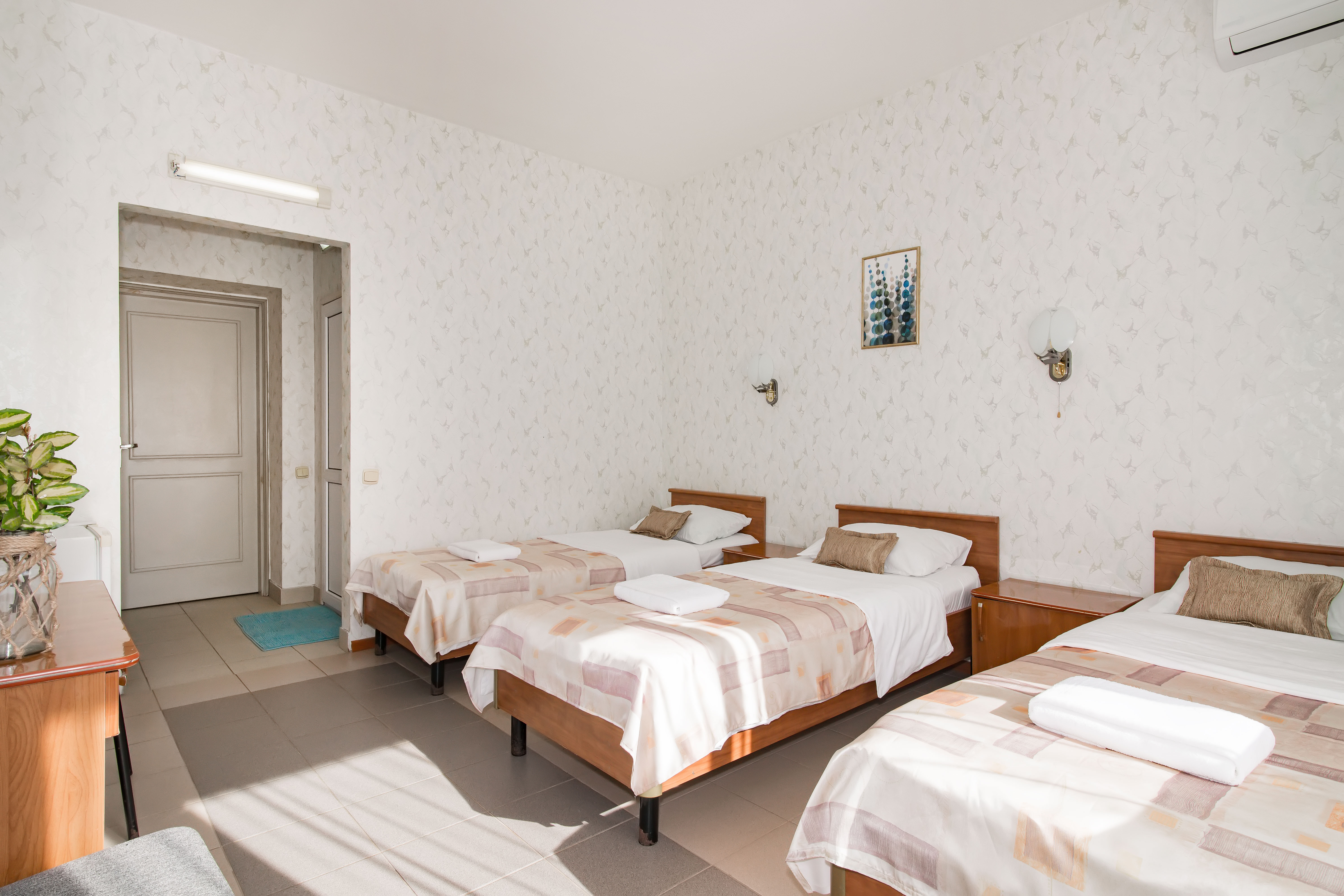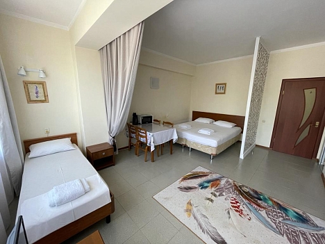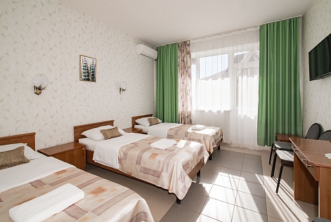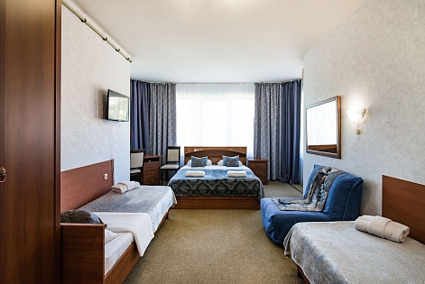 В номере: зеркало, кресло-кровать, кровати односпальные, кровать двуспальная, стол, стул, кондиционер, телевизор, холодильник