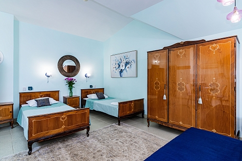 В номере: зеркало, кровати односпальные, кровать двуспальная, прикроватные тумбочки, стол, стулья, шкаф, кондиционер, телевизор, холодильник