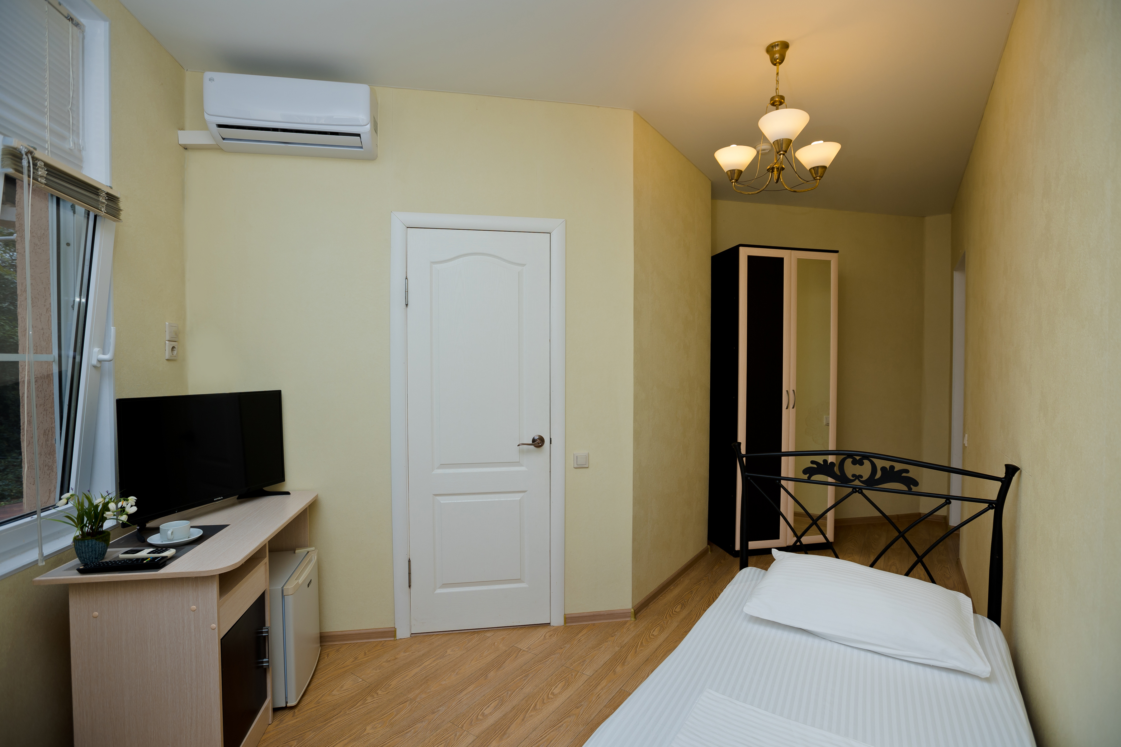 В номере: зеркало, кровать односпальная, прикроватная тумбочка, пуфик, стол, шкаф, кондиционер, мини-холодильник, сейф, телевизор ЖК