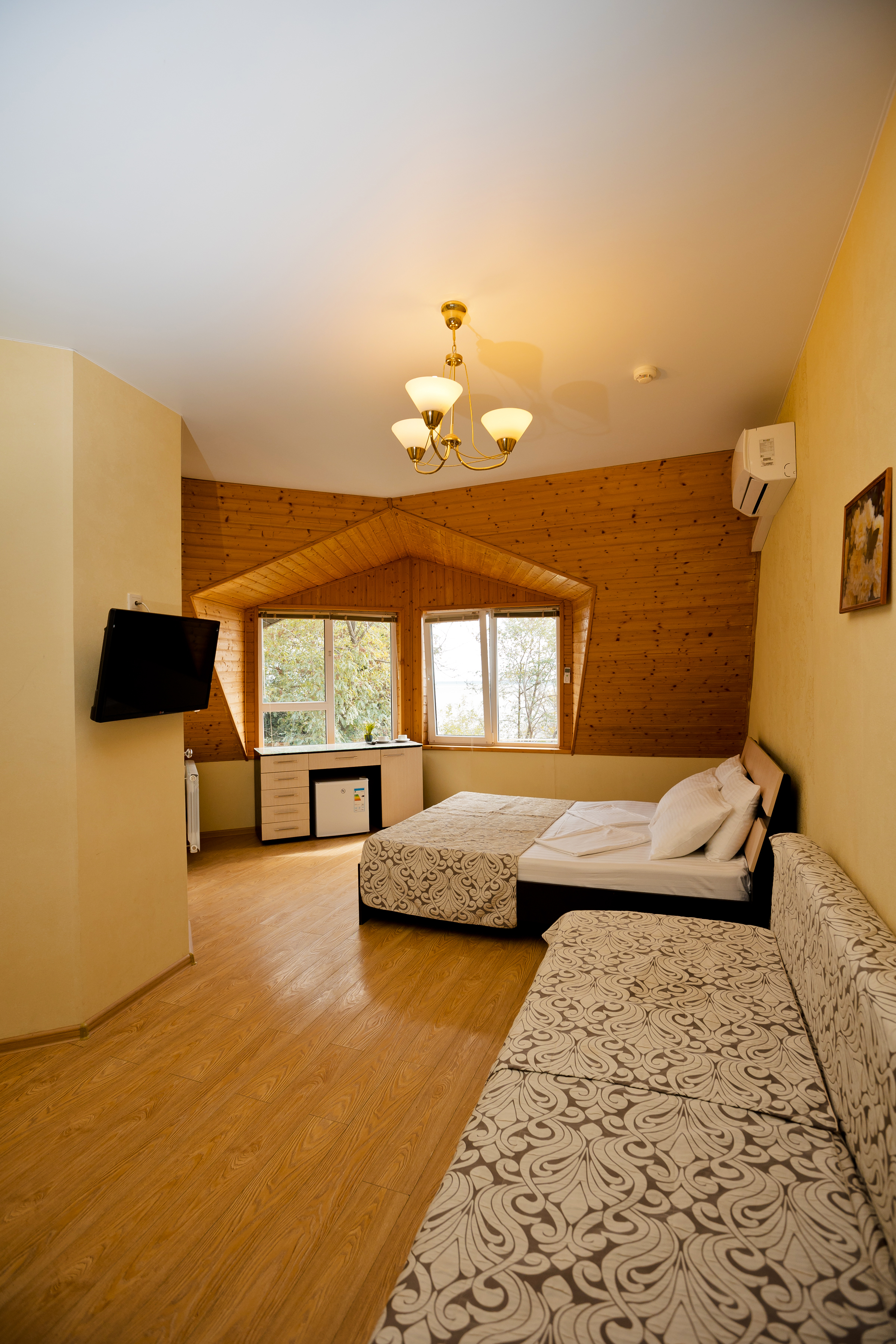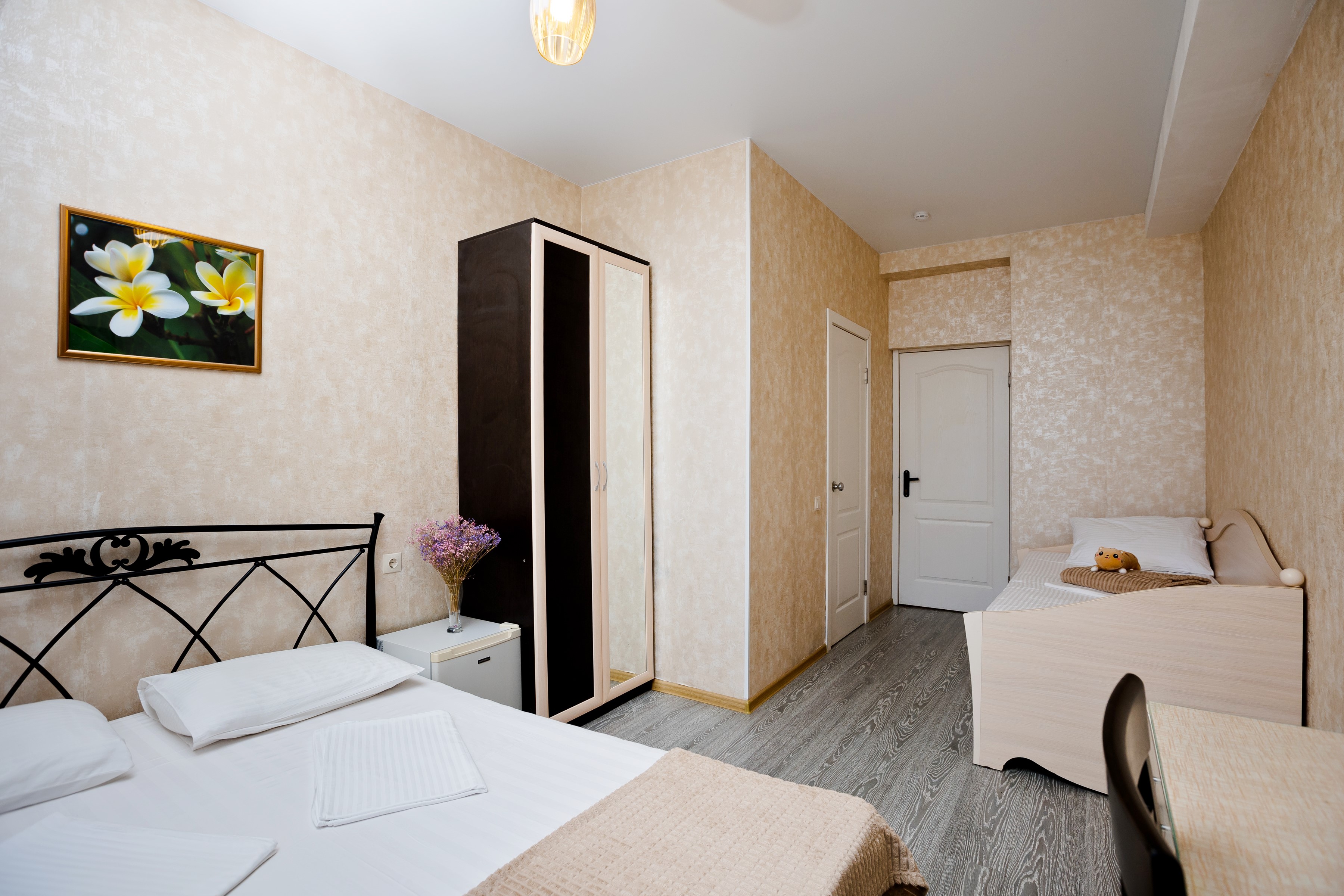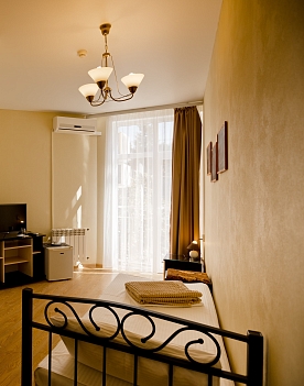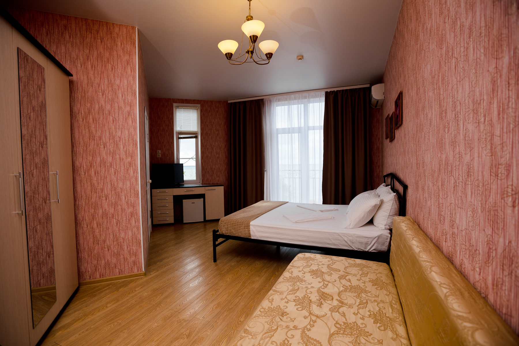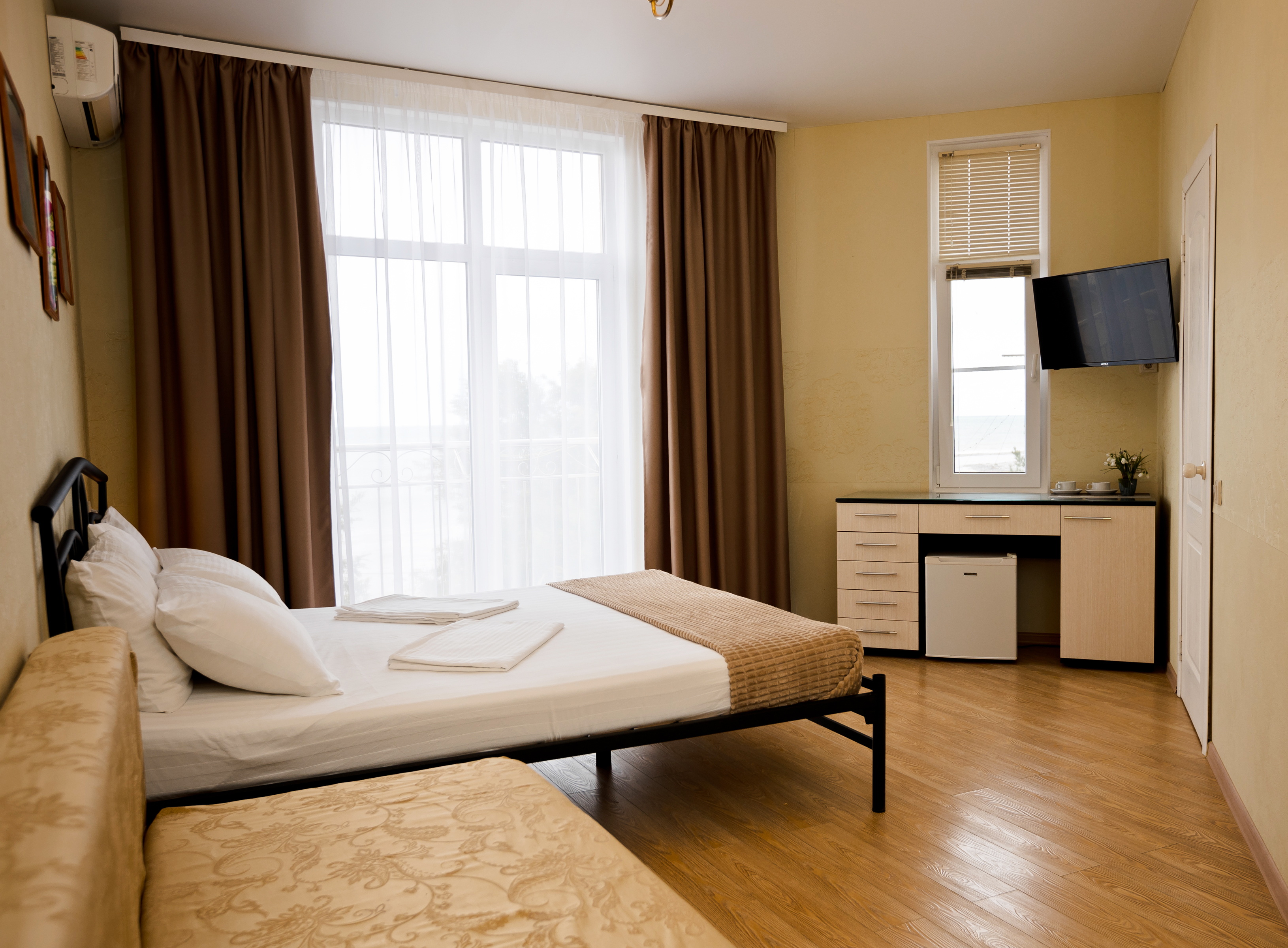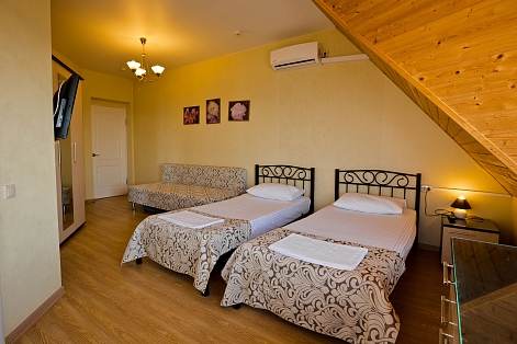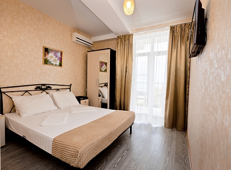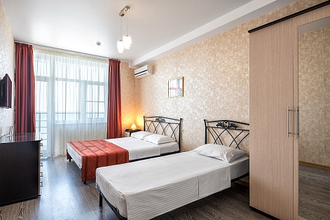 В номере: диван раскладной, зеркало, кровати односпальные /одна двуспальная кровать, прикроватная тумбочка, стол, стул, шкаф-купе, кондиционер, мини-холодильник, сейф, телевизор ЖК