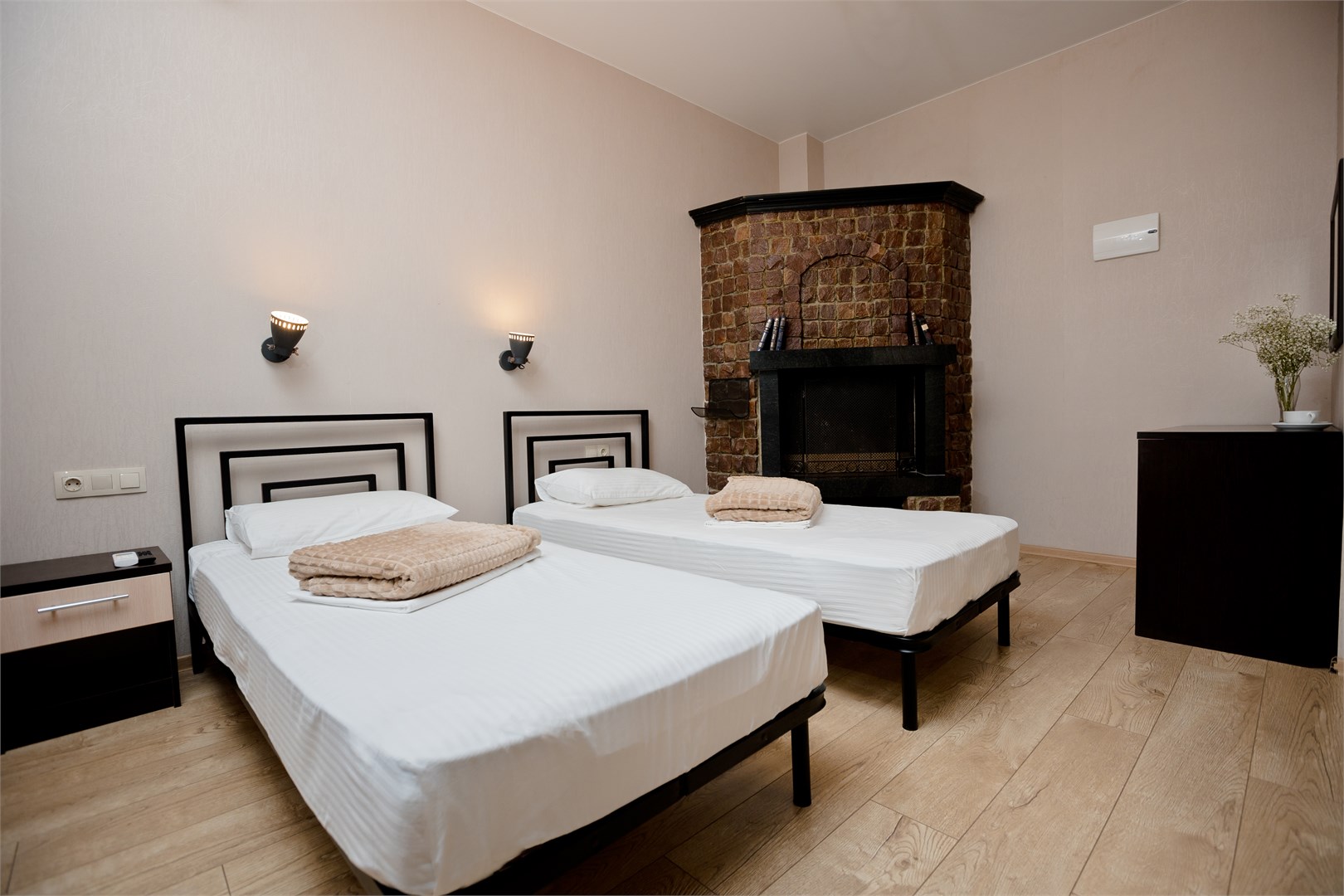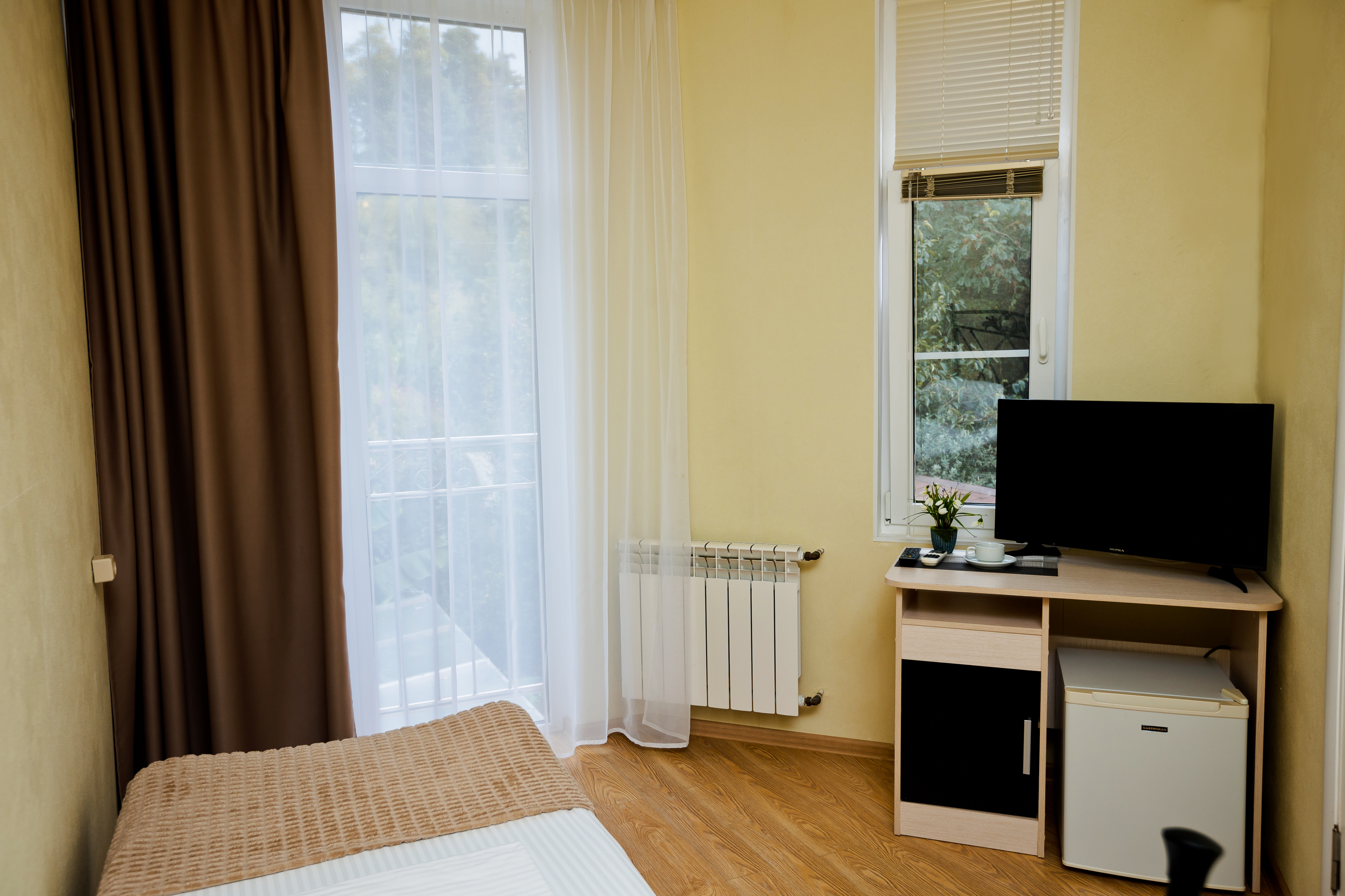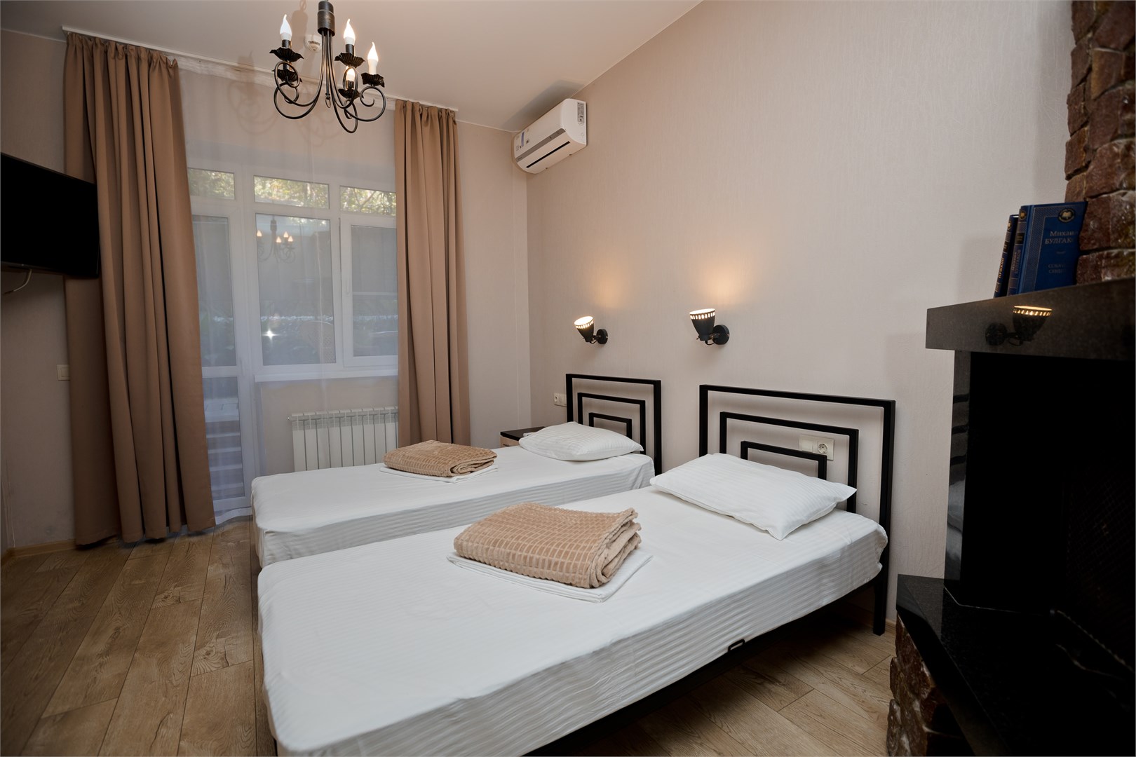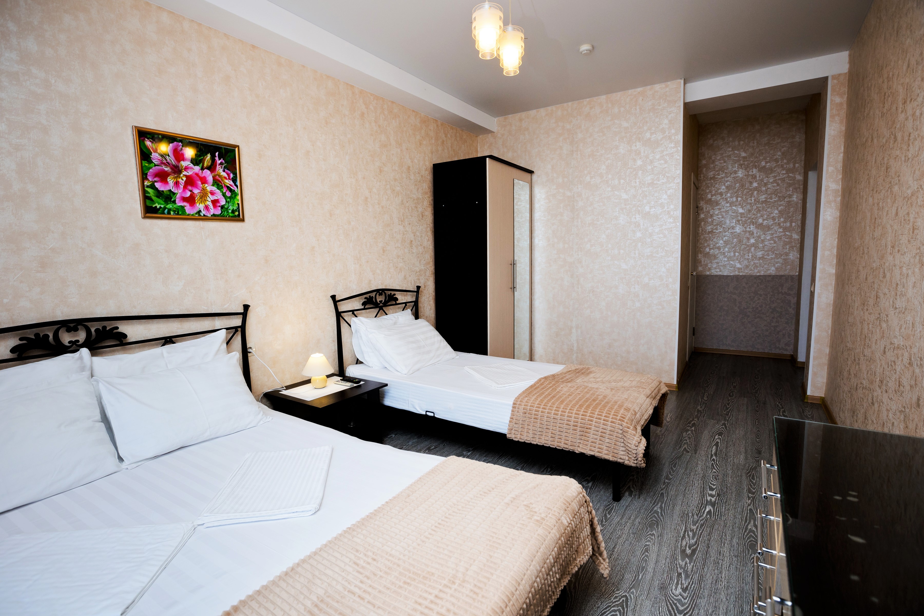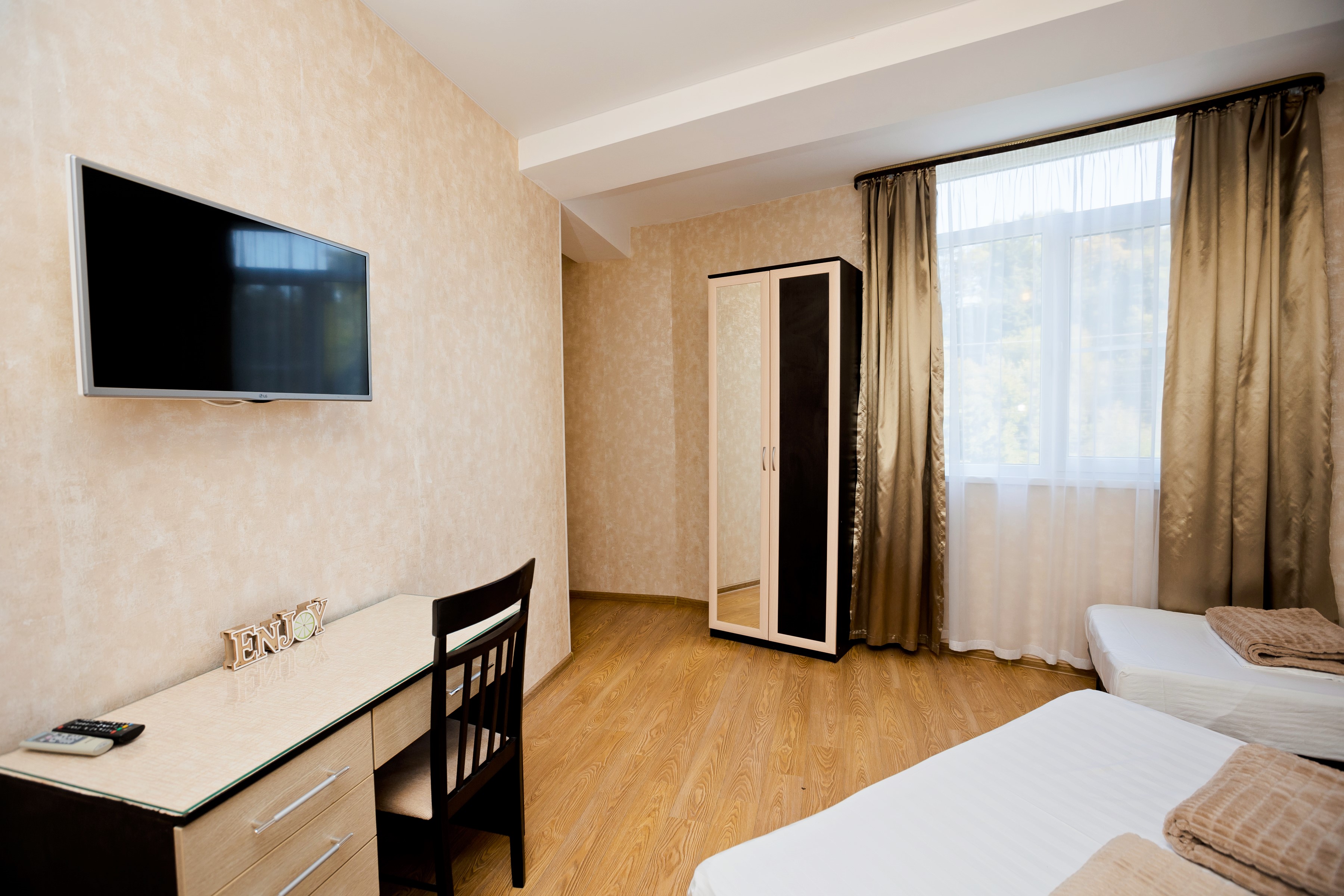 В номере: диван раскладной, зеркало, кровати односпальные /одна двуспальная кровать, прикроватная тумбочка, стол, стул, шкаф-купе, кондиционер, мини-холодильник, сейф, телевизор ЖК