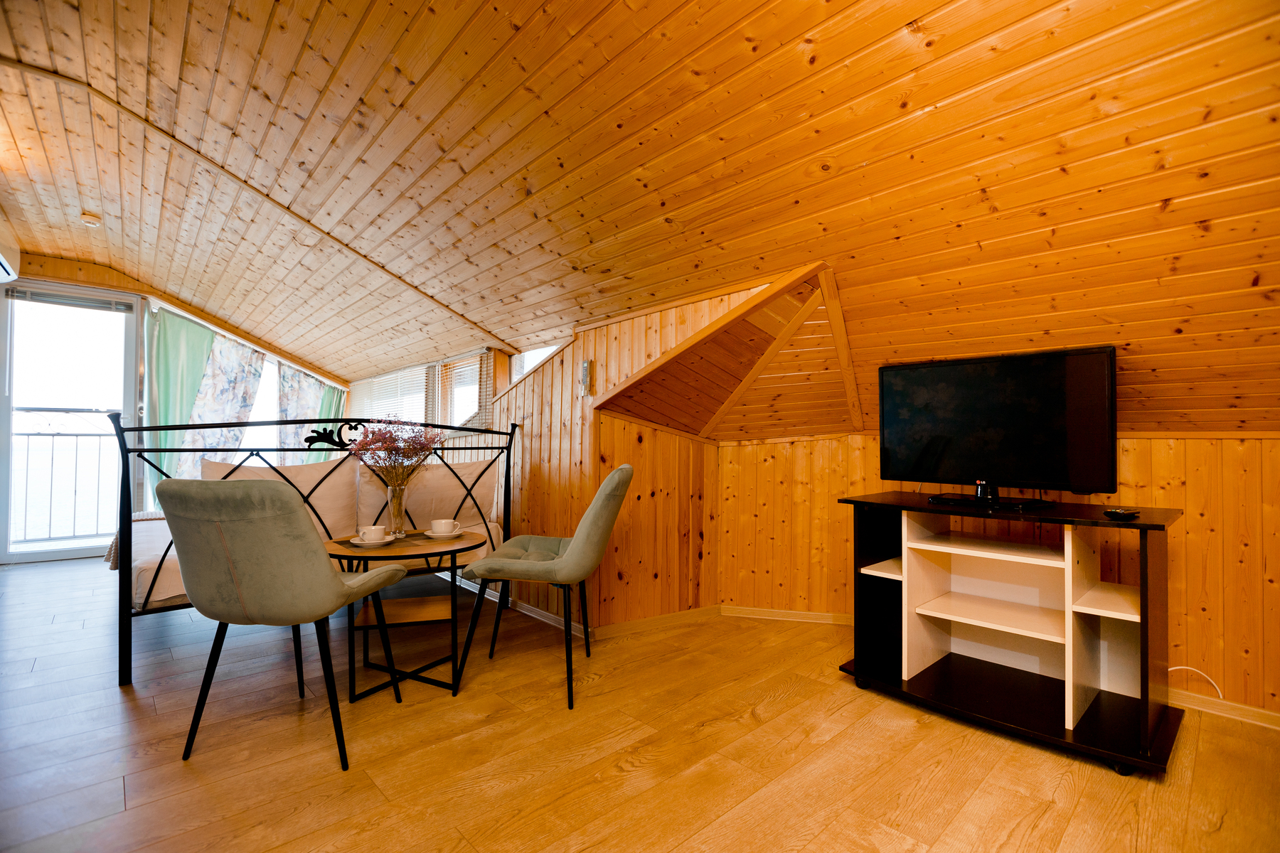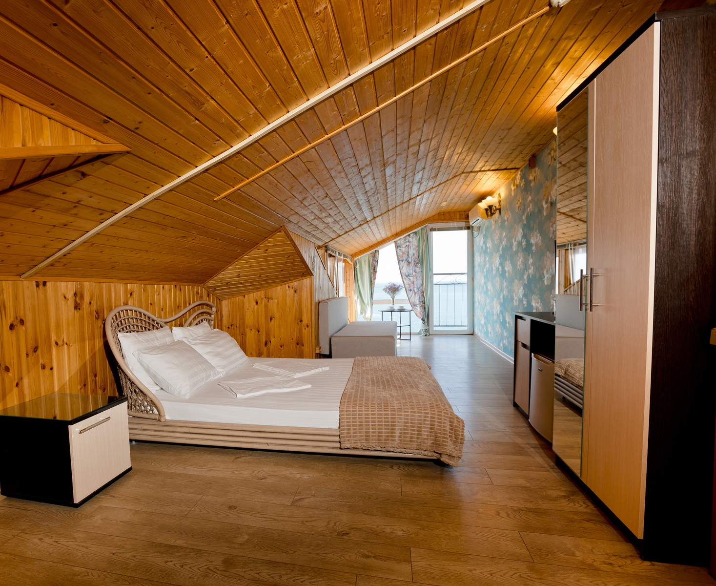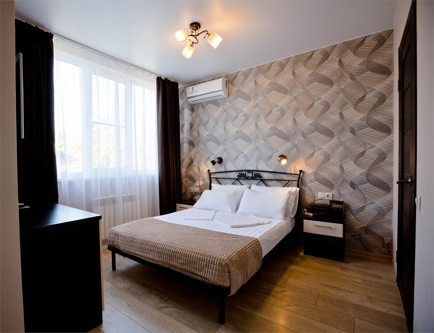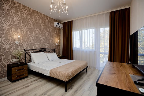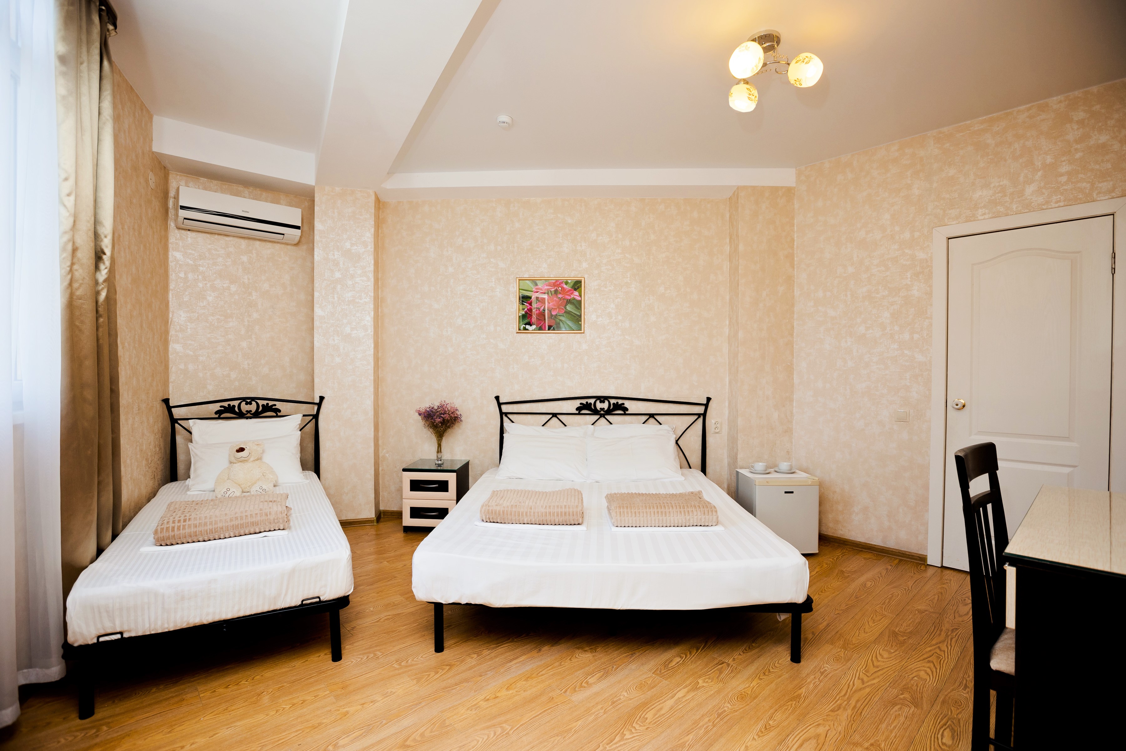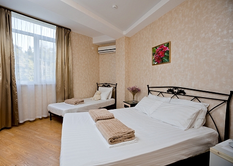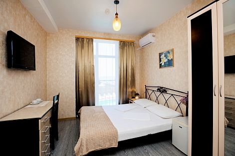 В номере: зеркало, кровать двуспальная, кровать односпальная, прикроватная тумбочка, стол, стул, шкаф, кондиционер, мини-холодильник, сейф, телевизор ЖК