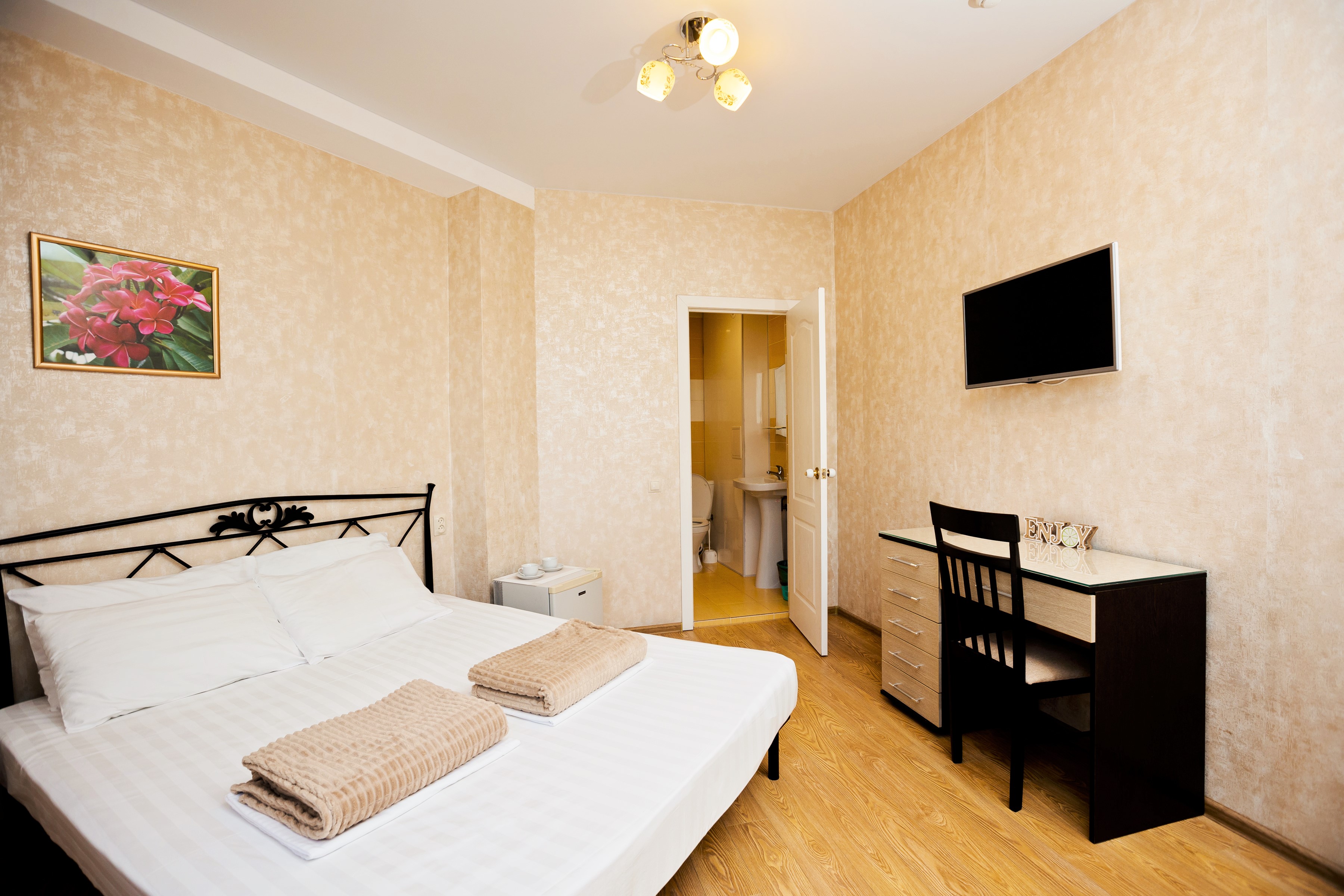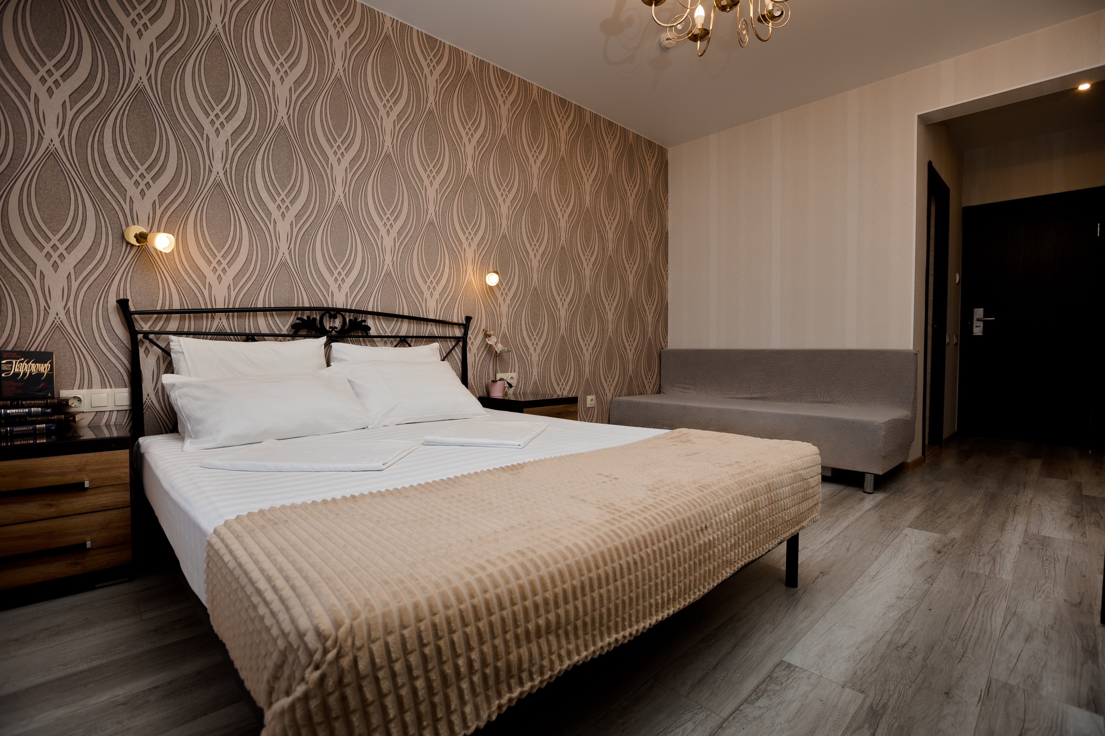 В номере: вешалка, диван раскладной, зеркало, кровать двуспальная, прикроватные тумбочки, стол, стул, шкаф, кондиционер, мини-холодильник, сейф, телевизор ЖК