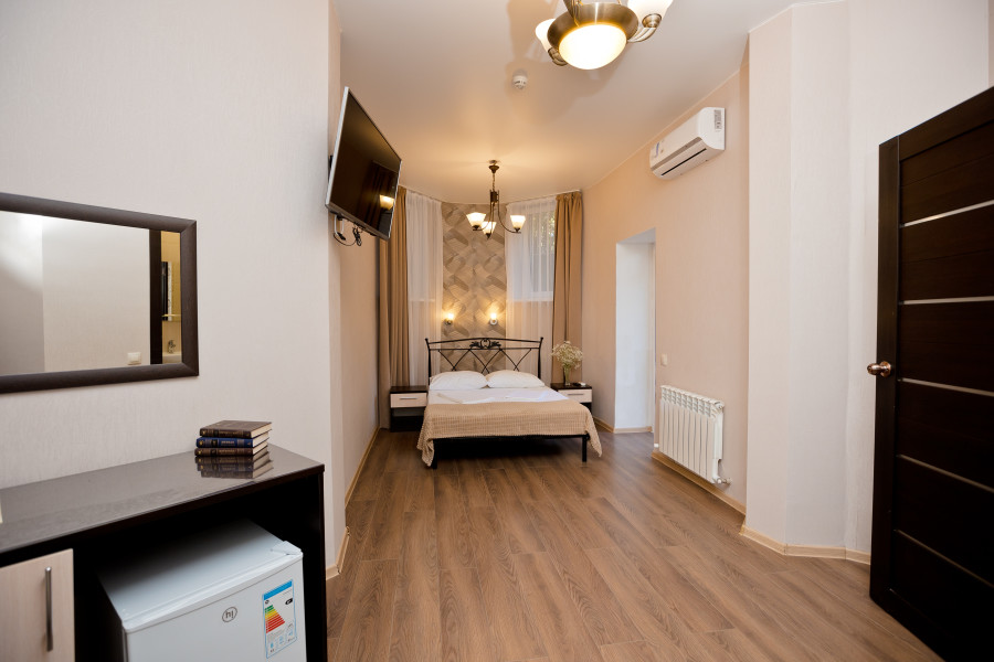 В номере: диван, зеркало, кровать двуспальная, прикроватные тумбочки, стол, стулья, тумба под телевизор, шкаф, кондиционер, мини-холодильник, сейф, телевизор
