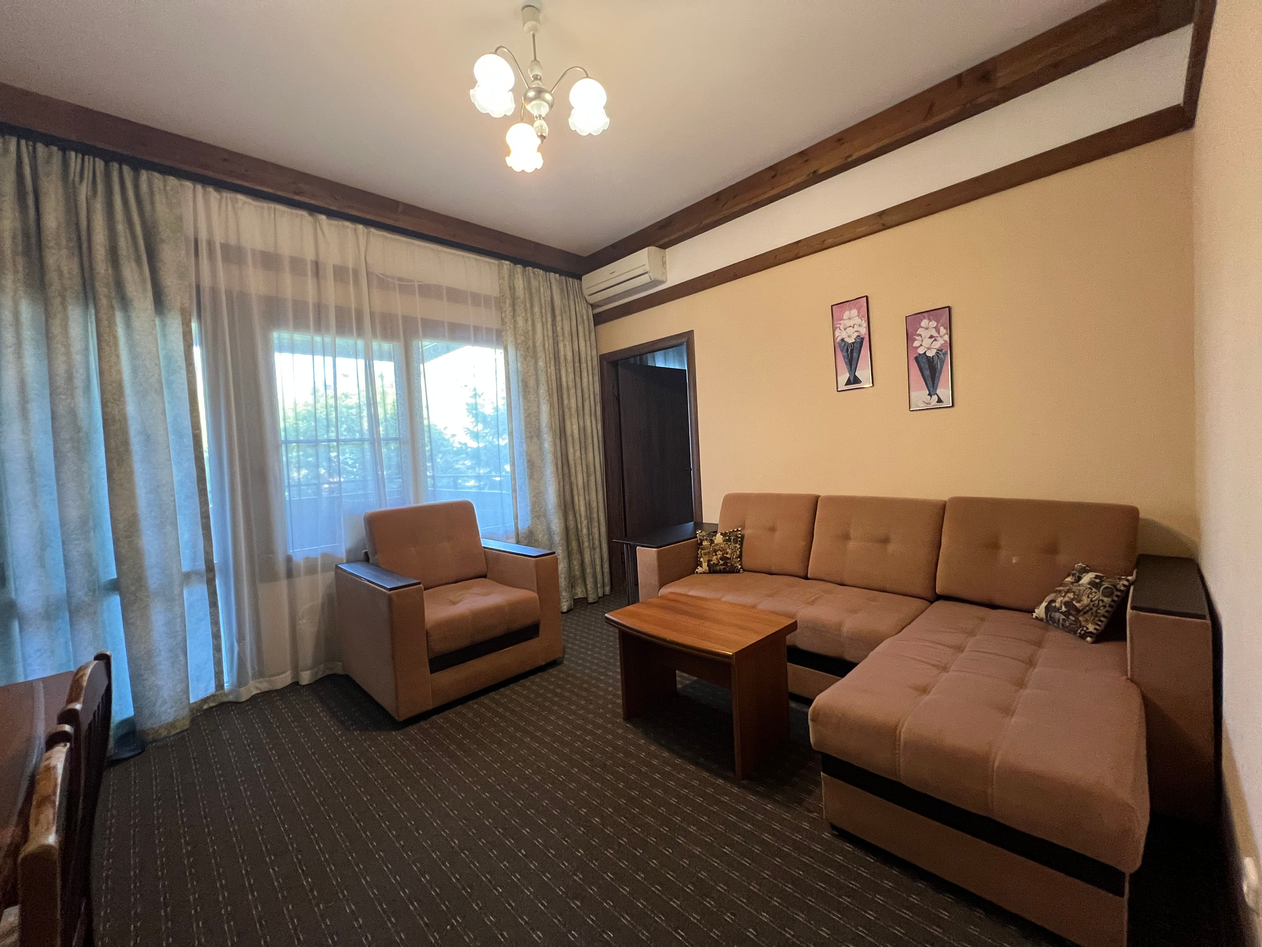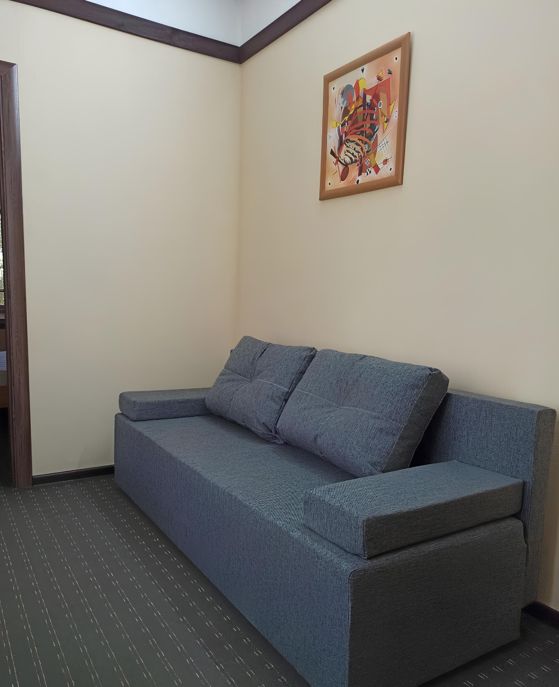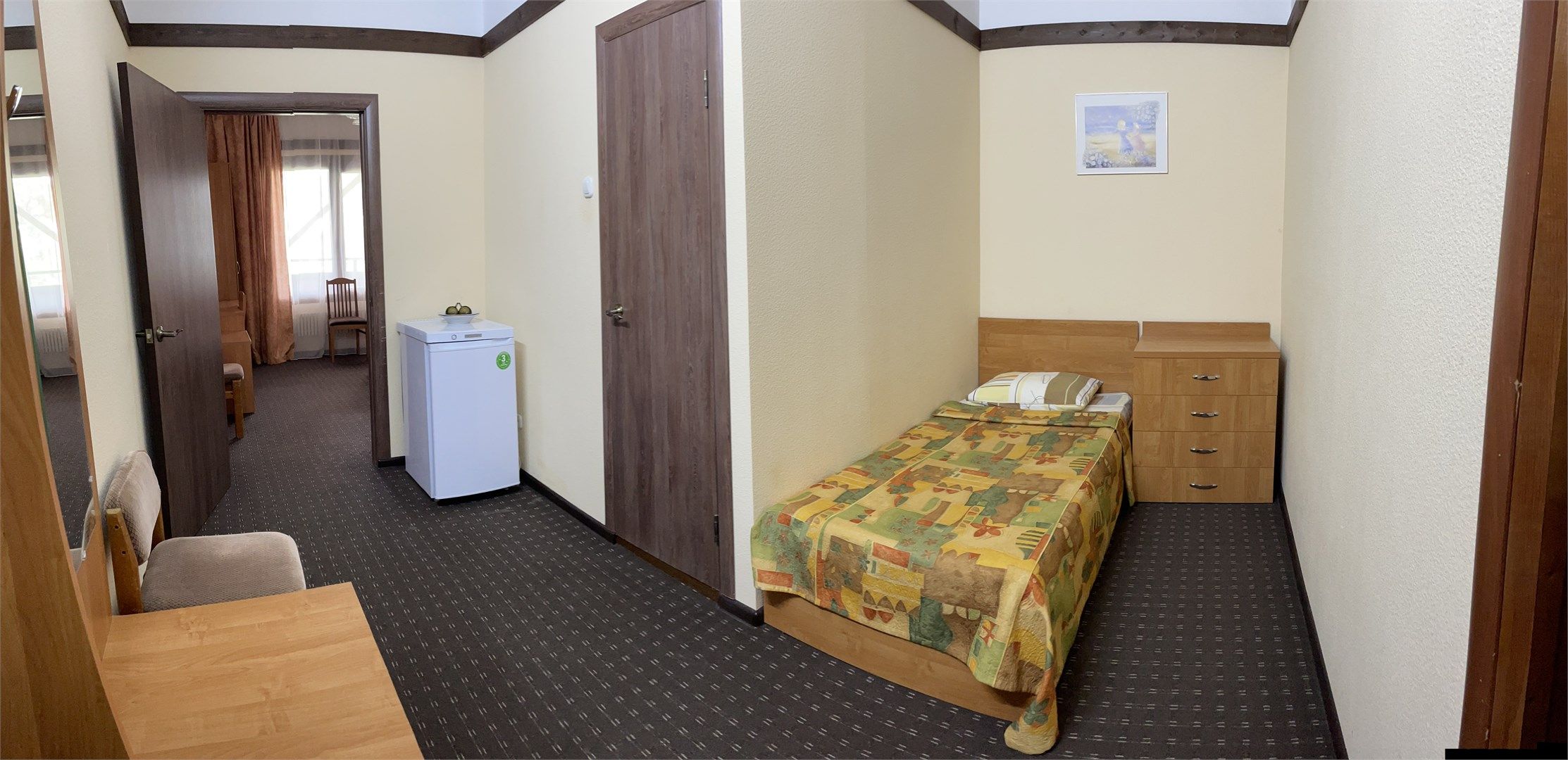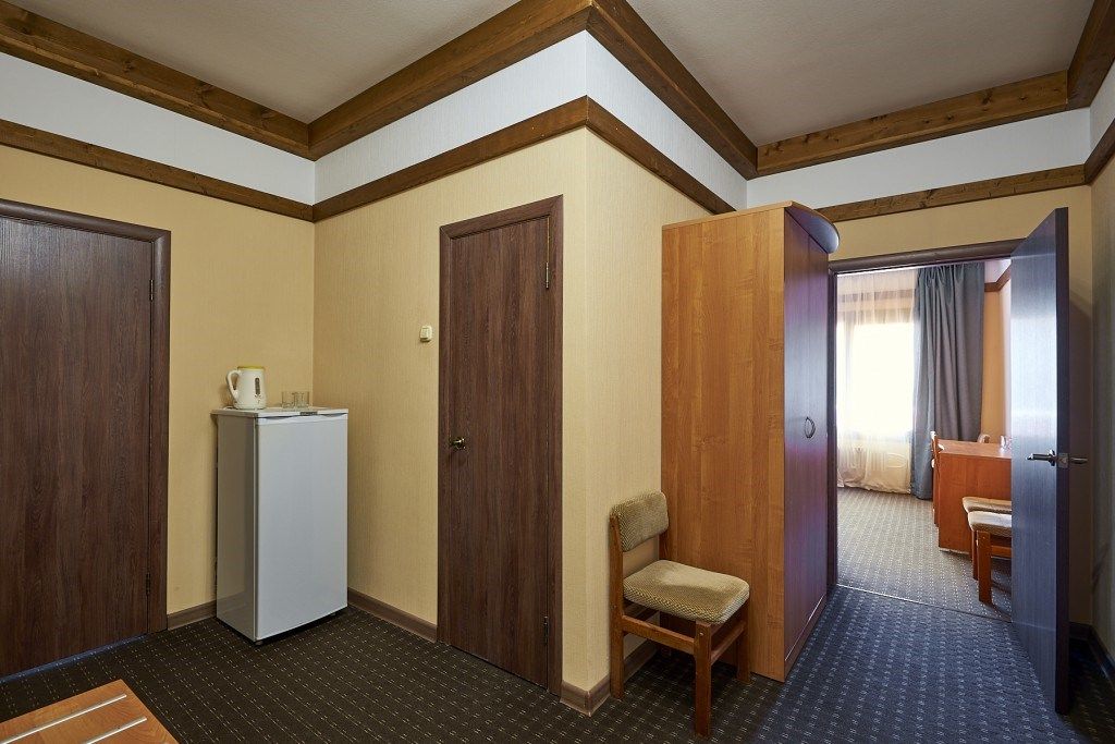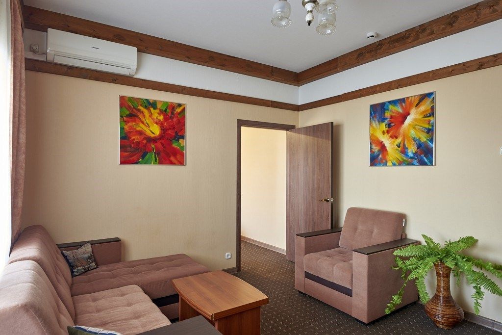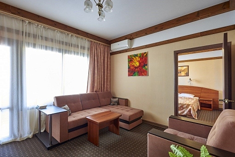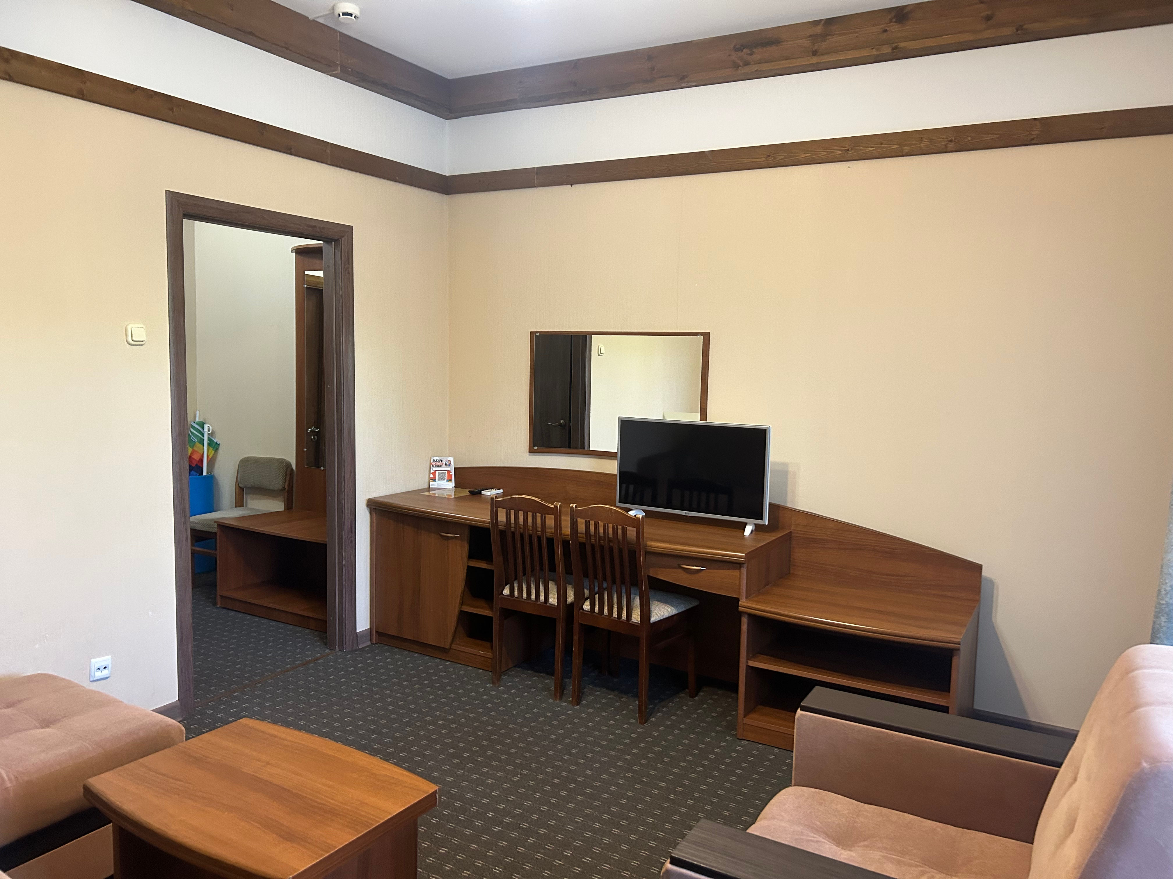 В номере: вешалка, диван раскладной, зеркало, кровать двуспальная, прикроватные тумбочки, стол, стулья, шкаф, кондиционер, телевизор ЖК, холодильник, чайный набор посуды