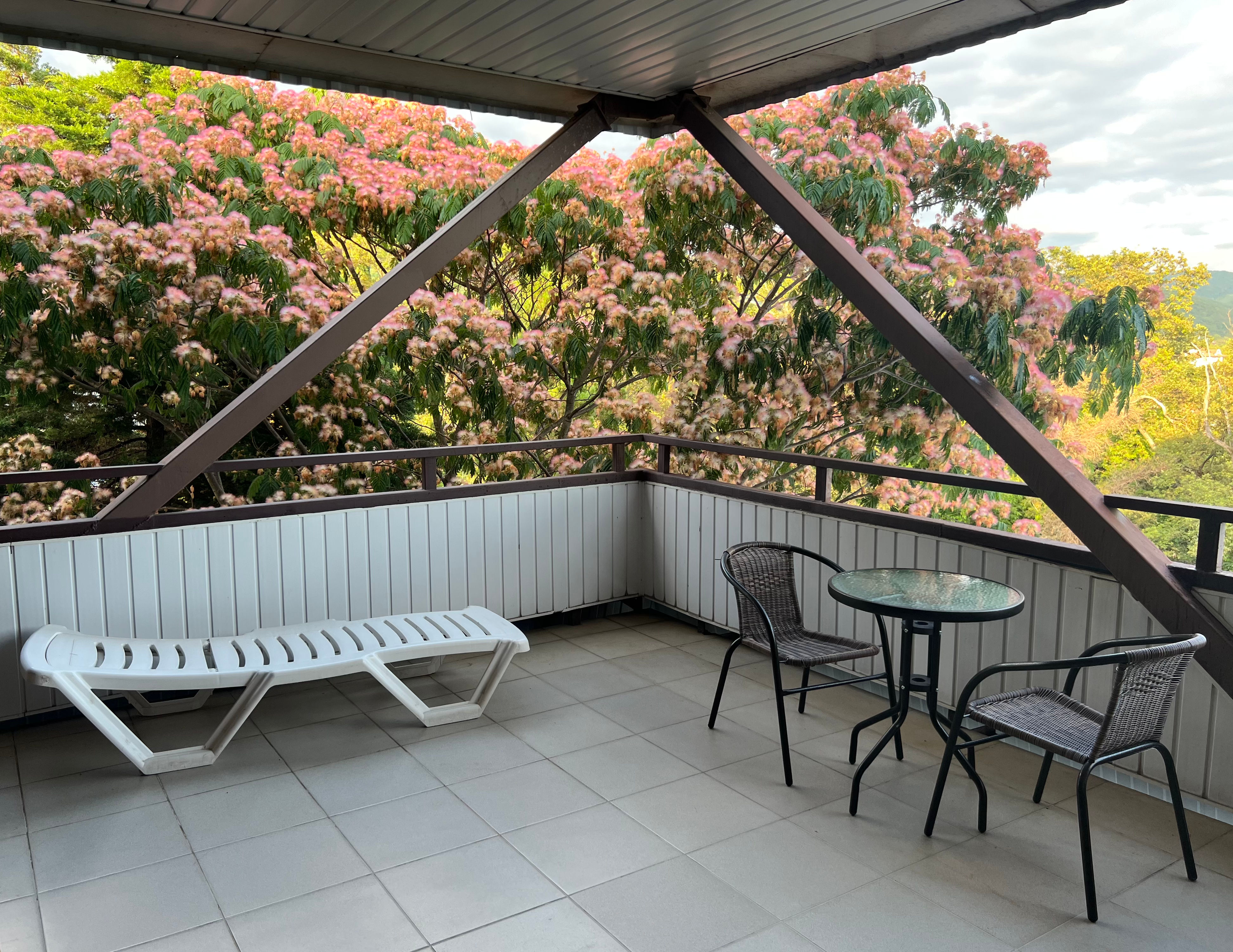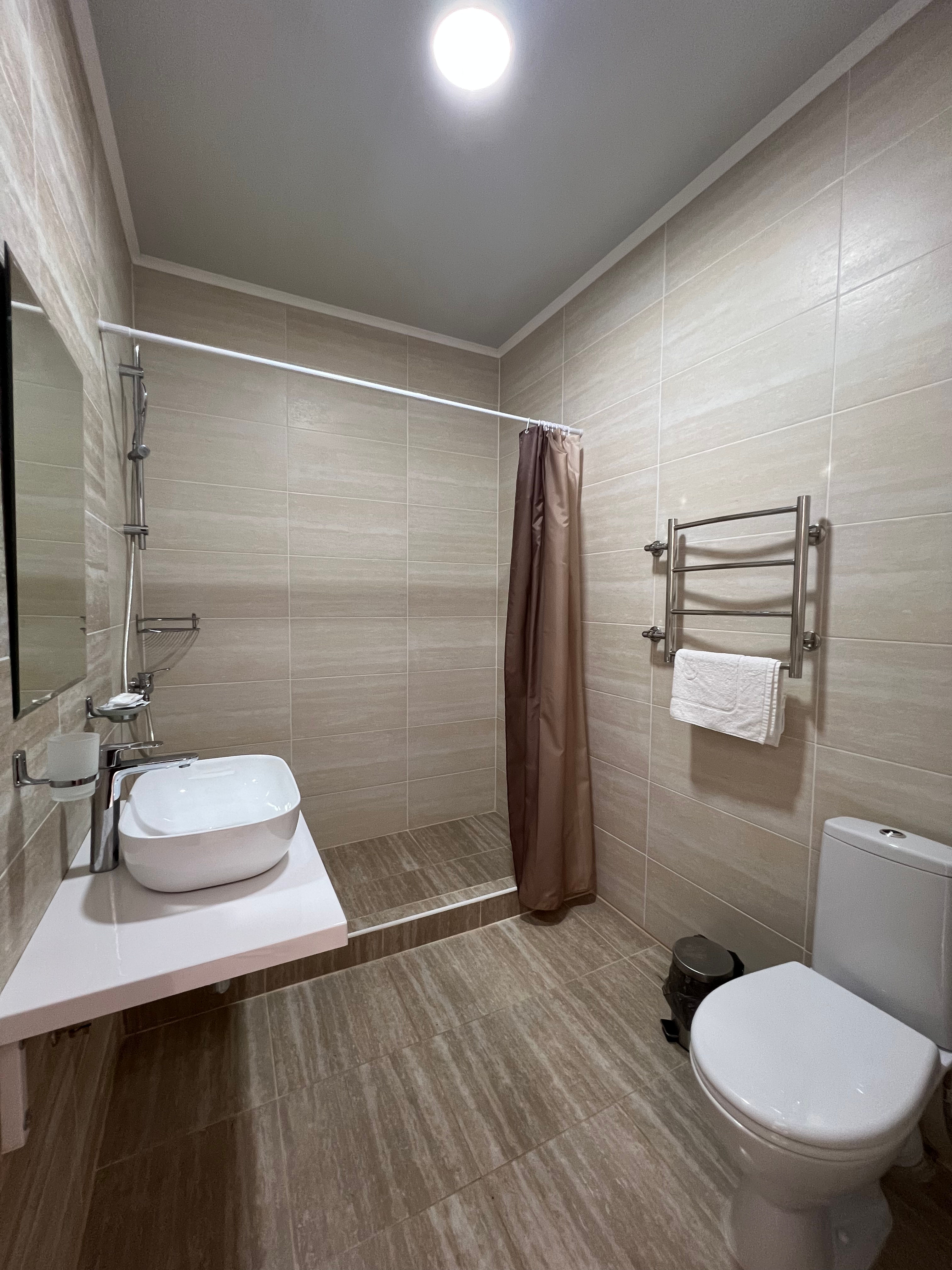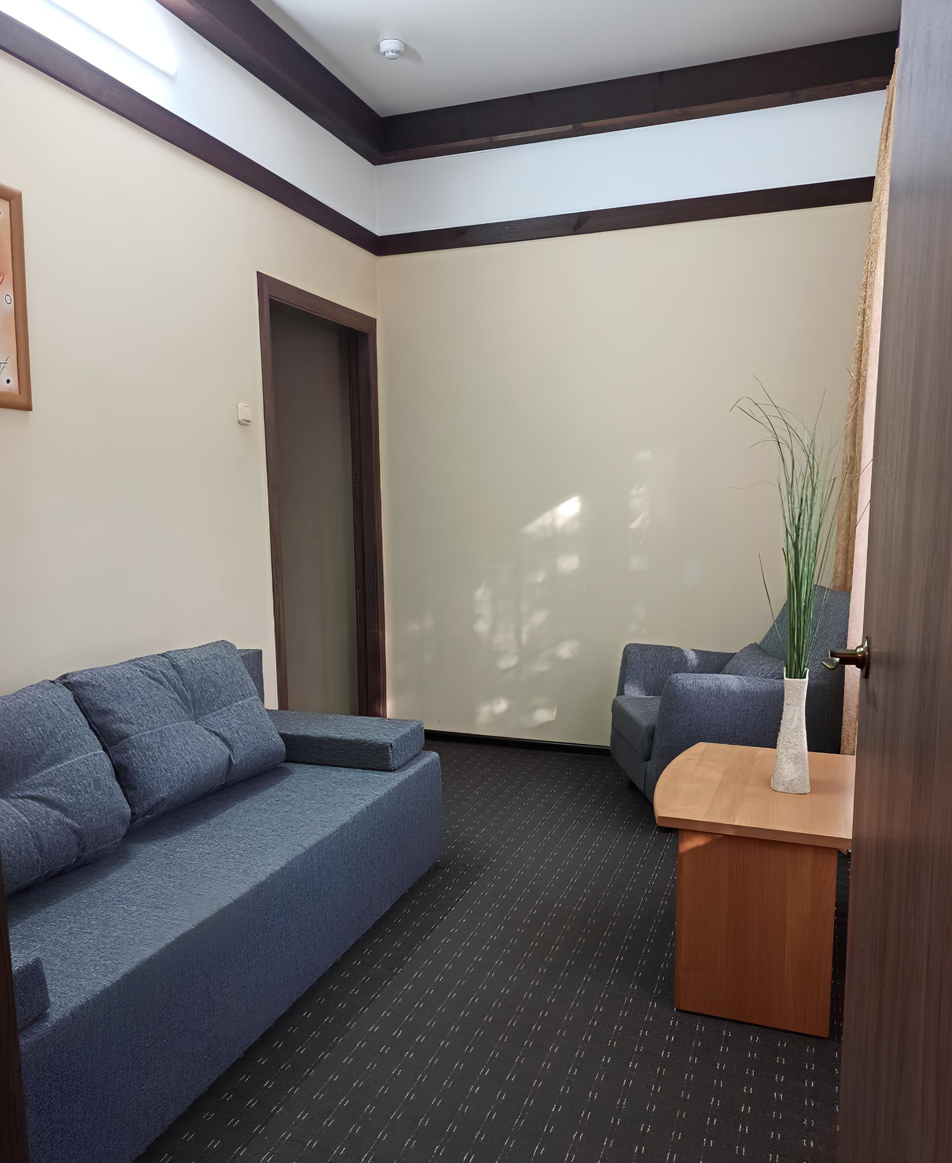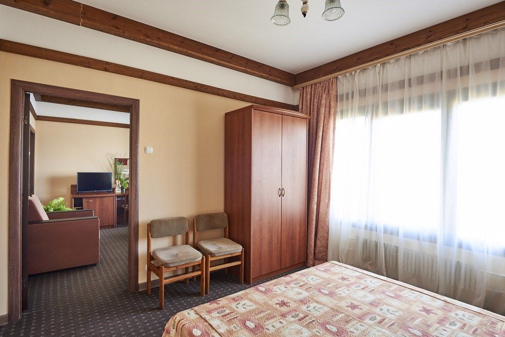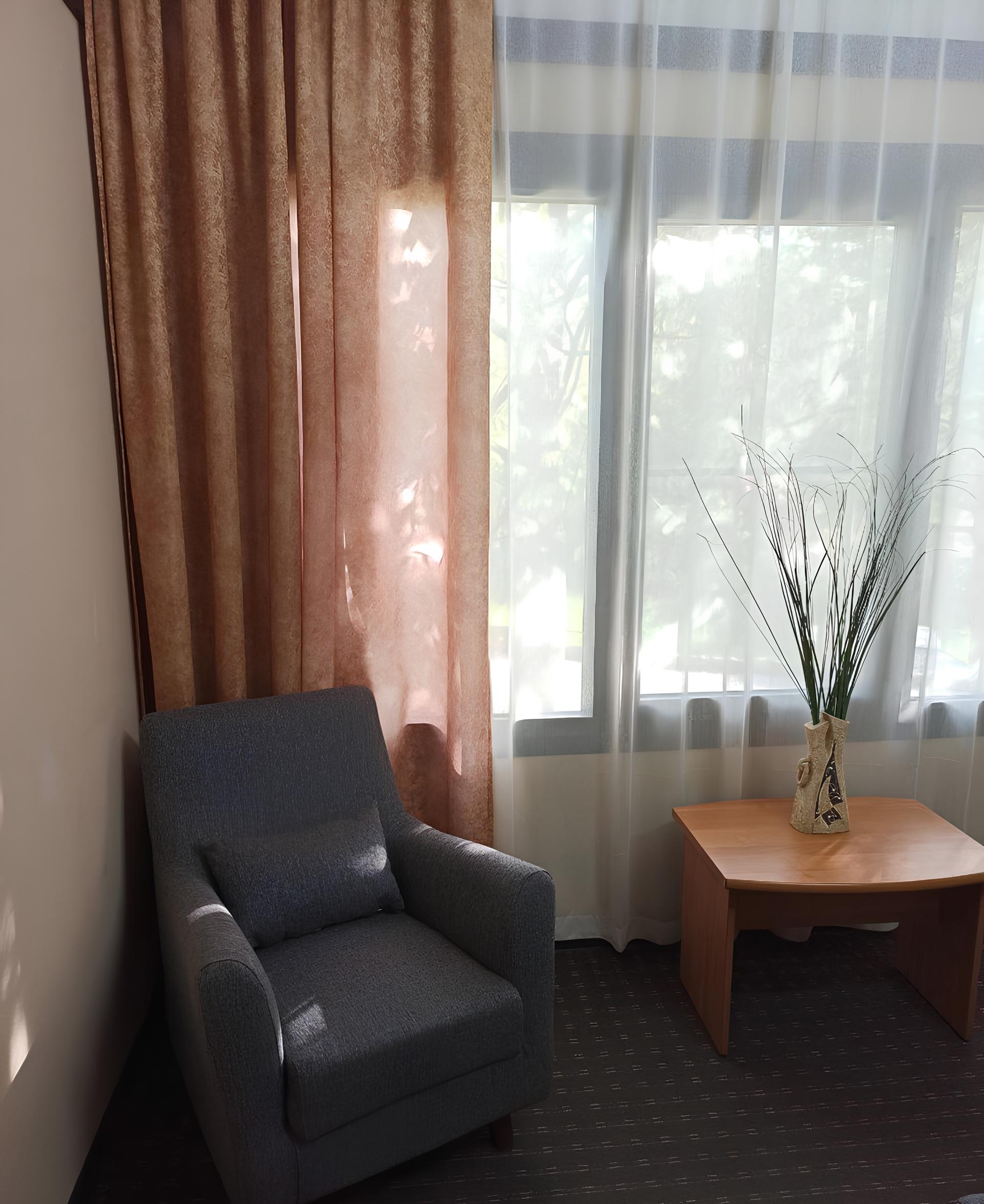В номере: вешалка, диван раскладной, зеркало, кровать двуспальная, прикроватные тумбочки, стол, стулья, шкаф, кондиционер, телевизор ЖК, холодильник, чайный набор посуды