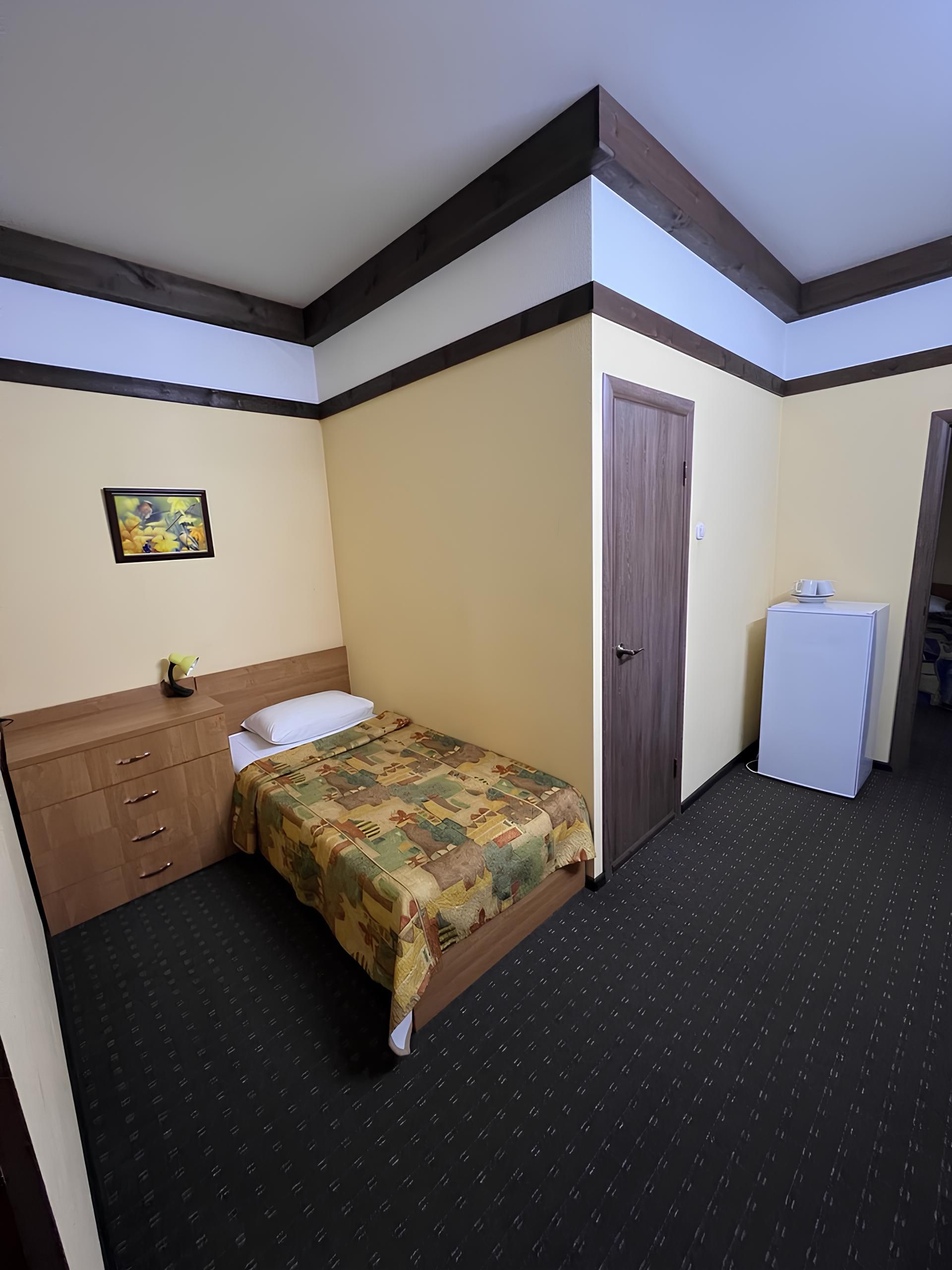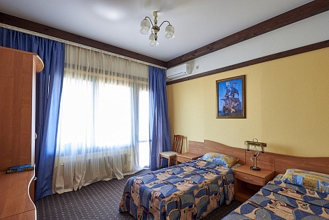 В номере: вешалка, зеркало, кровати односпальные, прикроватные тумбочки, стол, стулья, шкаф, кондиционер, мини-холодильник, телевизор ЖК, чайный набор посуды