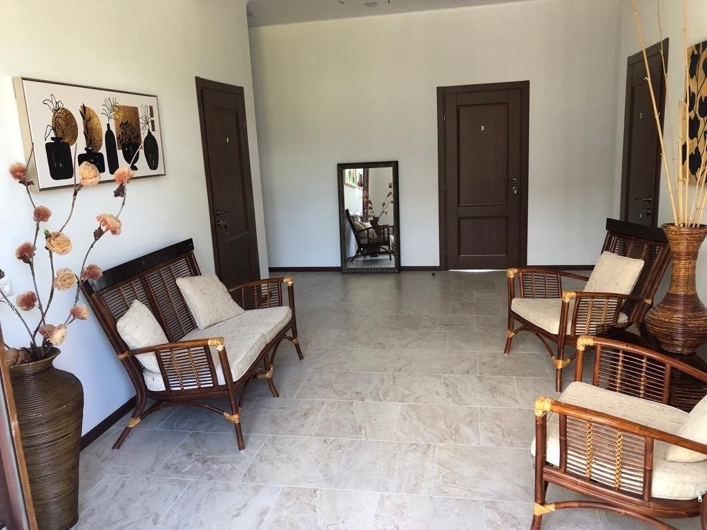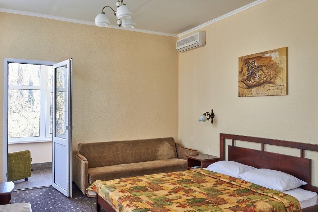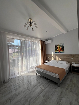 В номере: вешалка, диван раскладной, зеркало, кровати односпальные, кровать двуспальная, прикроватные тумбочки, стол, стулья, шкаф, кондиционер, телевизор ЖК, холодильник, чайный набор посуды