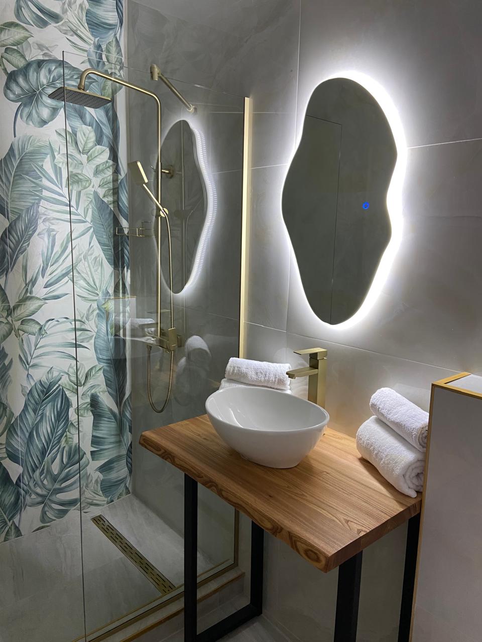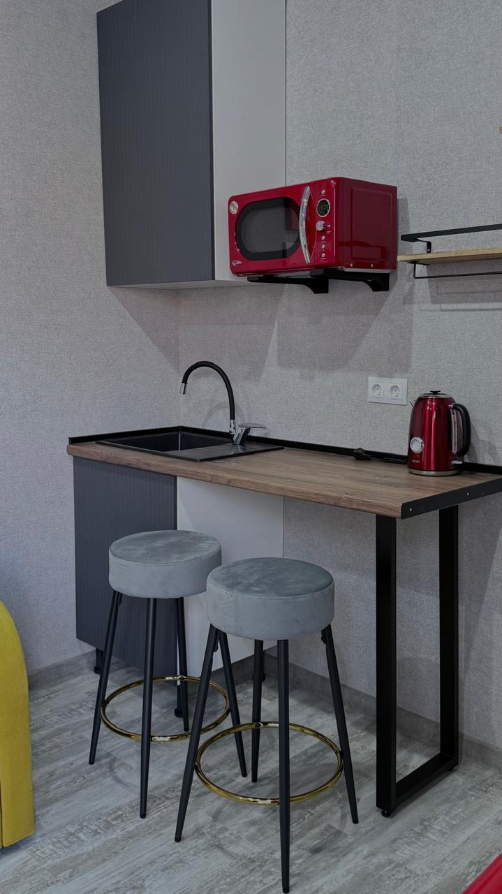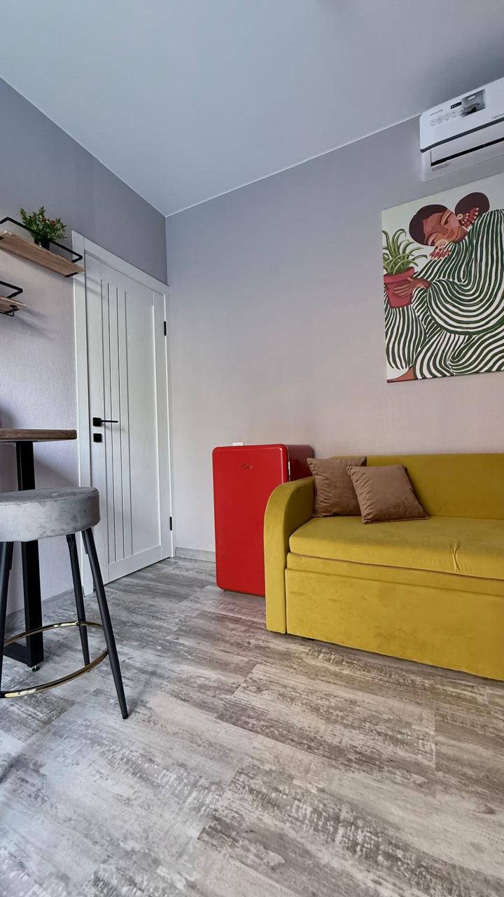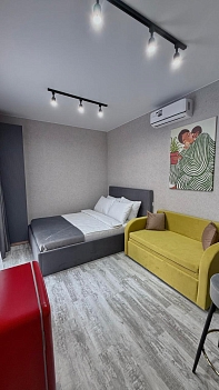 В номере: вешалка, диван раскладной, зеркало, кровать двуспальная, кухонная мебель, прикроватные тумбочки, стол обеденный, стулья, шкаф, кондиционер, микроволновая печь, мини-холодильник, телевизор, чайный набор посуды, электрочайник