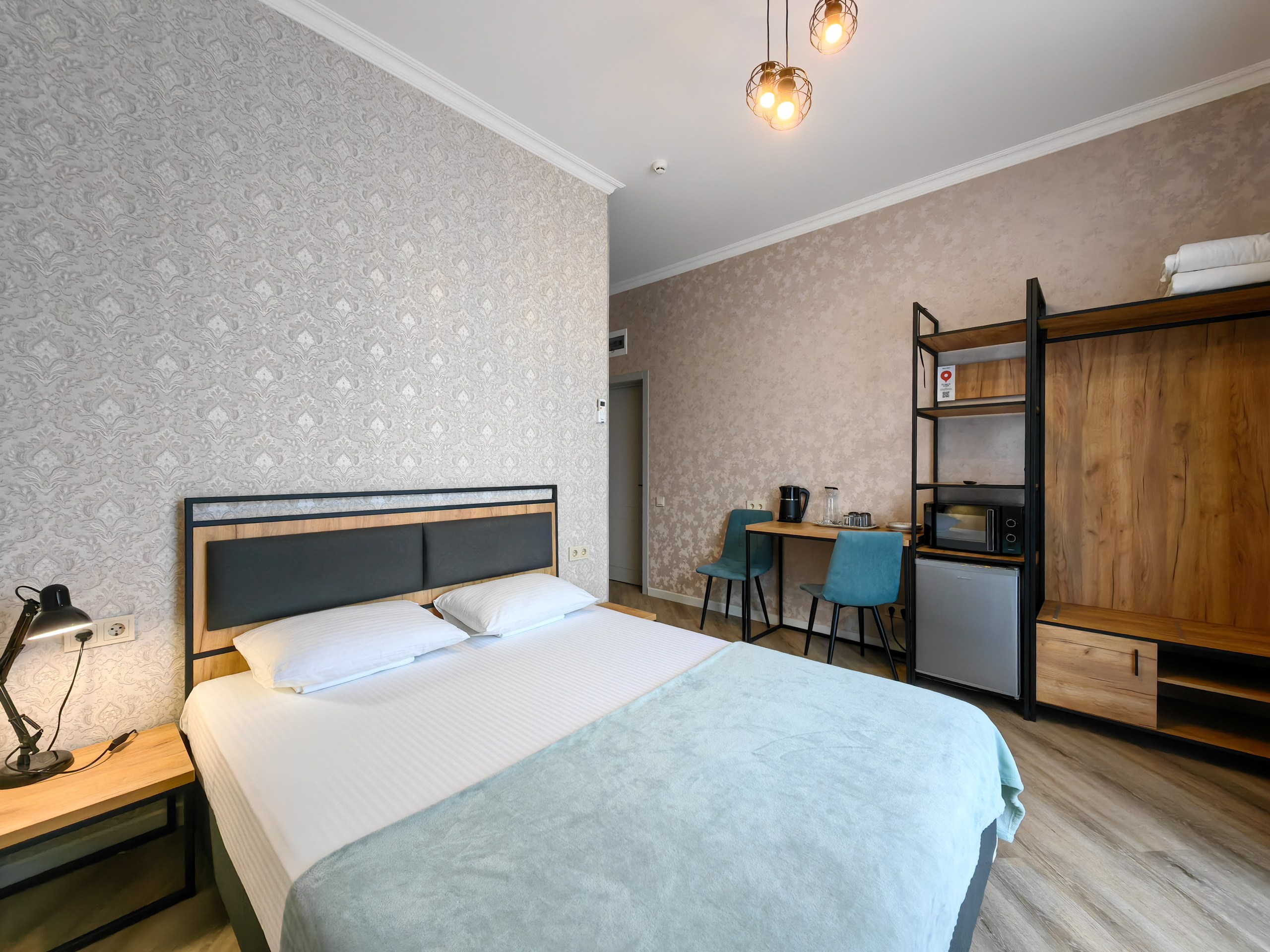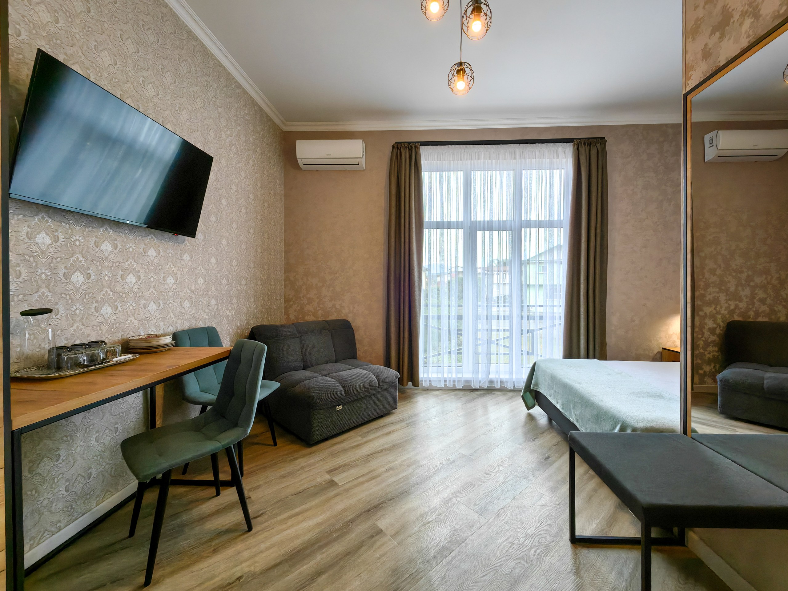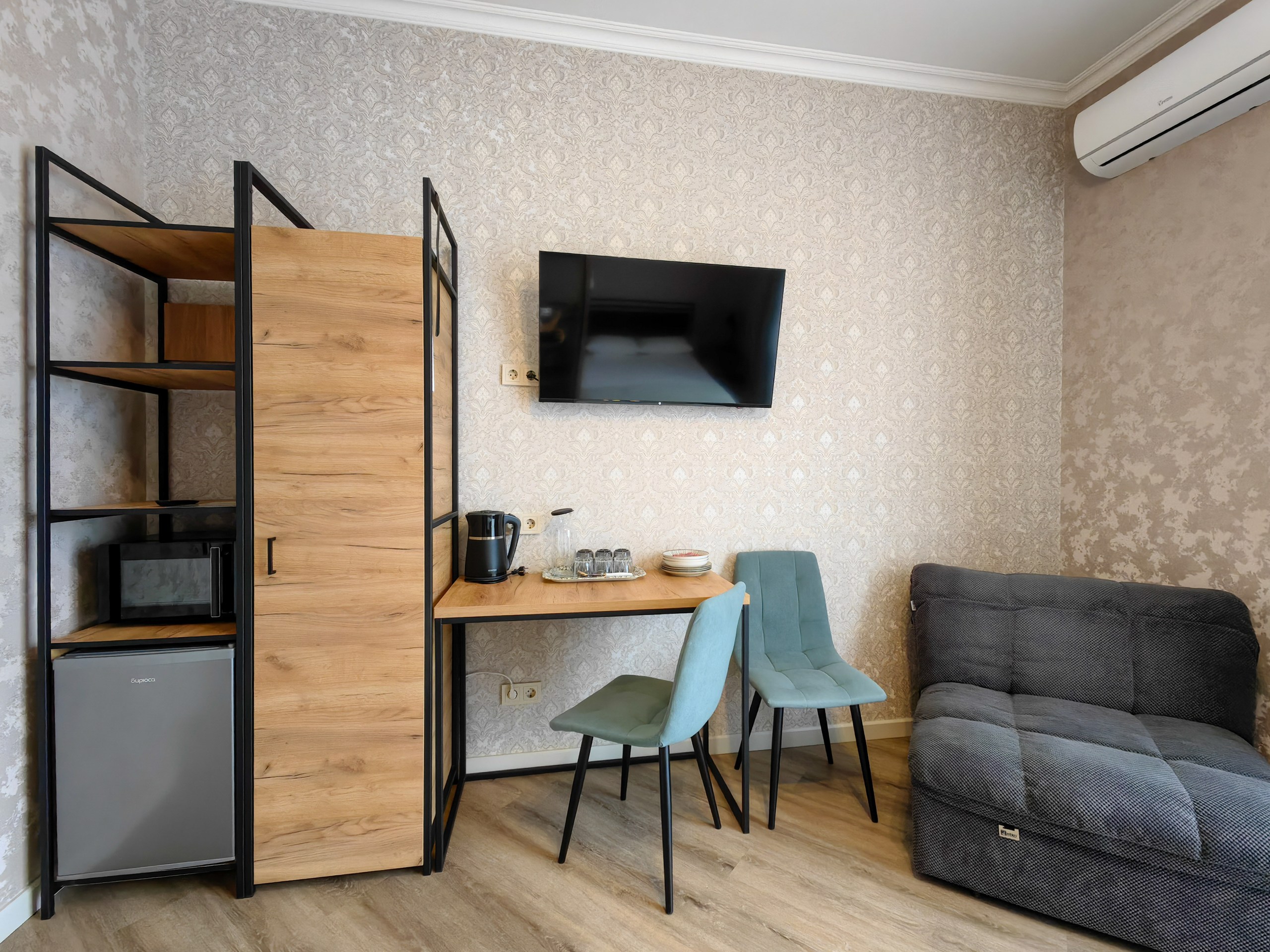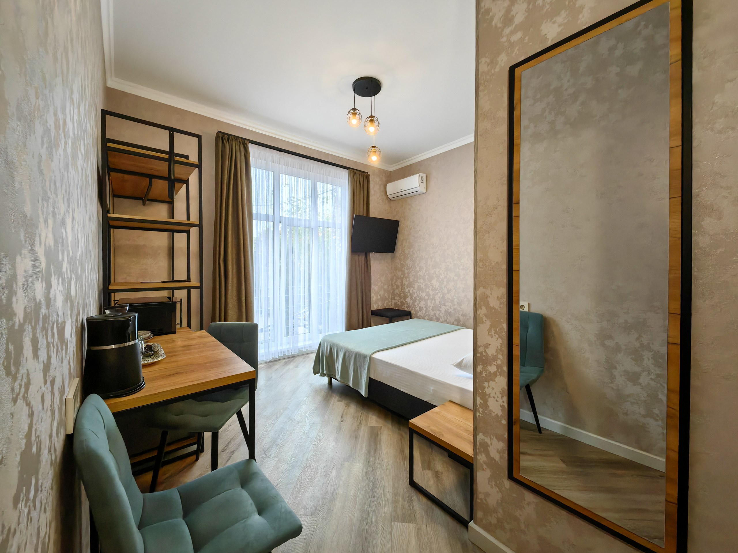 В номере: зеркало, кресло-кровать, кровать двуспальная, прикроватная тумбочка, стеллаж, стол, стулья, шкаф, кондиционер, микроволновая печь, мини-холодильник, набор посуды, телевизор ЖК, электрочайник