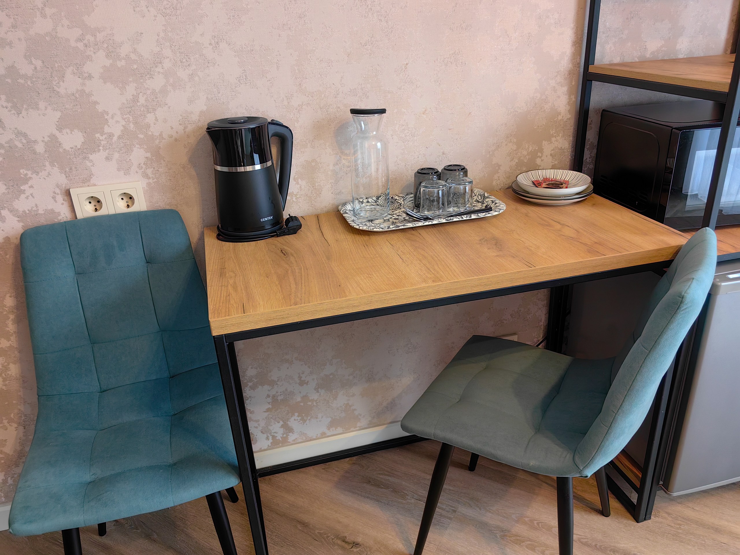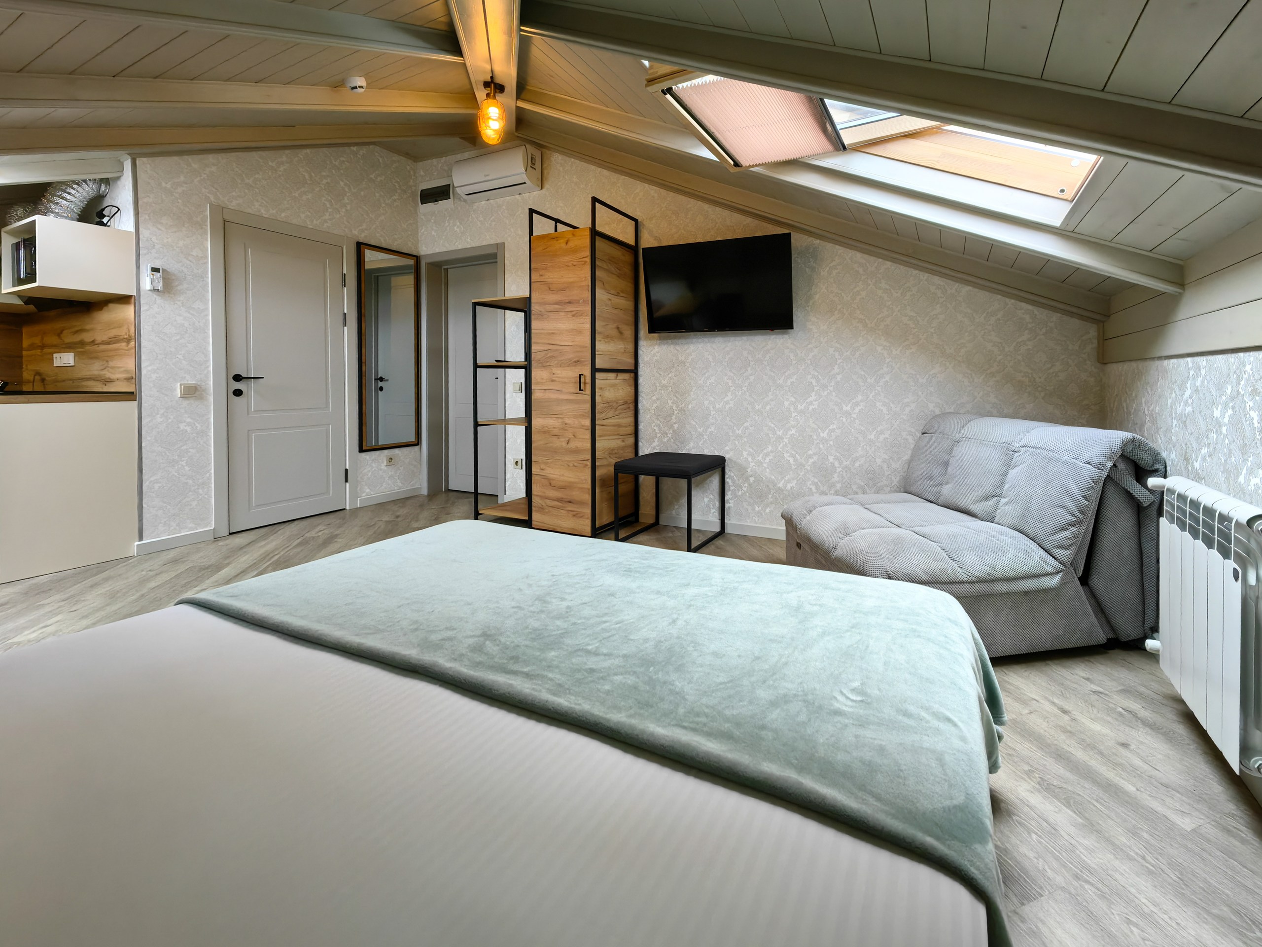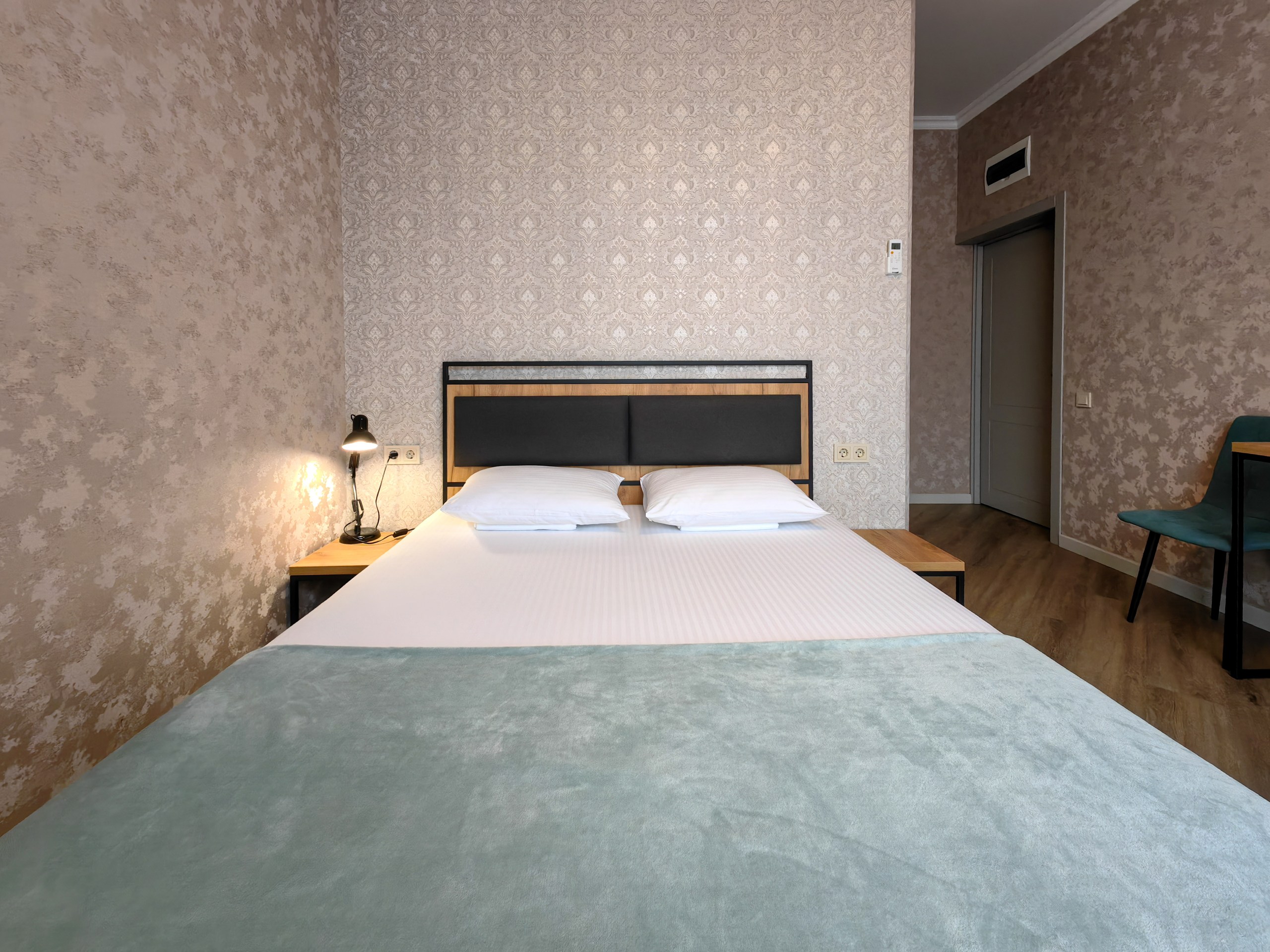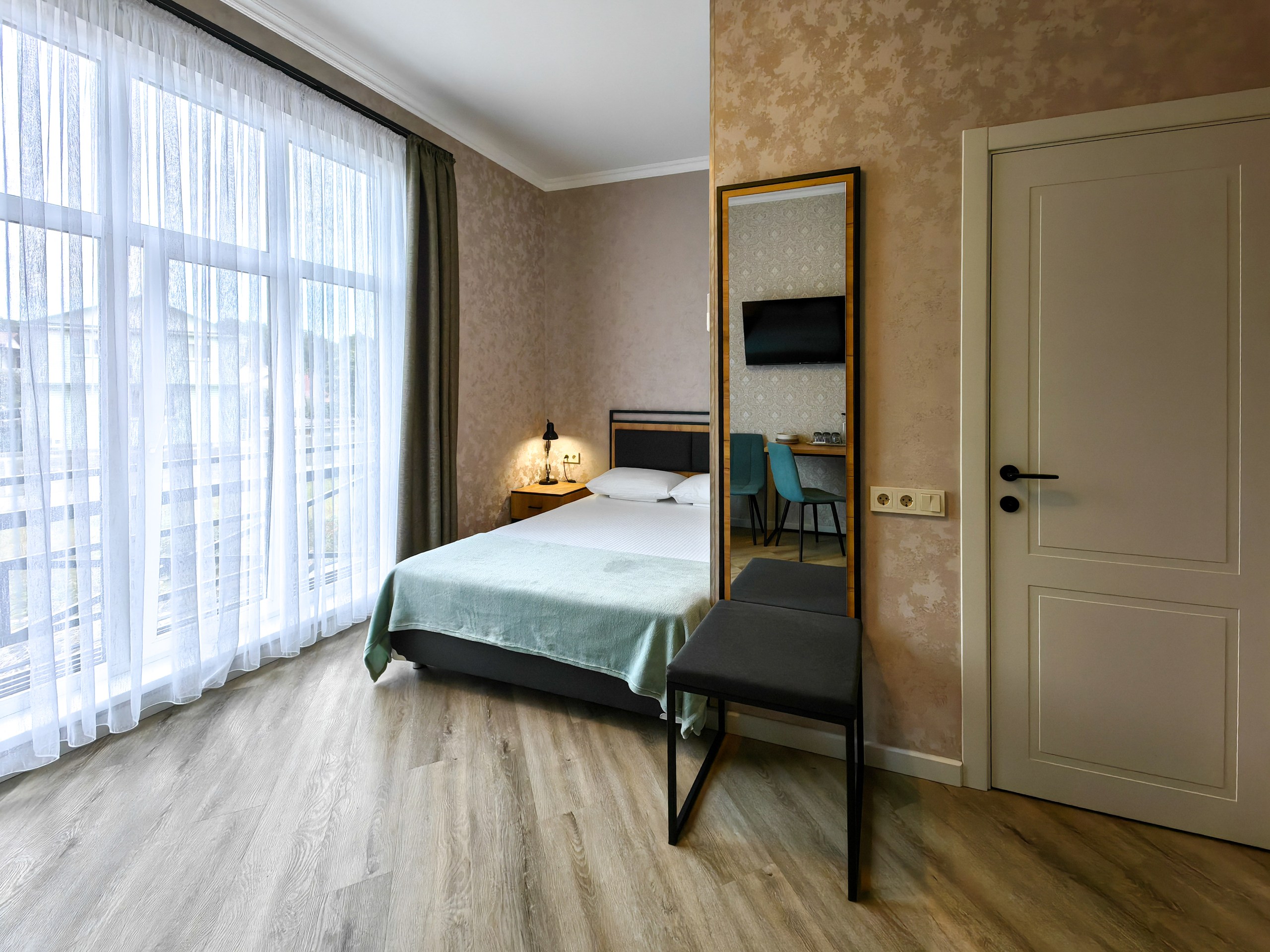 В номере: зеркало, кресло-кровать, кровать двуспальная, прикроватная тумбочка, стеллаж, стол, стулья, шкаф, кондиционер, микроволновая печь, мини-холодильник, набор посуды, телевизор ЖК, электрочайник
